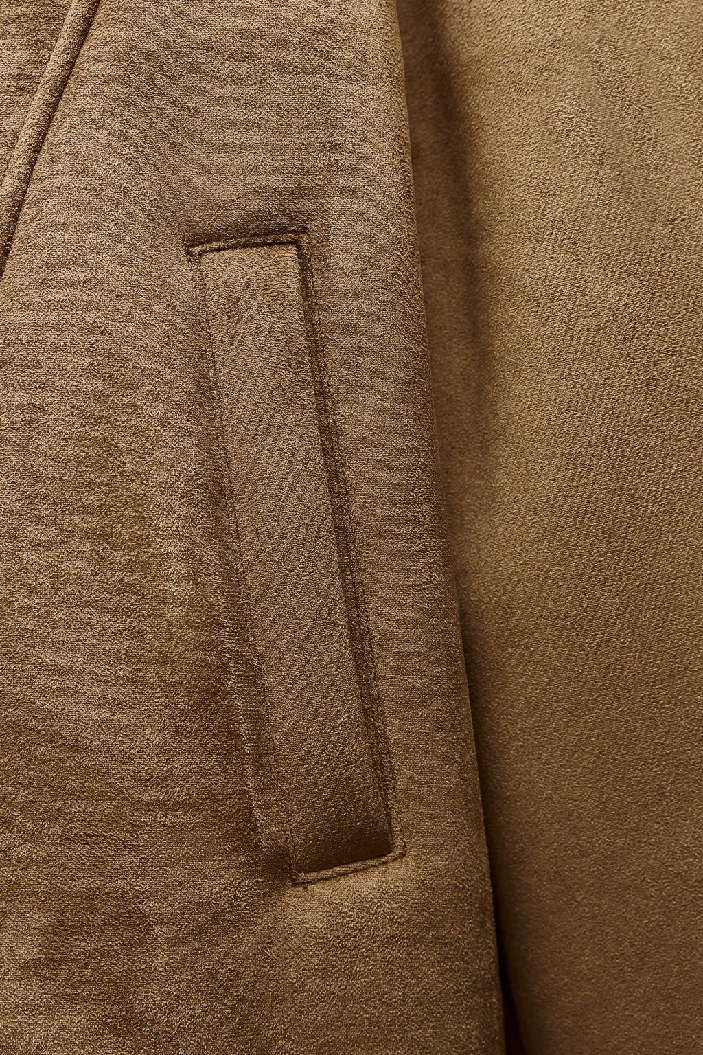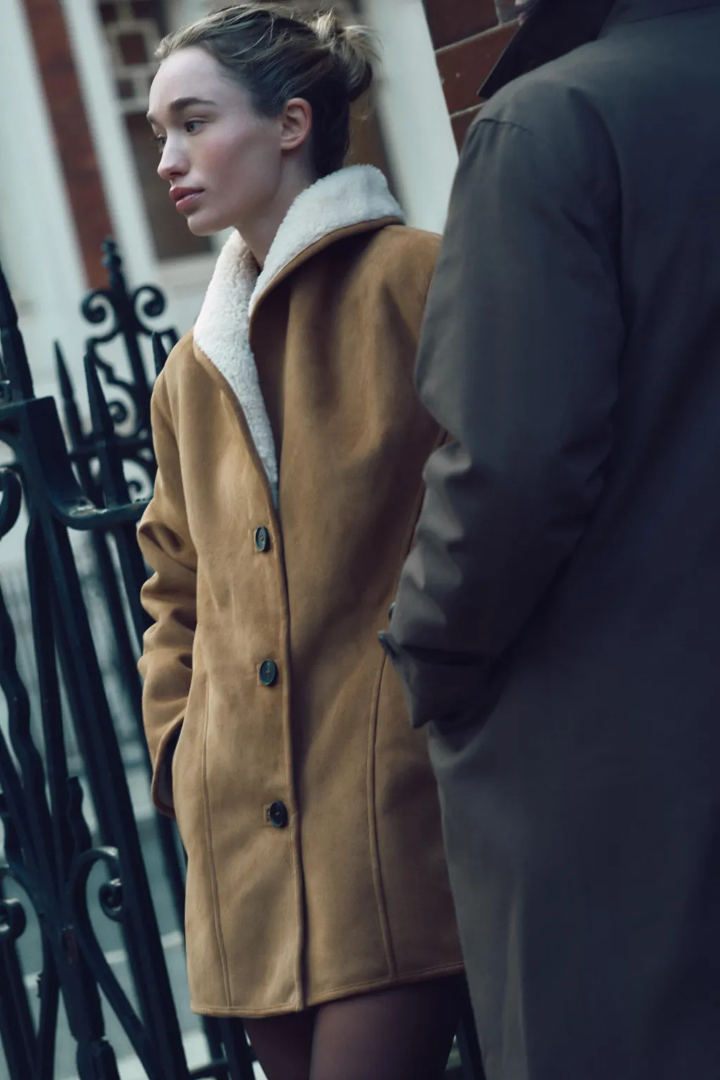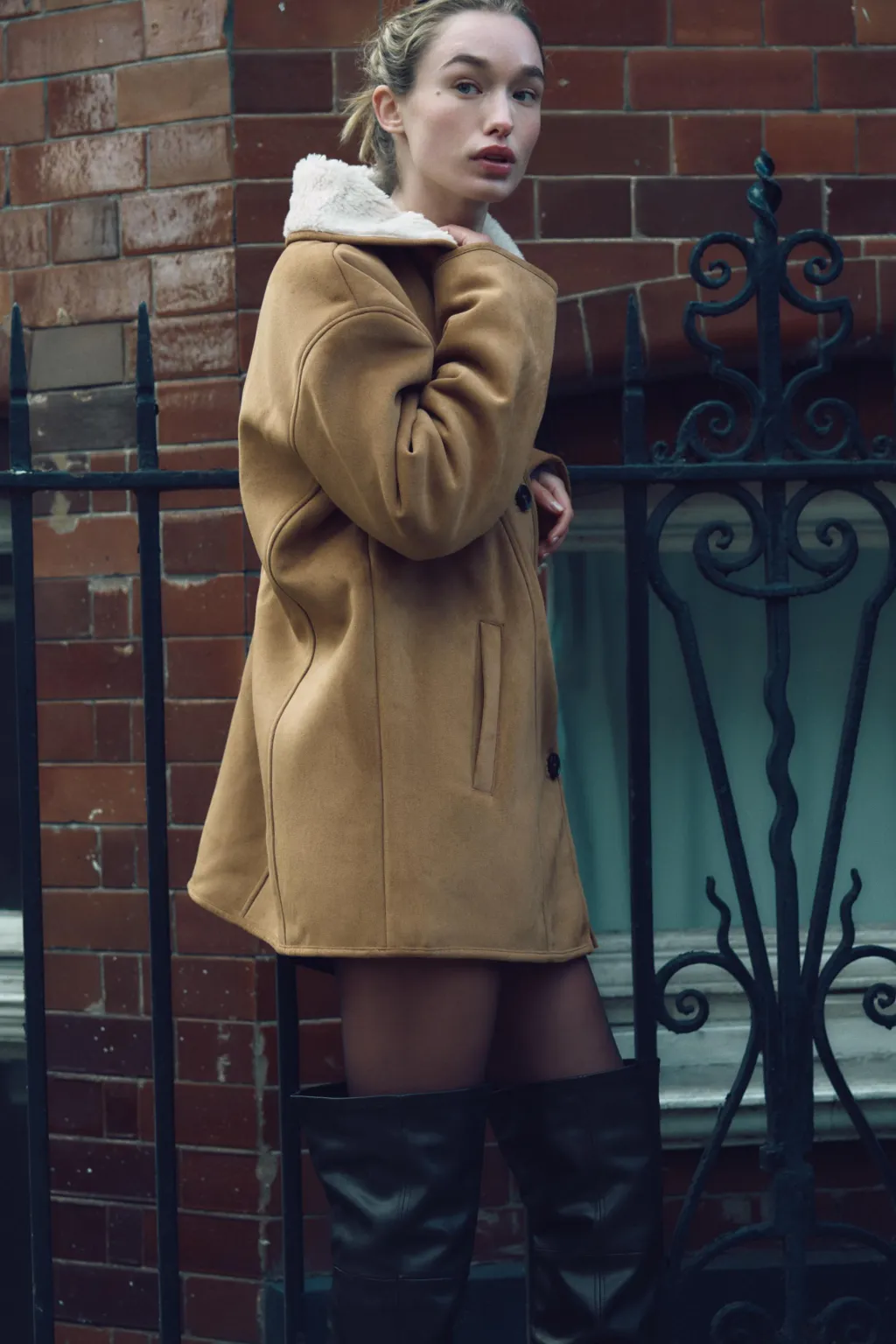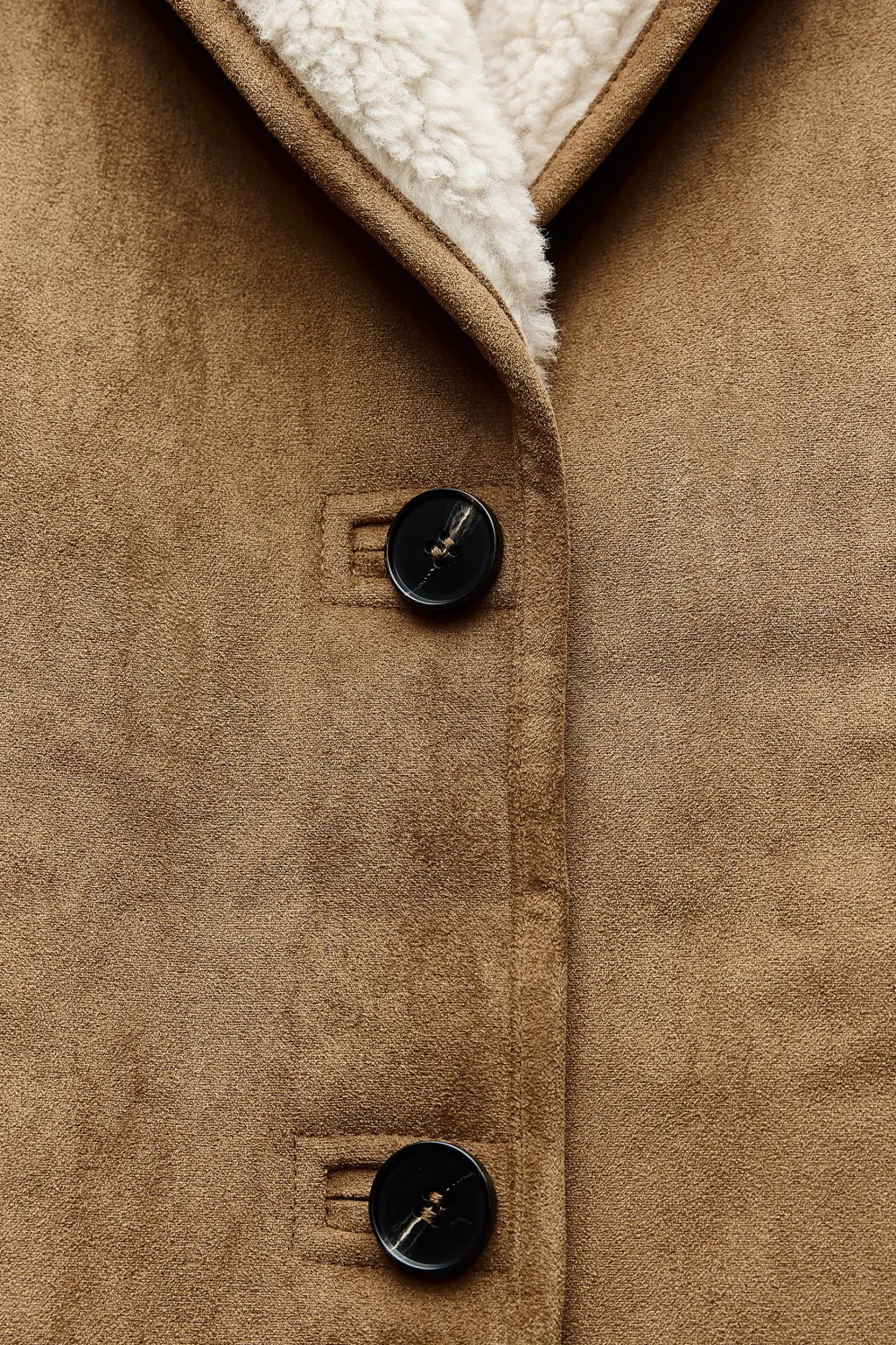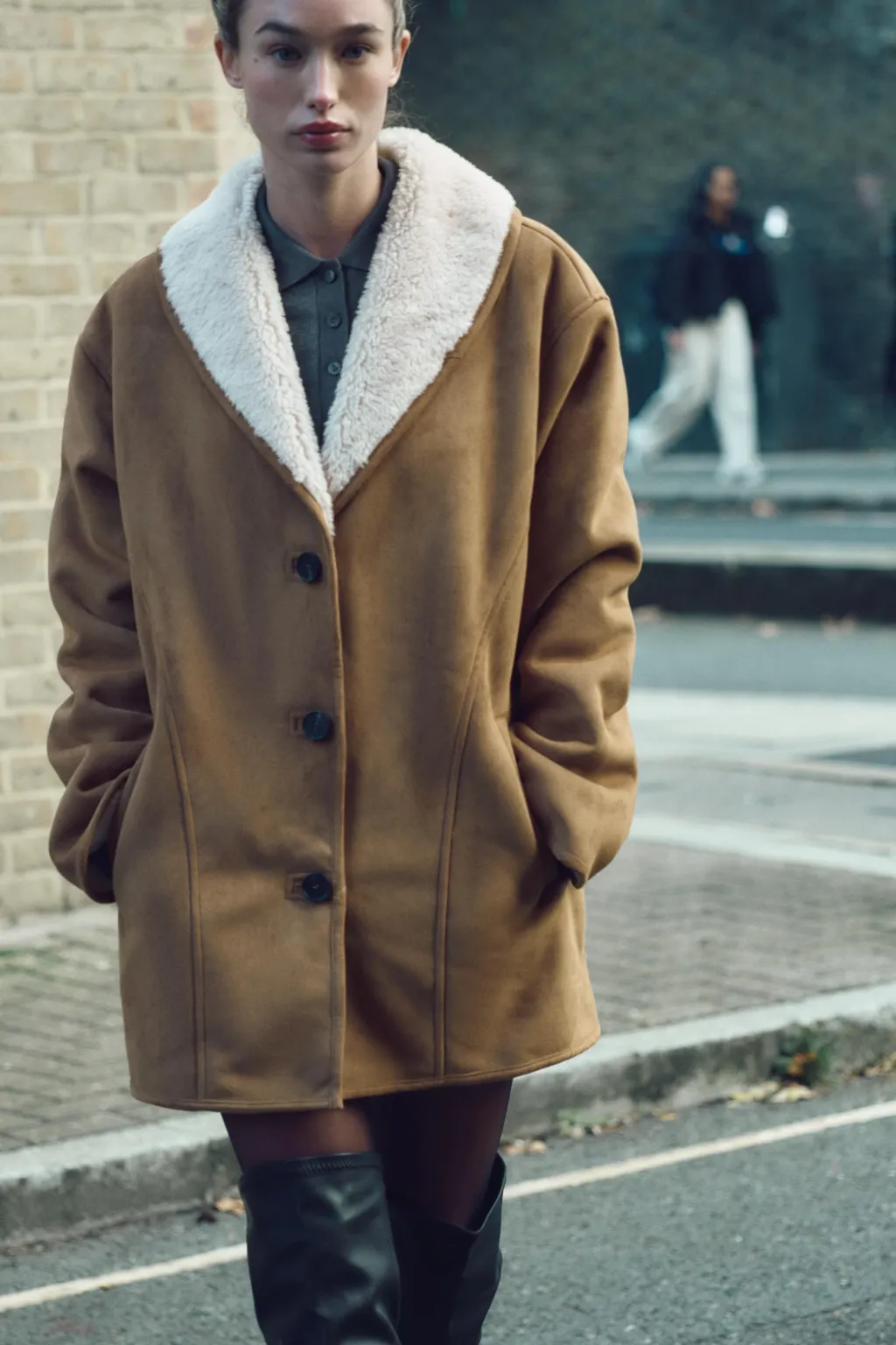 Abrigo de cuello solapa y manga larga. Bolsillos delanteros de vivo. Detalle de tejido interior combinado en borreguillo. Cierre frontal con botones.