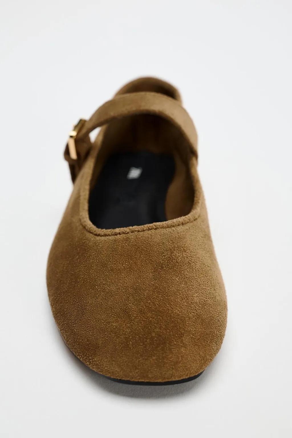 Zapato plano tipo bailarina en serraje. Escote redondo. Cierre mediante hebilla en el empeine.