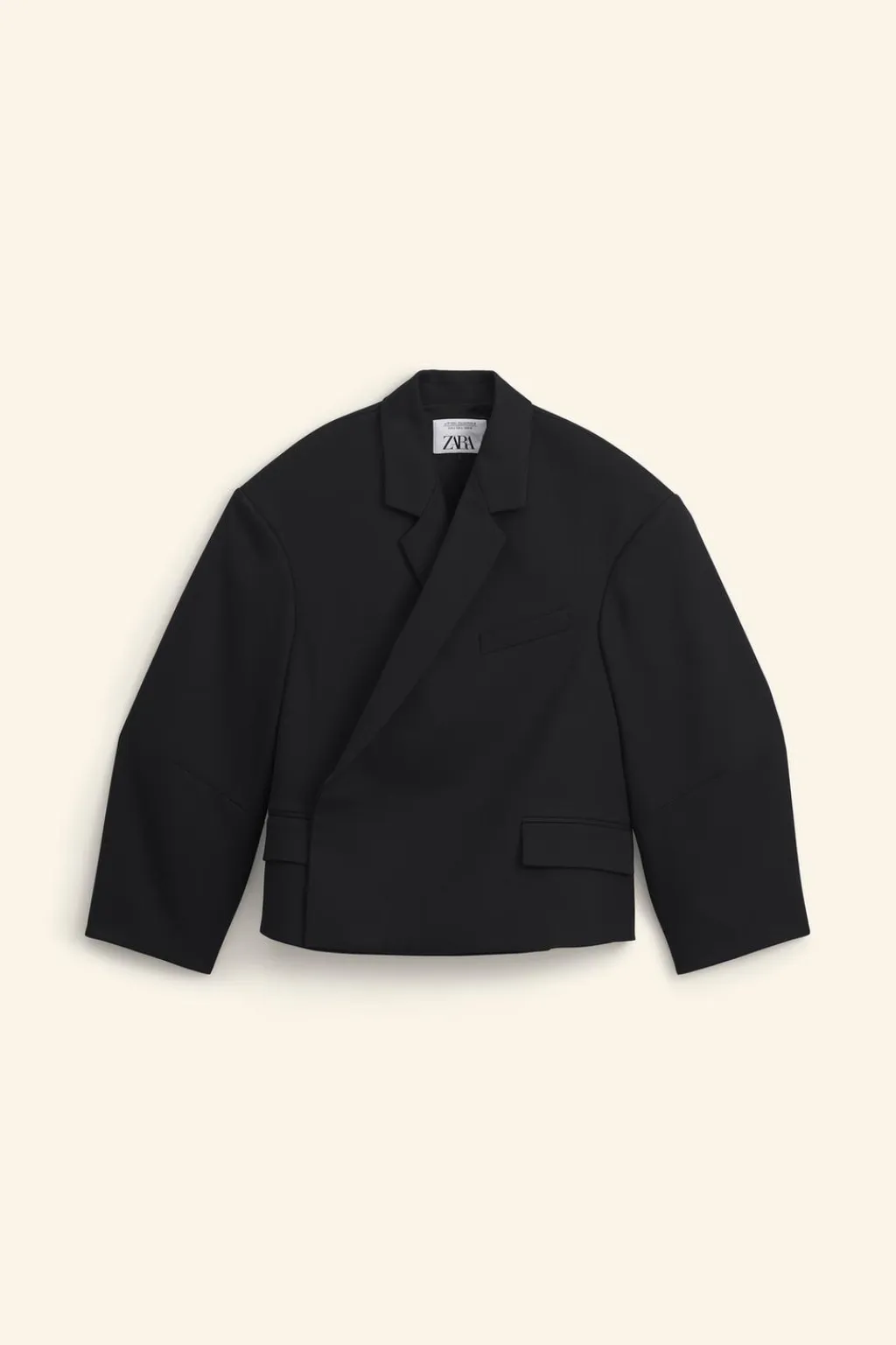 Blazer boxy fit confeccionado en tejido con elasticidad. Cuello con solapas de muesca. Manga larga acabada en puño con detalle de botones. Bolsillo de vivo en pecho y de solapa en cadera. Cierre frontal de botonadura cruzada oculta.