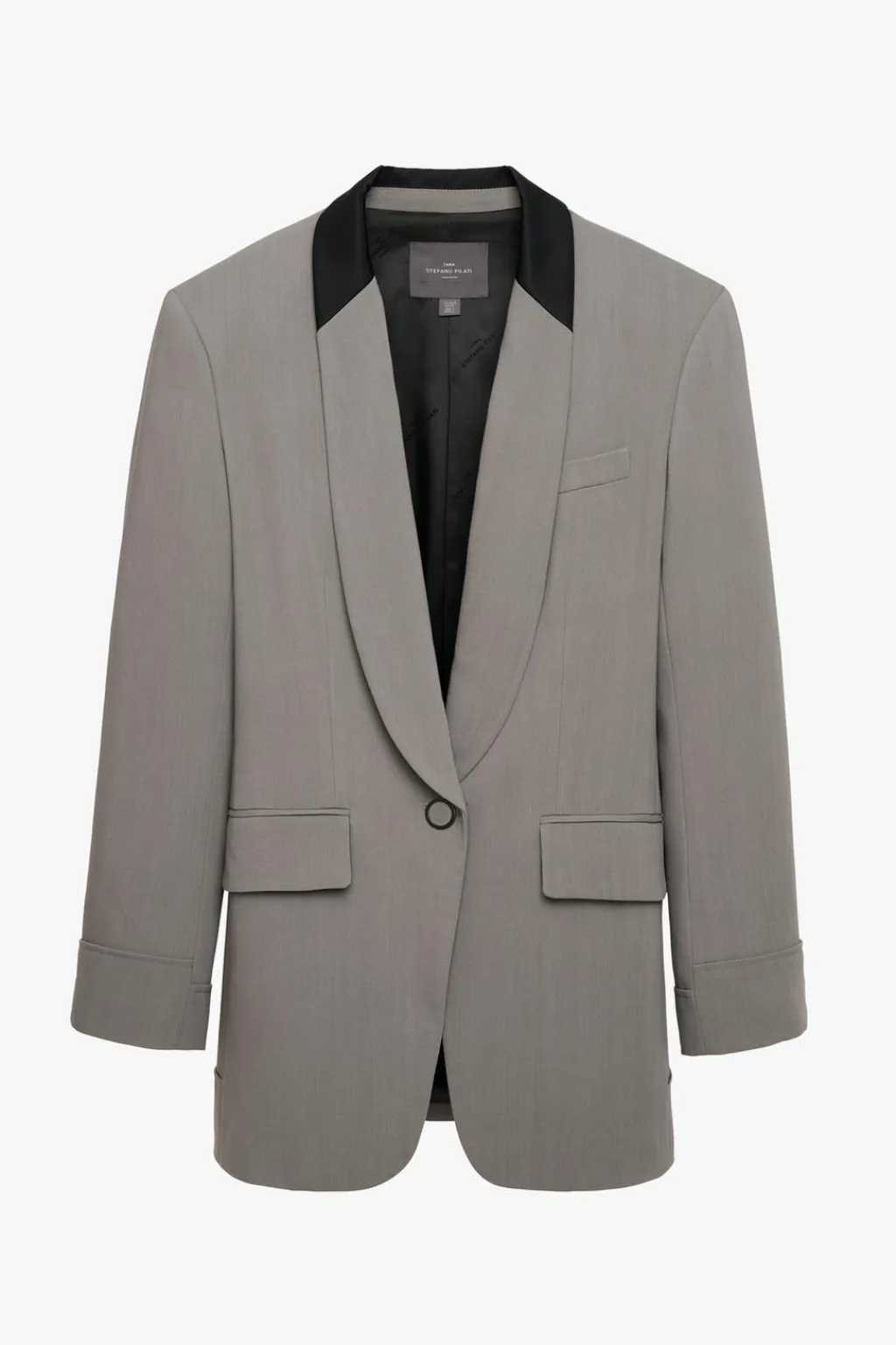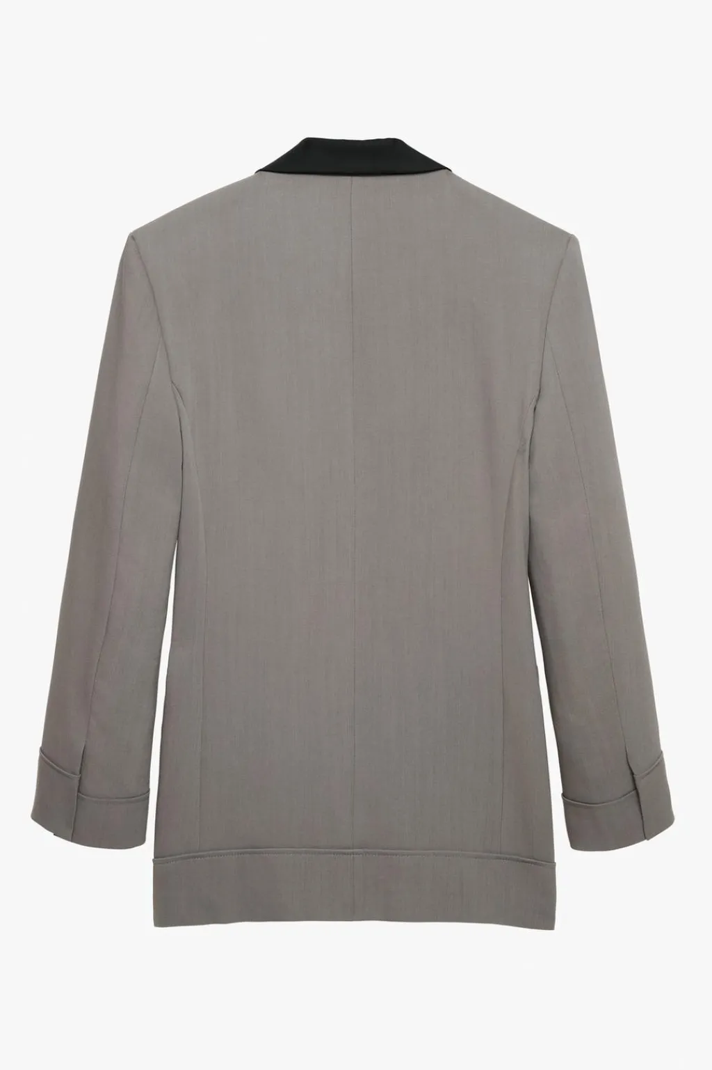 Blazer confeccionada en hilatura con lana. Cuello smoking con tejidos a contraste. Manga larga acabada en abertura. Bolsillos con solapa en delantero y de vivo en pecho. Forro interior. Cierre frontal con botón.