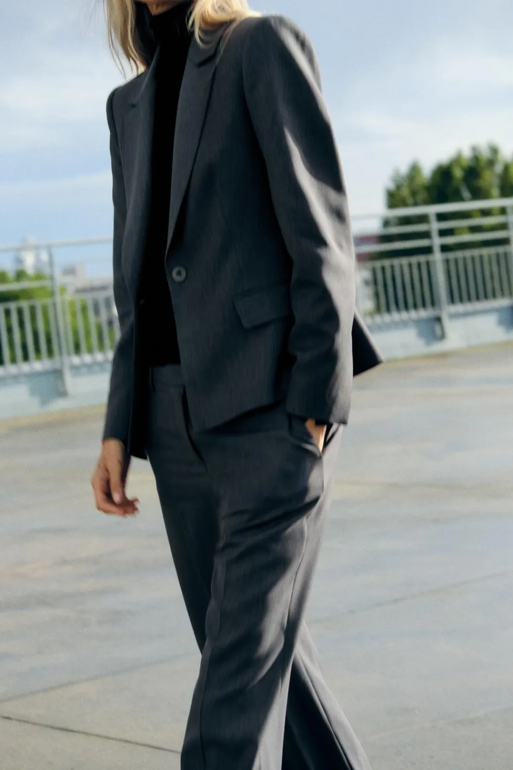 Blazer de cuello solapa y manga larga con hombreras. Bolsillos delanteros con solapa. Cierre frontal con un botón.