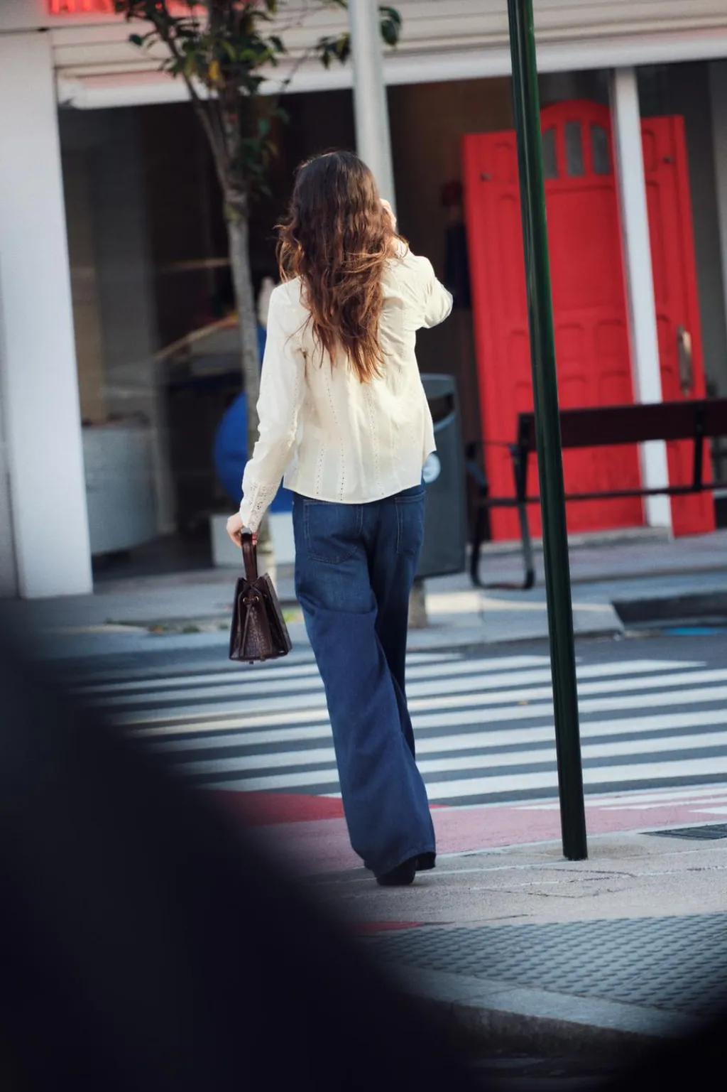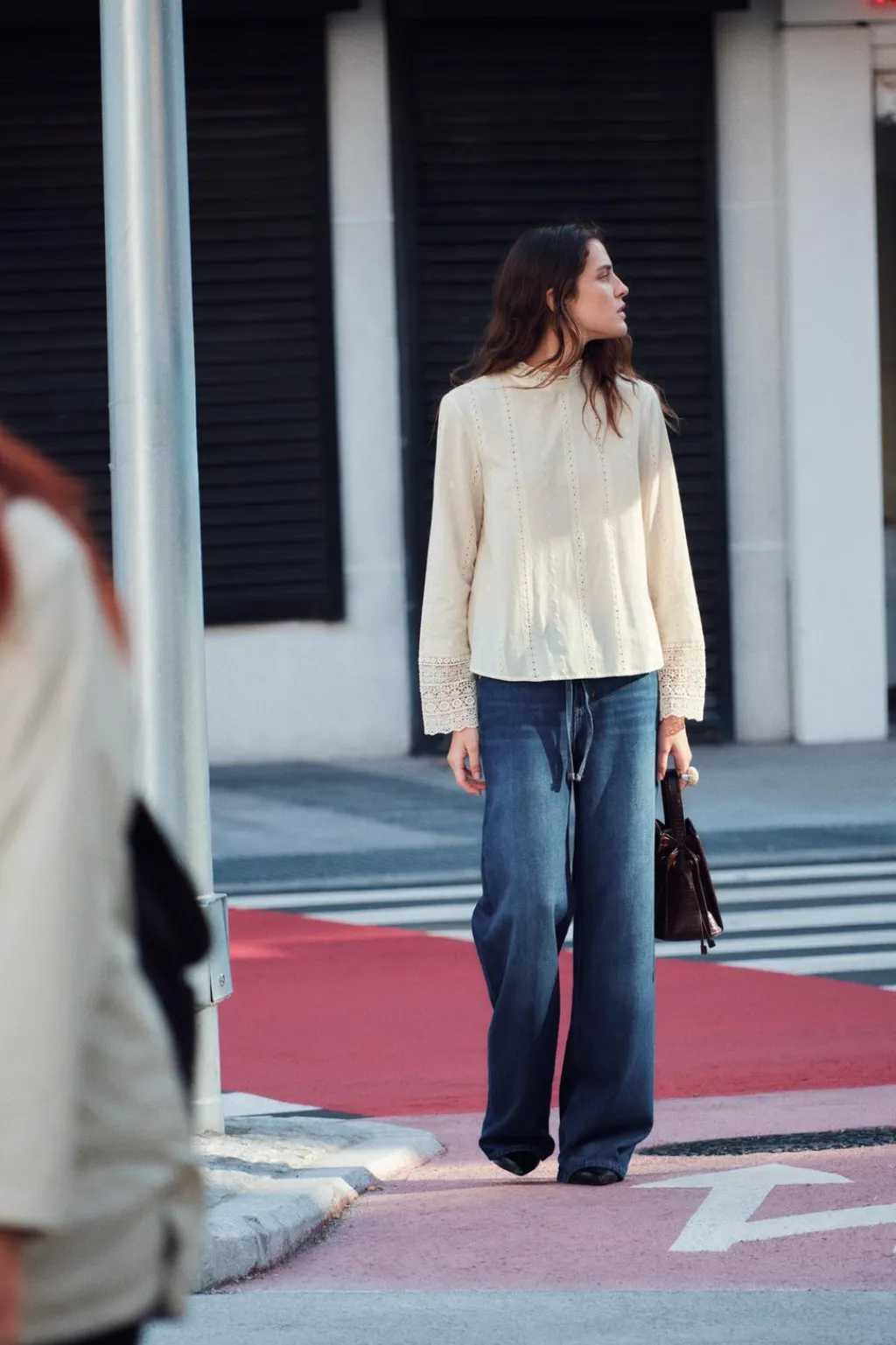 Blusa de cuello subido y manga larga. Detalle de acabados con guipur a tono y bordados perforados. Cierre en espalda con abertura y botón.