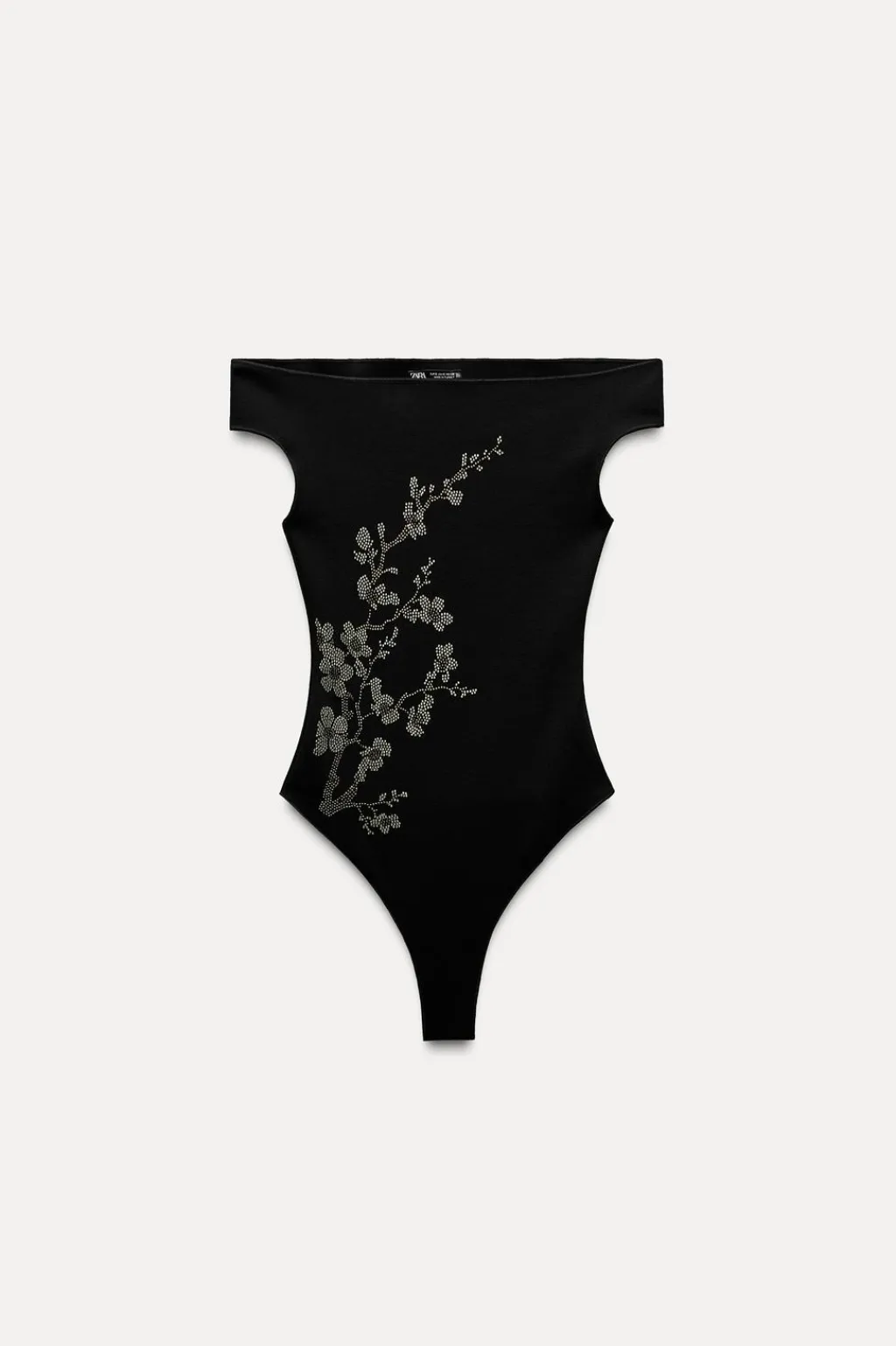 Body confeccionado en tejido tipo punto. Escote barco y manga corta. Detalle de aplicación de brillos en delantero. Espalda descubierta.