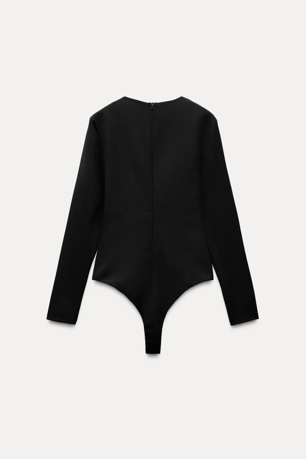 Body confeccionado en tejido elástico. Escote pico con detalle e pieza con joyas. Manga larga con hombreras. Cierre en bajo con botones a presión y en espalda con cremallera oculta en costura.