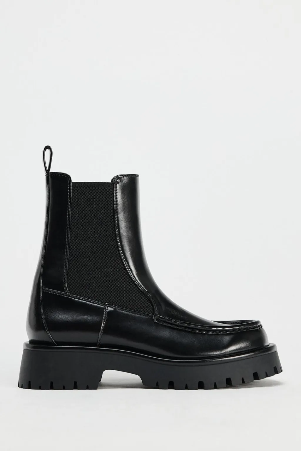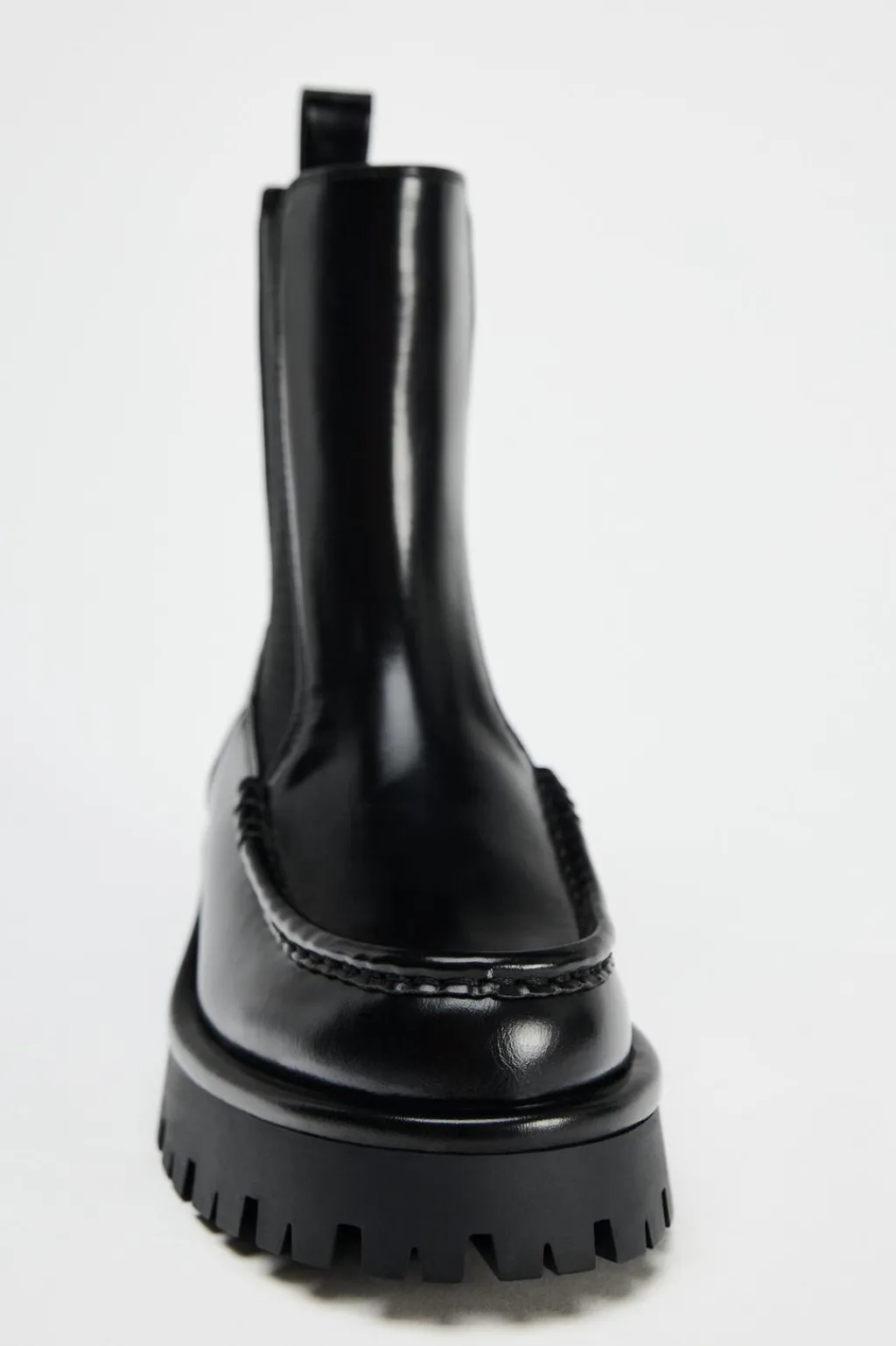 Zapato tipo botín con suela dentada. Detalle de fruncido en la parte delantera. Elásticos laterales y tirador trasero. Acabado en punta redonda.