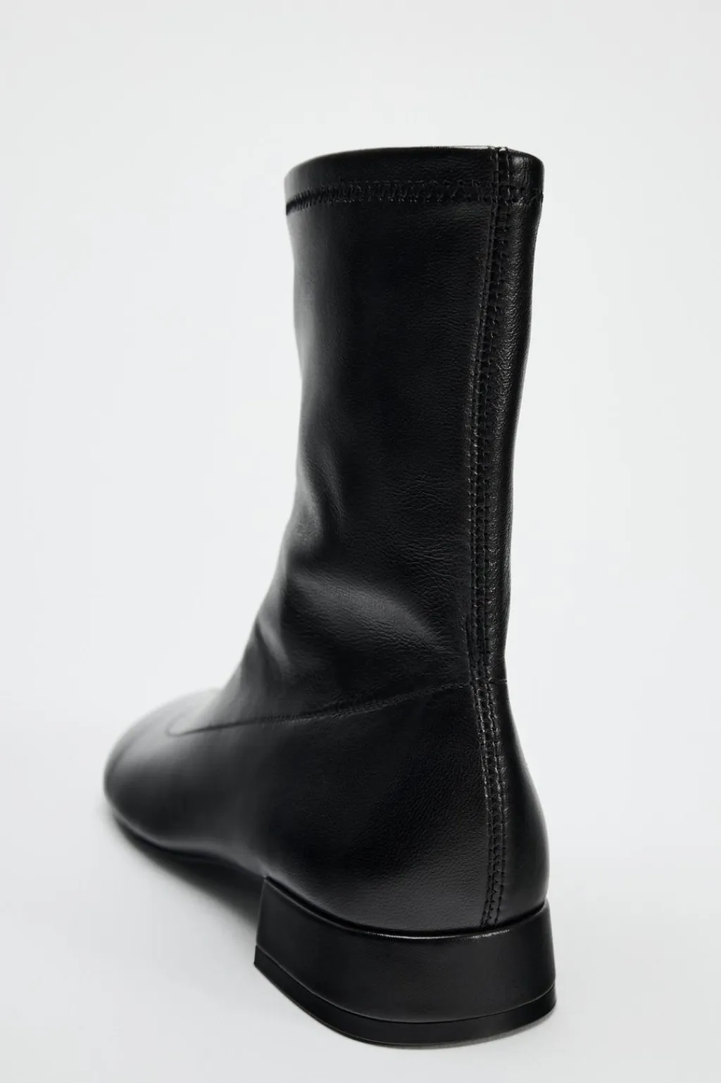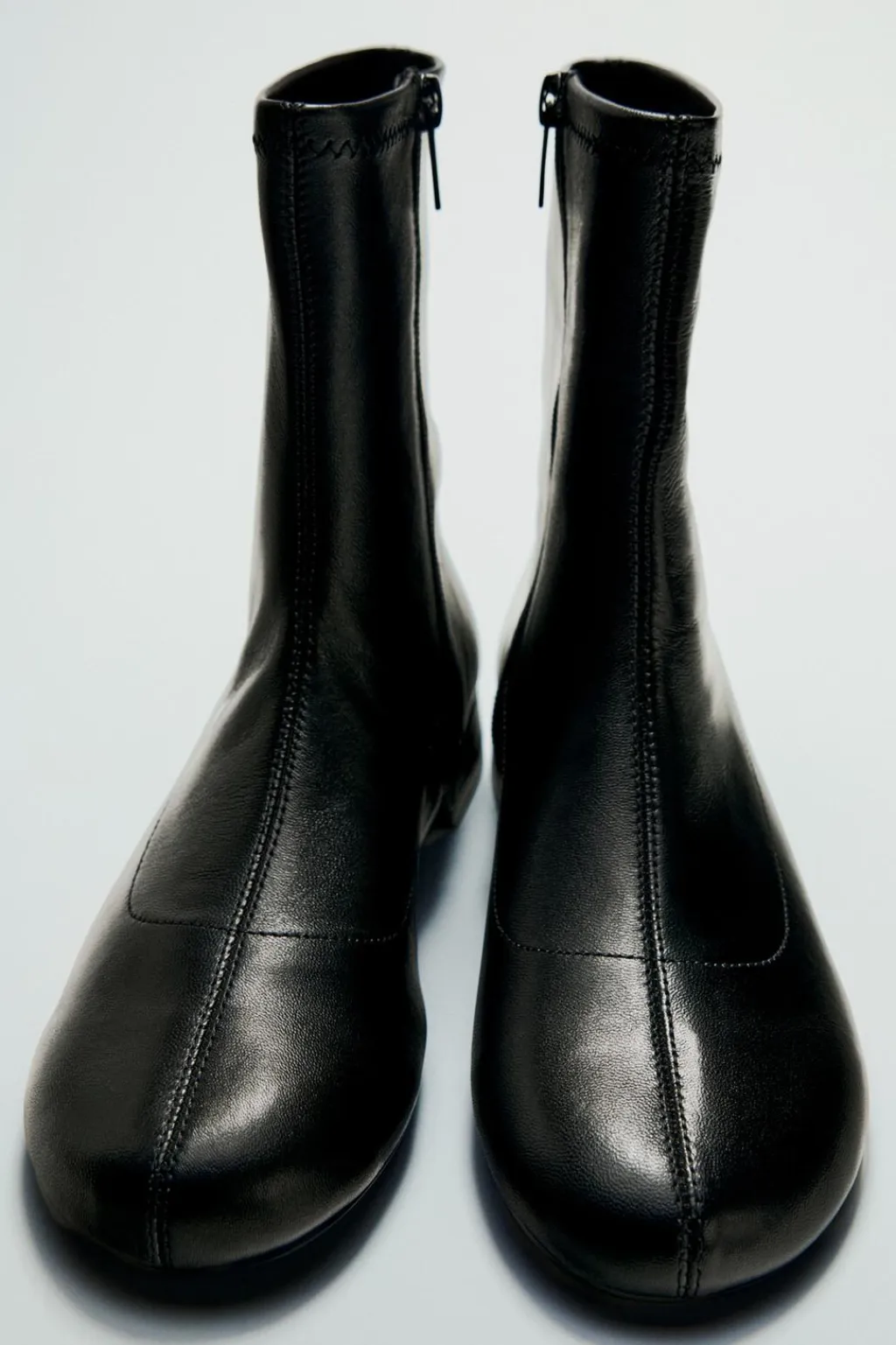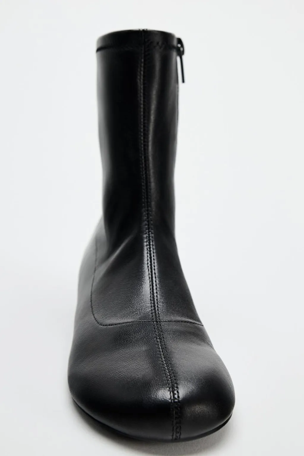 Zapato tipo botín plano en piel. Detalle de pespunte en el corte. Cierre mediante cremallera. Acabado en punta redonda.