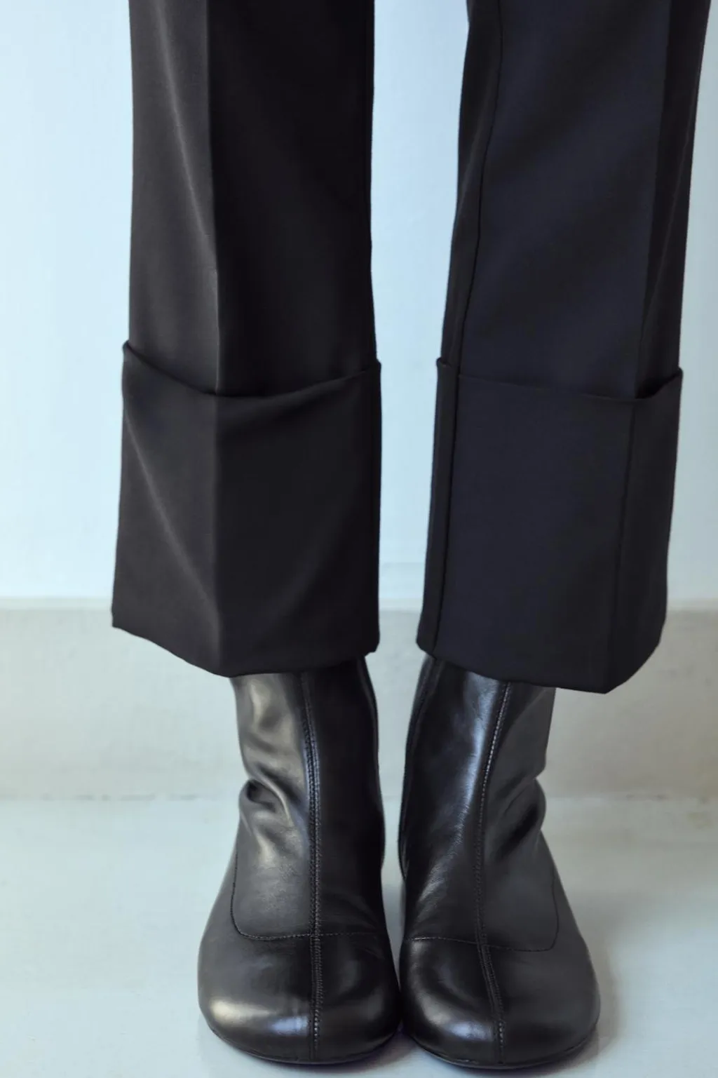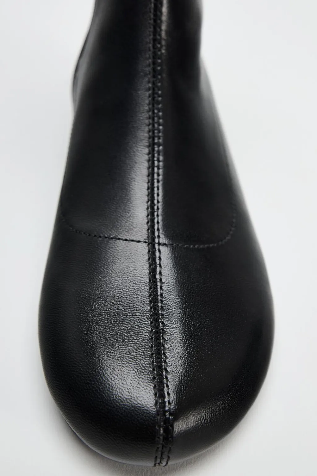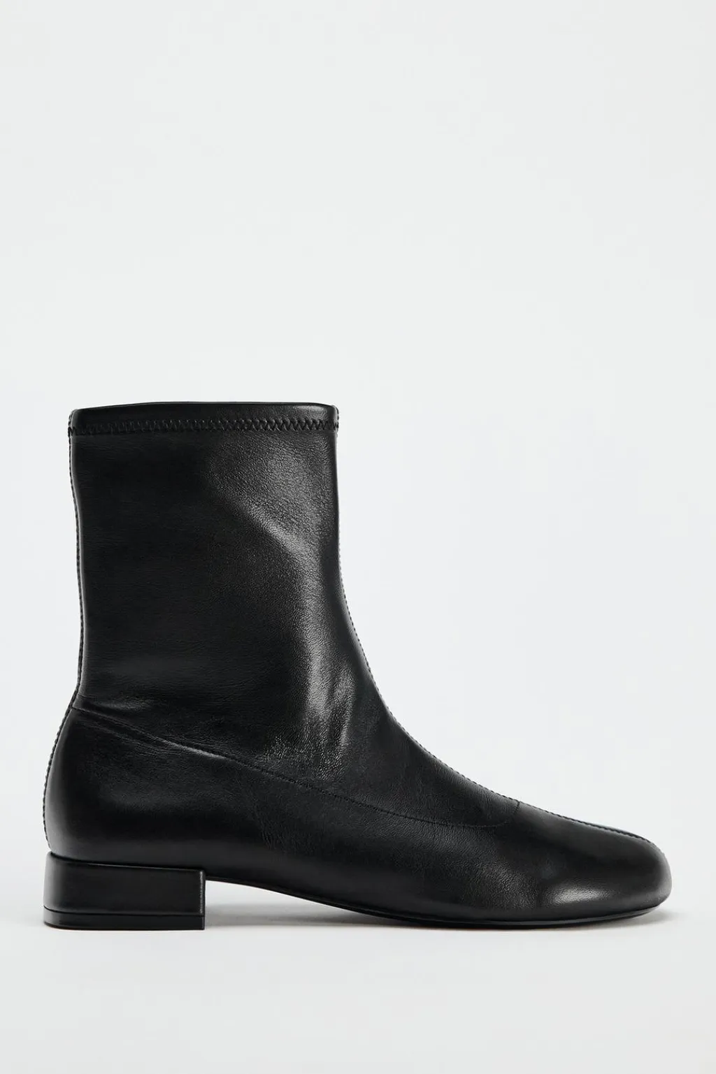 Zapato tipo botín plano en piel. Detalle de pespunte en el corte. Cierre mediante cremallera. Acabado en punta redonda.