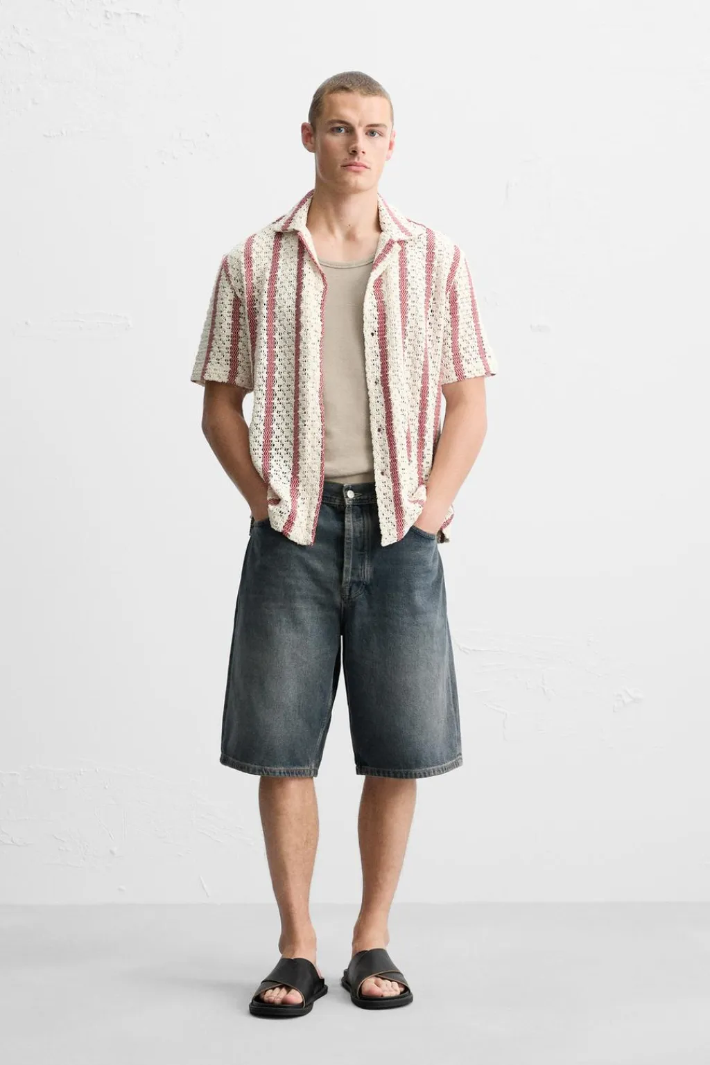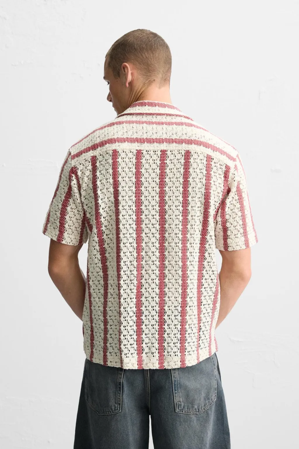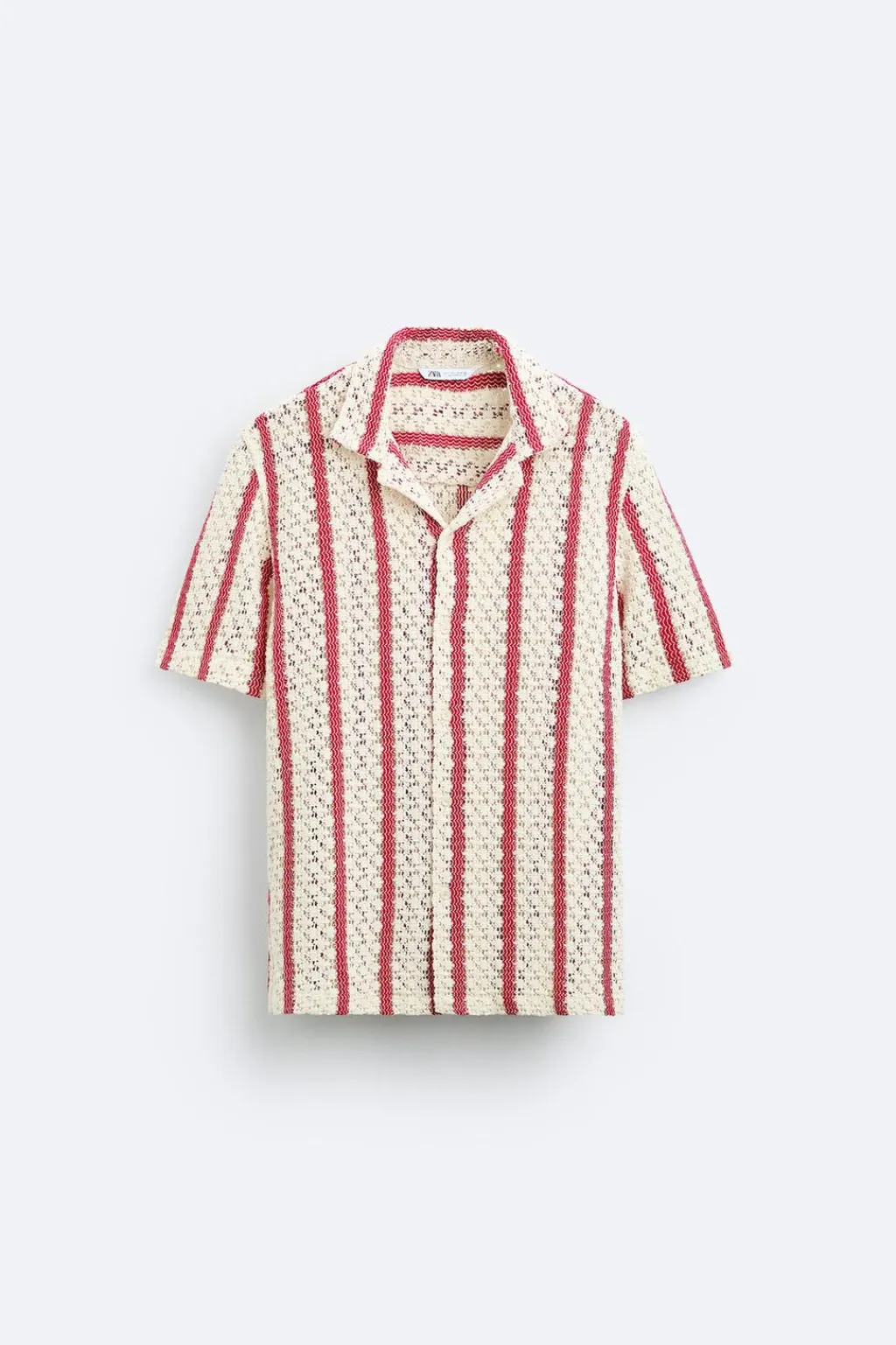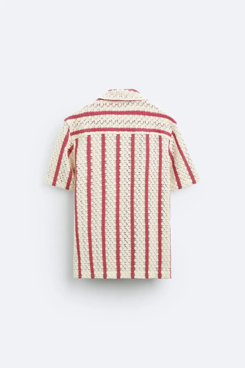 Camisa relaxed fit confeccionada en tejido con estructura abierta. Cuello bowling y manga corta. Cierre frontal de botonadura.