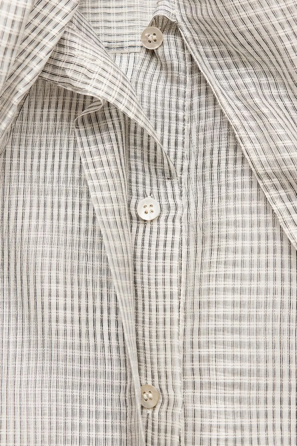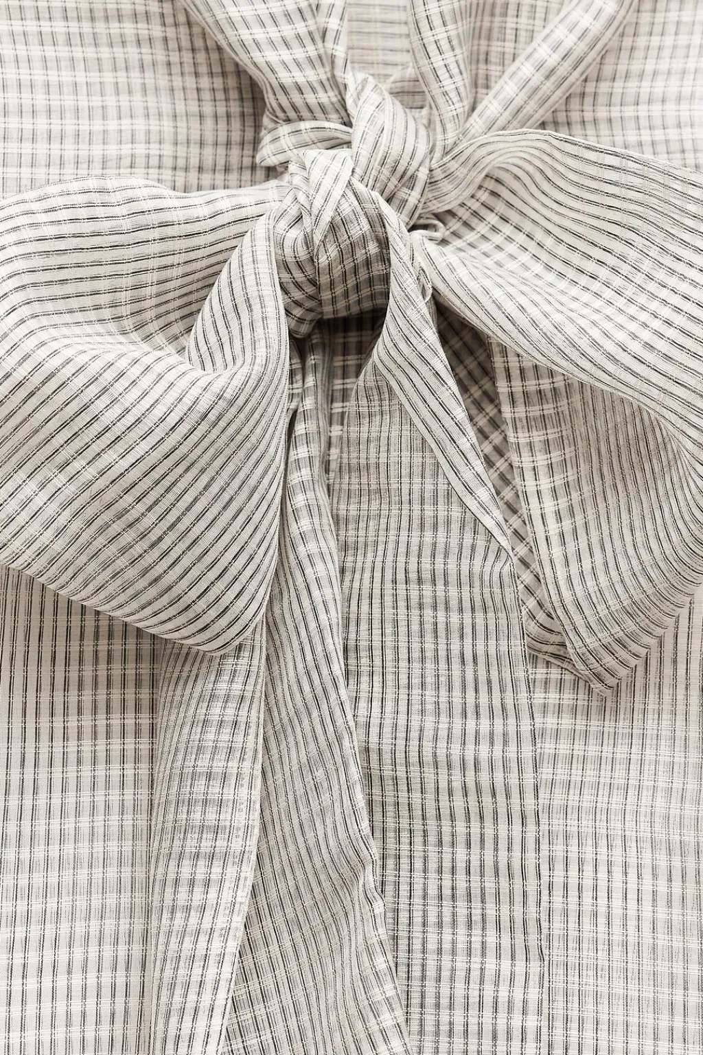Camisa semitransparente de cuello redondo con lazo en mismo tejido. Manga larga acabada en puño. Cierre frontal con botones.