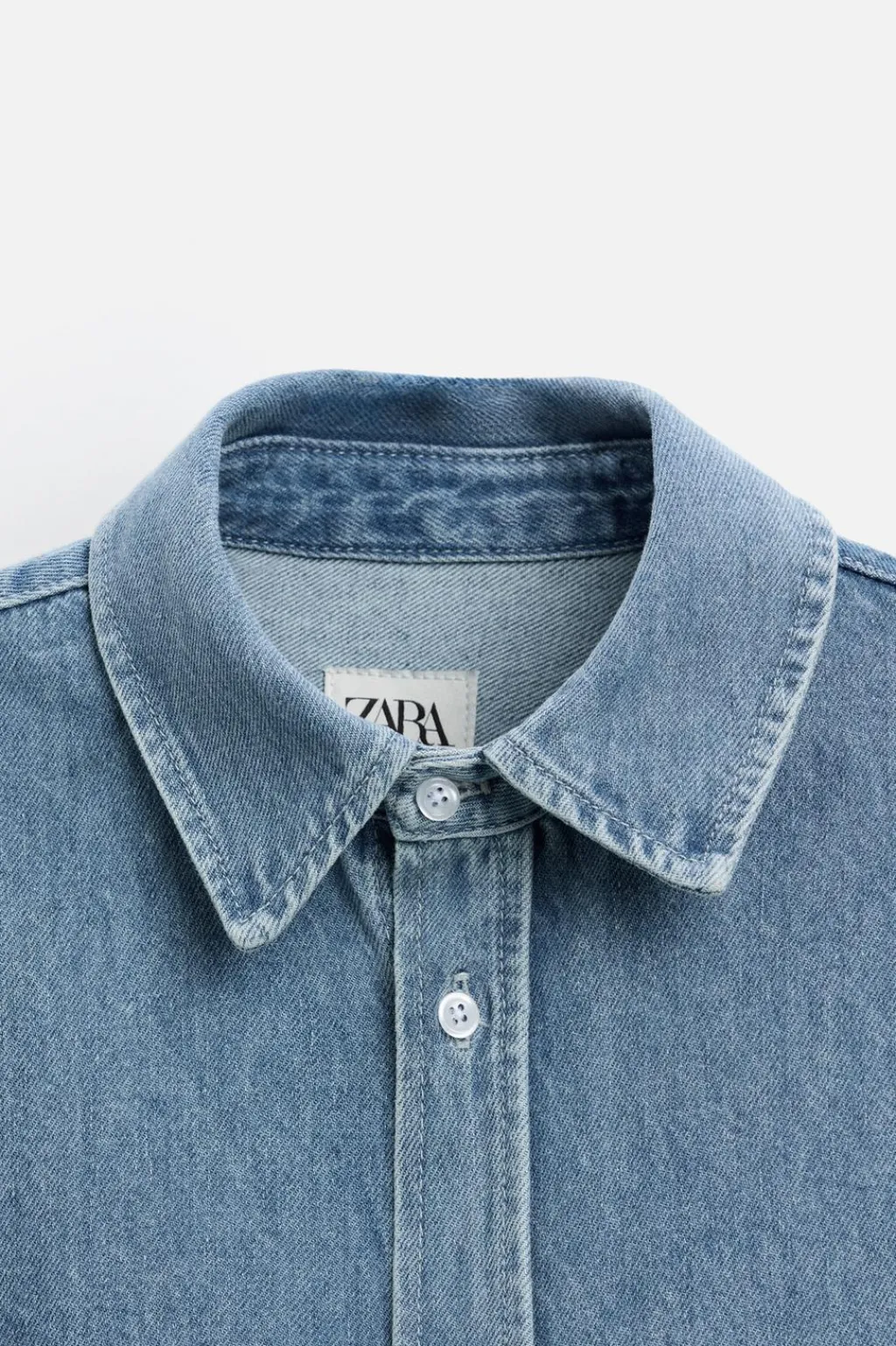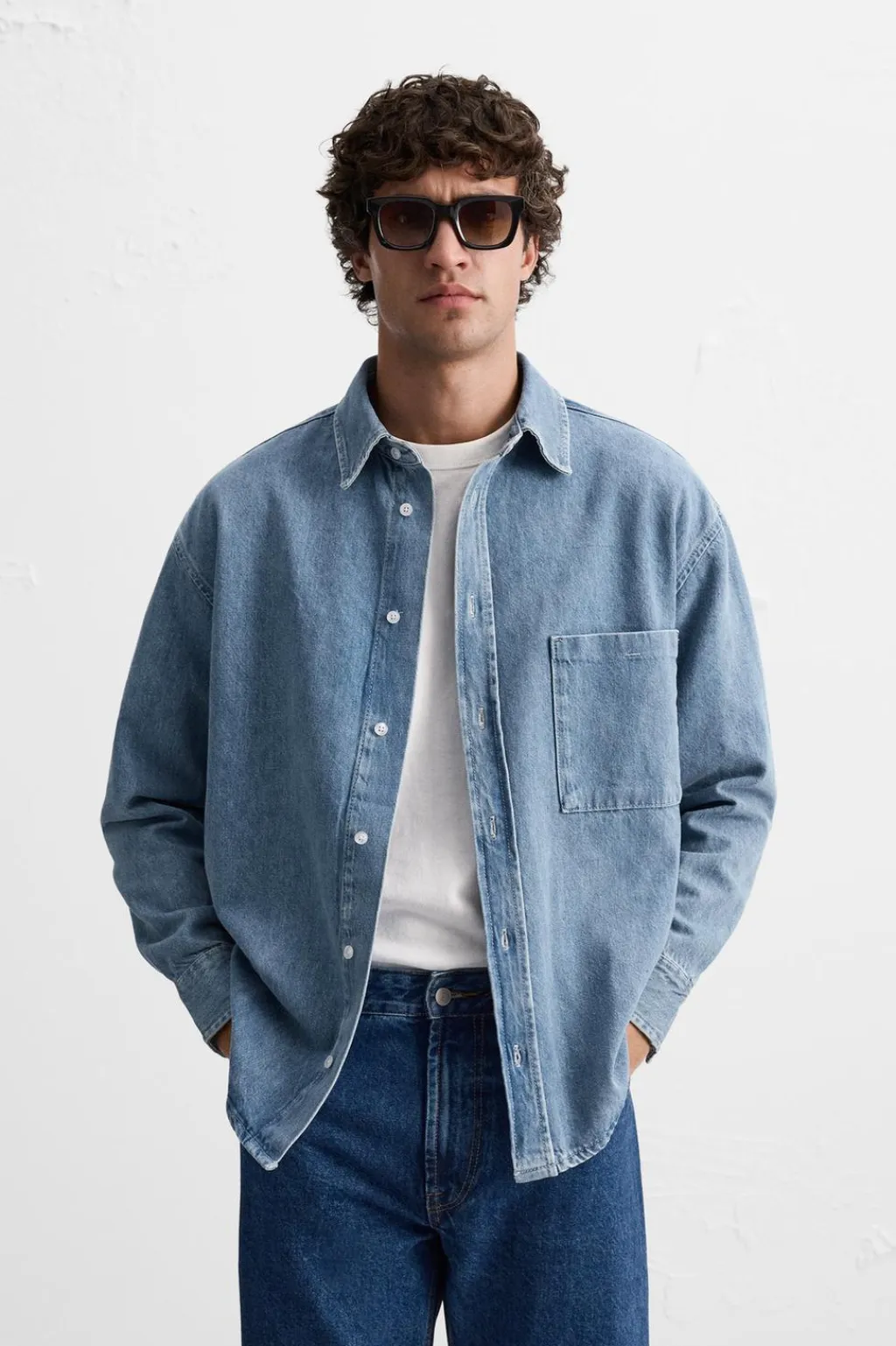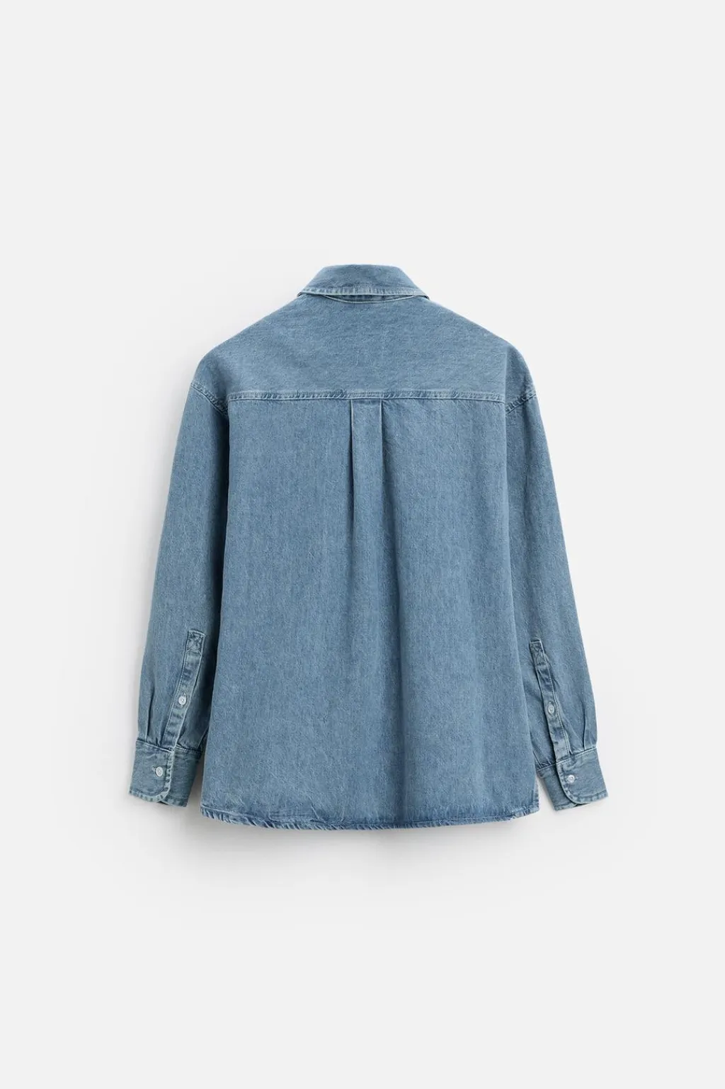 Camisa relaxed fit confeccionada en denim de algodón. Cuello solapa y manga larga acabada en puño con botón. Bolsillo plastrón en pecho. Cierre frontal de botonadura.