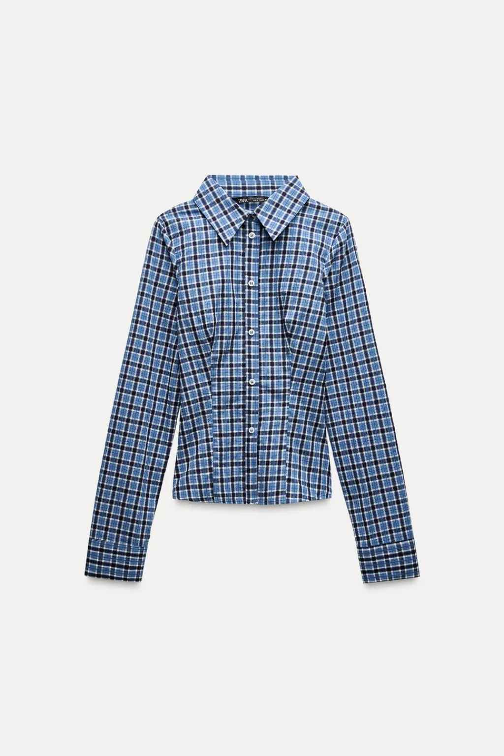 Camisa ajustada de cuello solapa y manga larga. Cierre frontal con botones.