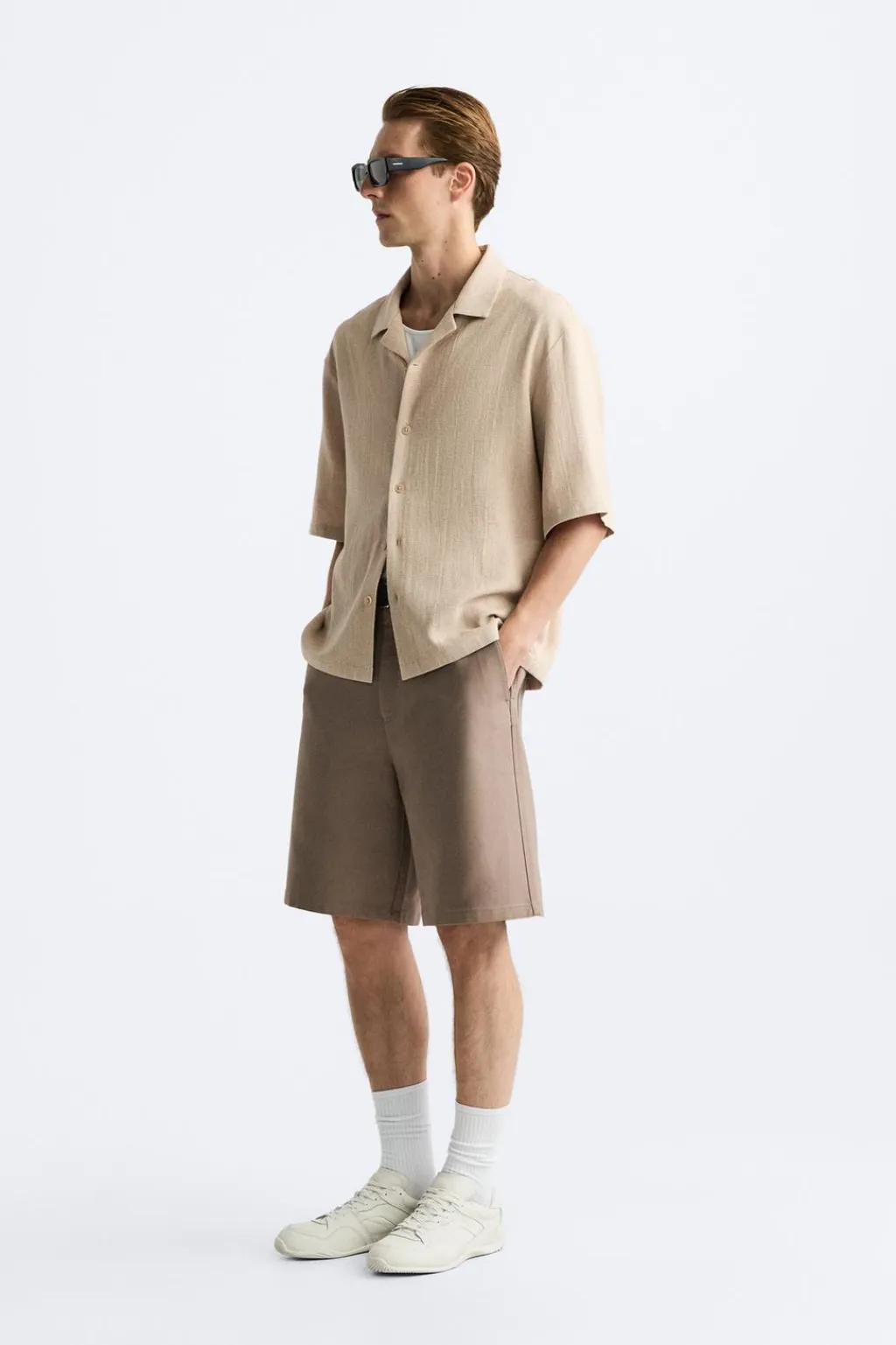 Camisa boxy fit confeccionada en tejido con mezcla de algodón. Cuello bowling y manga corta. Cierre frontal de botonadura.