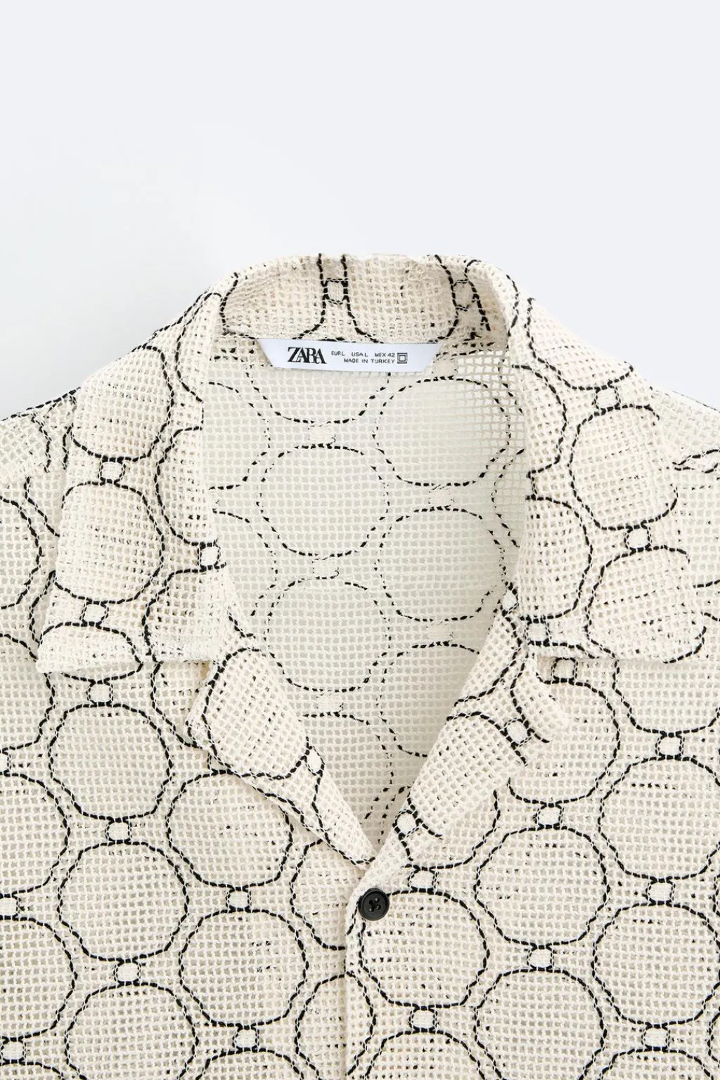 Camisa relaxed fit confeccionada en tejido con estructura abierta. Cuello bowling y manga corta. Cierre frontal de botonadura.