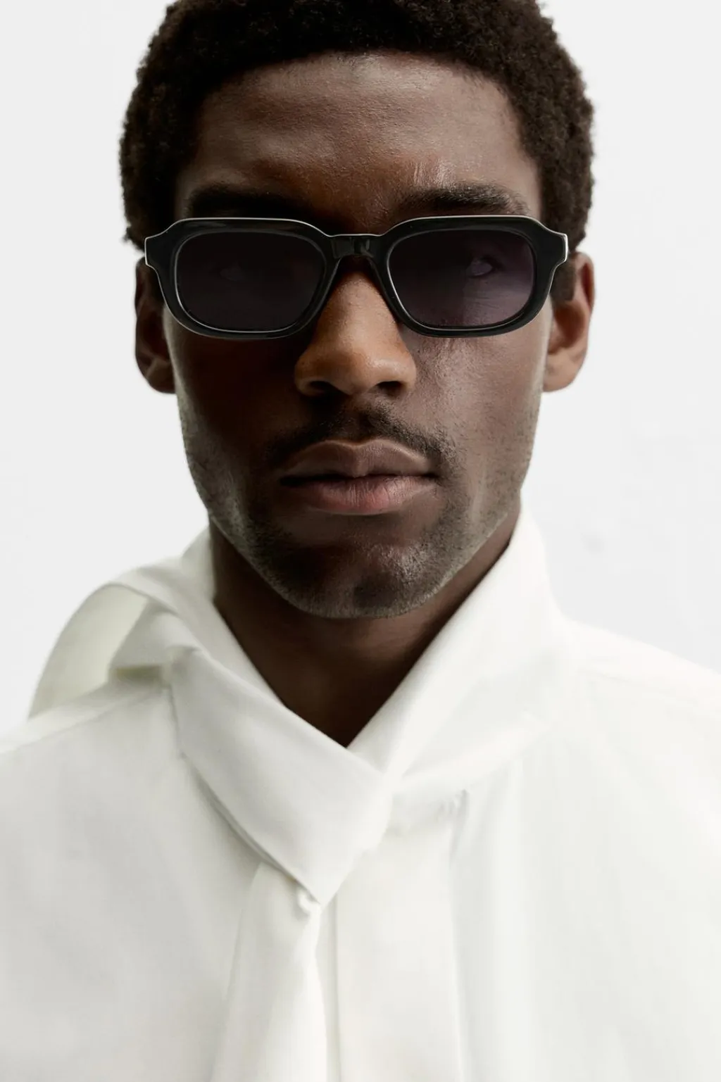Camisa relaxed fit confeccionada en tejido de algodón. Cuello redondo con detalle de lazo en el mismo tejido. Manga larga acabada en puño con botón. Cierre frontal de botonadura oculta por solapa.