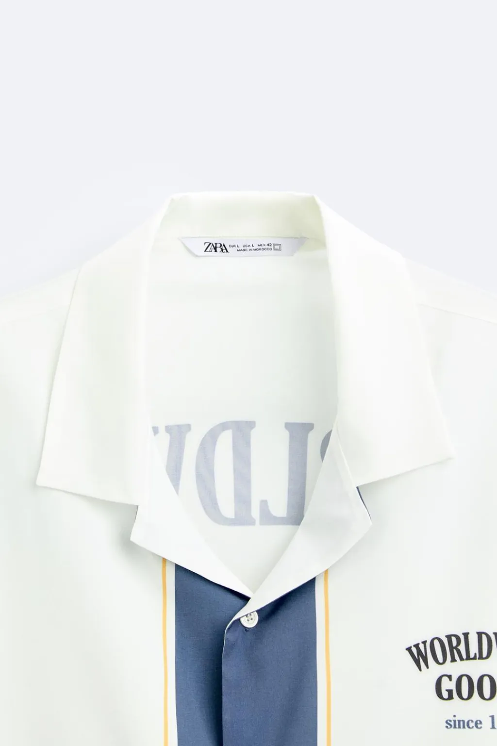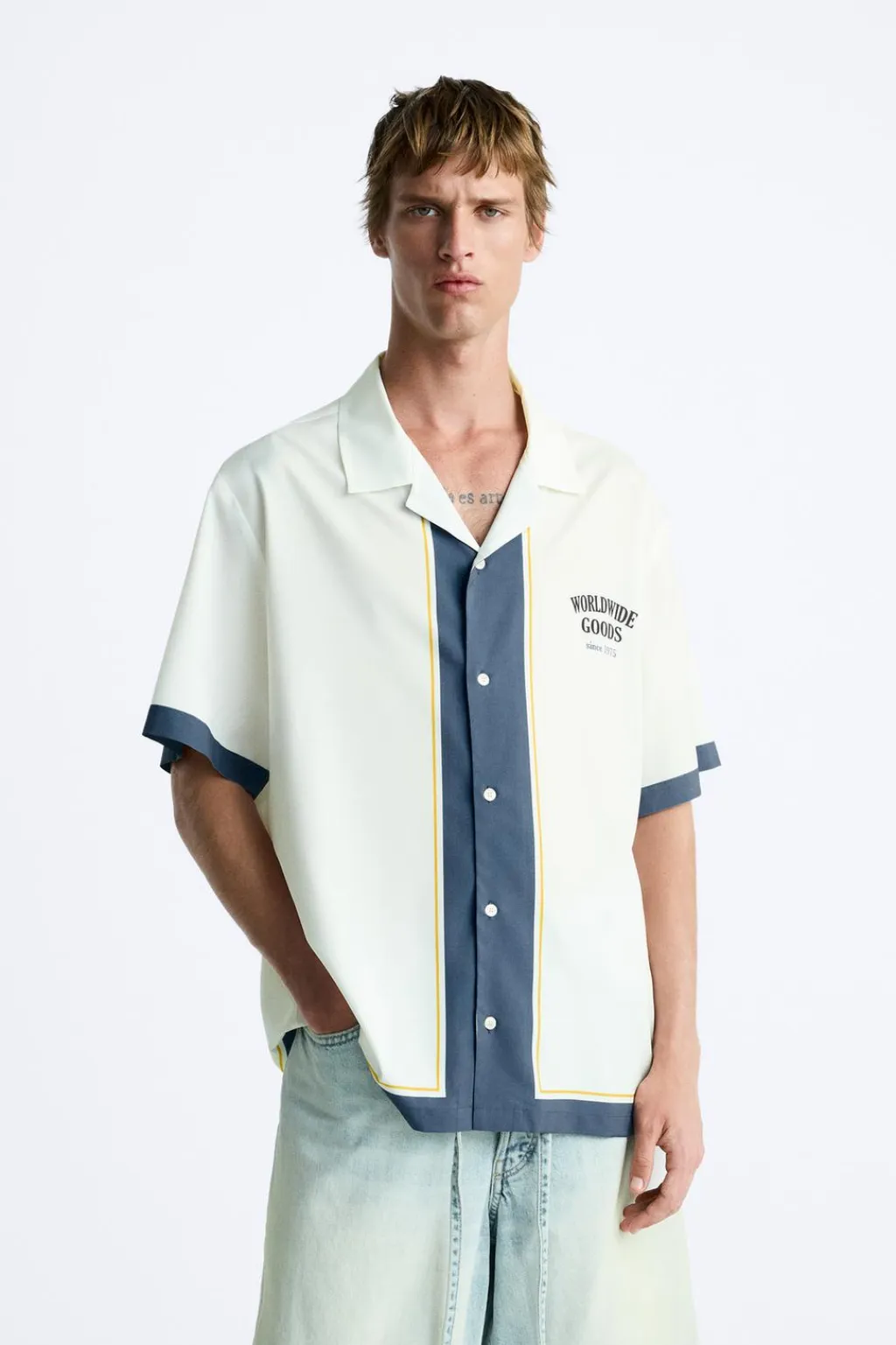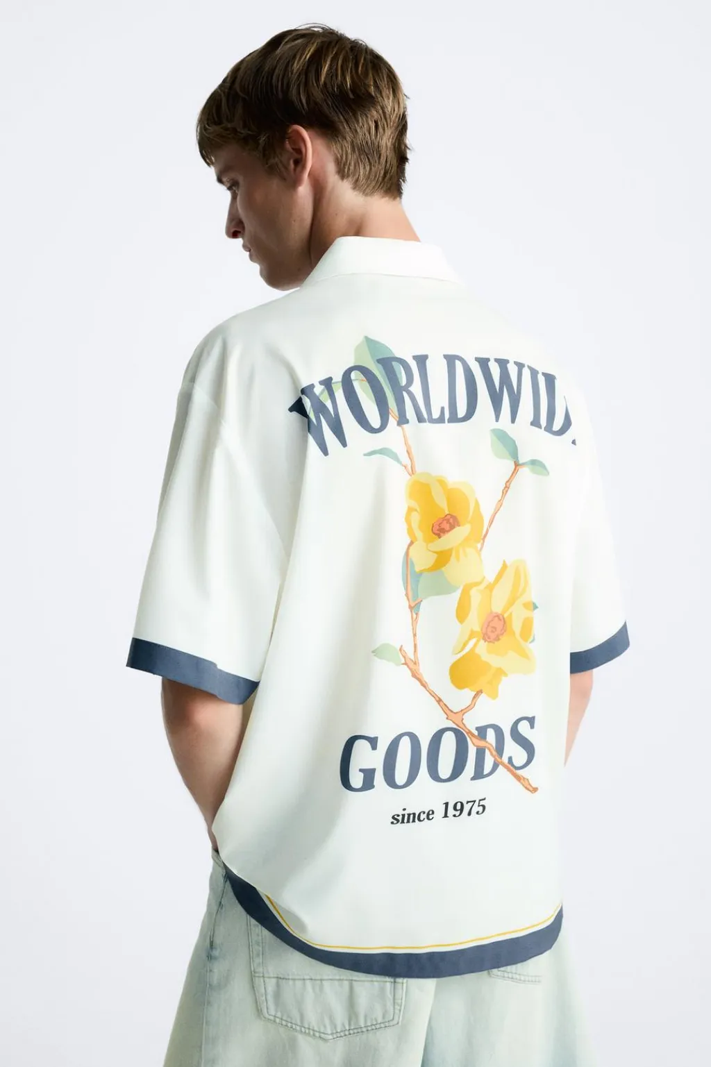 Camisa relaxed fit confeccionada en tejido satinado. Cuello bowling y manga corta. Estampaciones combinadas a contraste en delantero y espalda. Cierre frontal de botonadura.