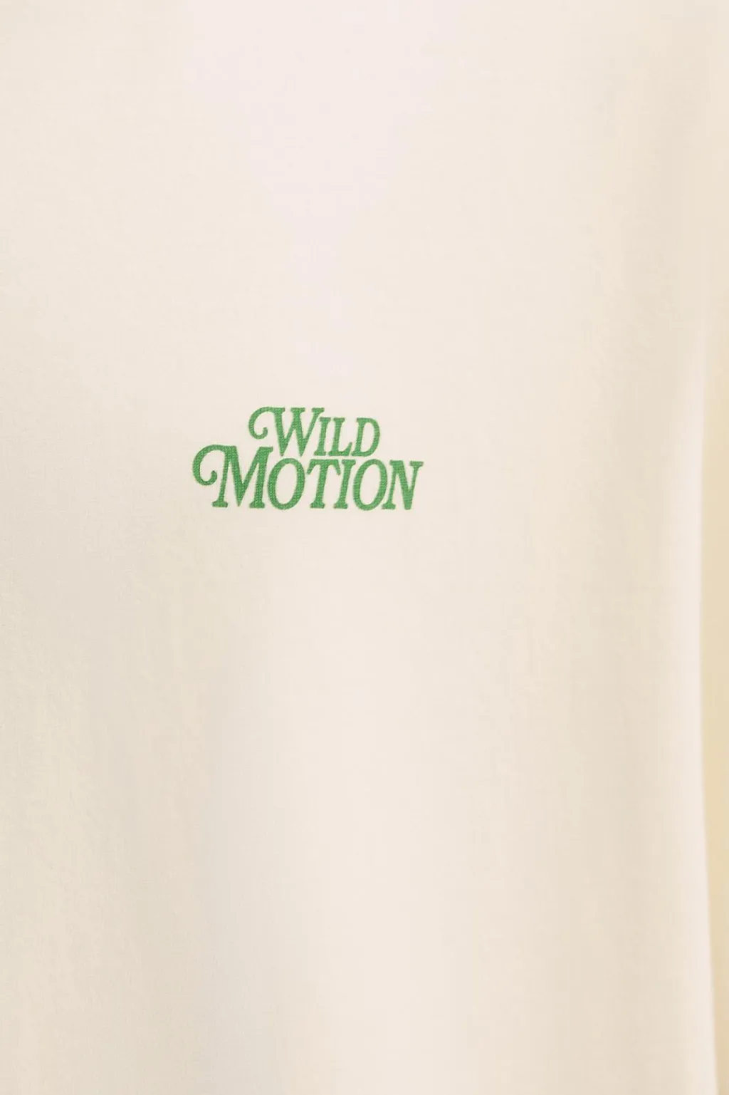 Camiseta amplia confeccionada en tejido de algodón. Cuello redondo y manga corta. Estampaciones combinadas a contraste en delantero y espalda.