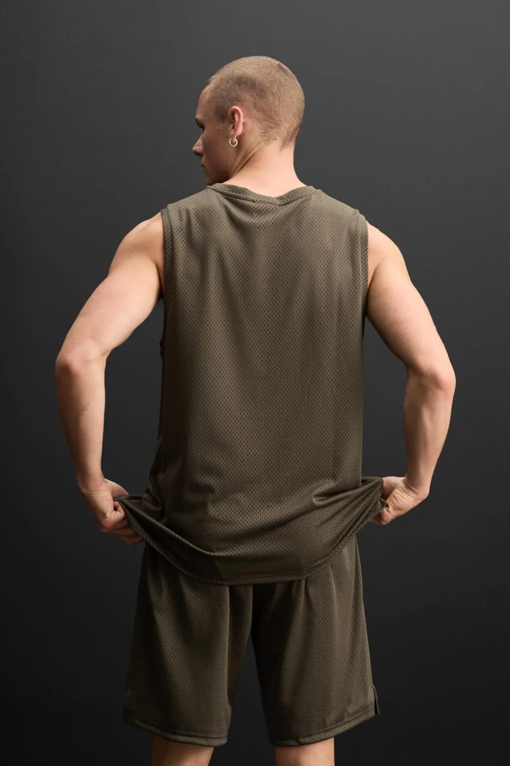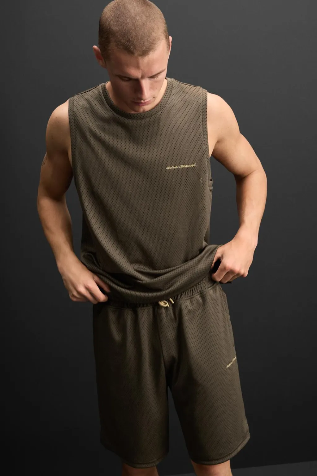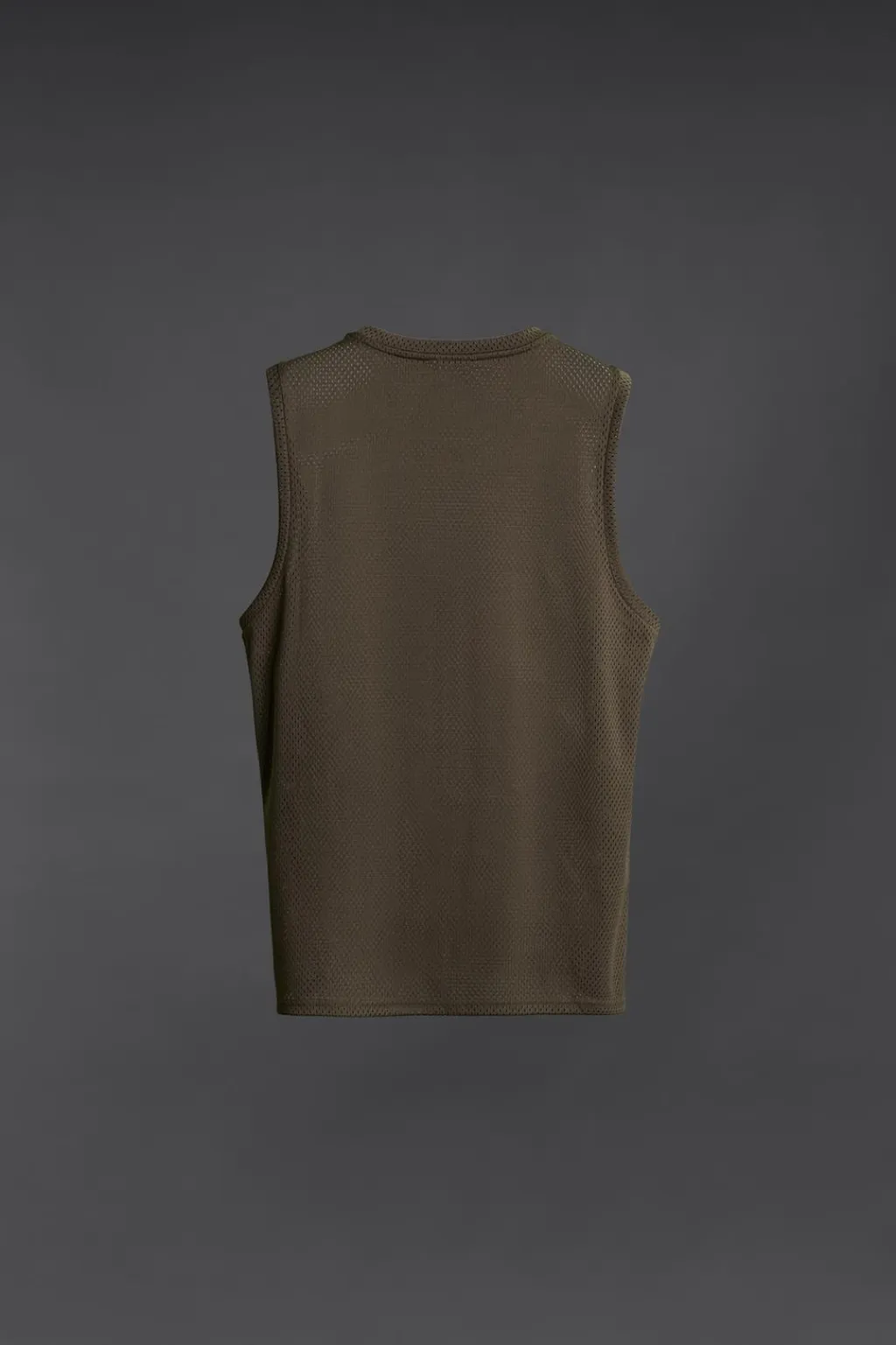 Camiseta relaxed fit confeccionada en tejido técnico con estructura abierta y elástica. Cuello redondo amplio y manga sisa. Detalle de texto bordado combinado a contraste.