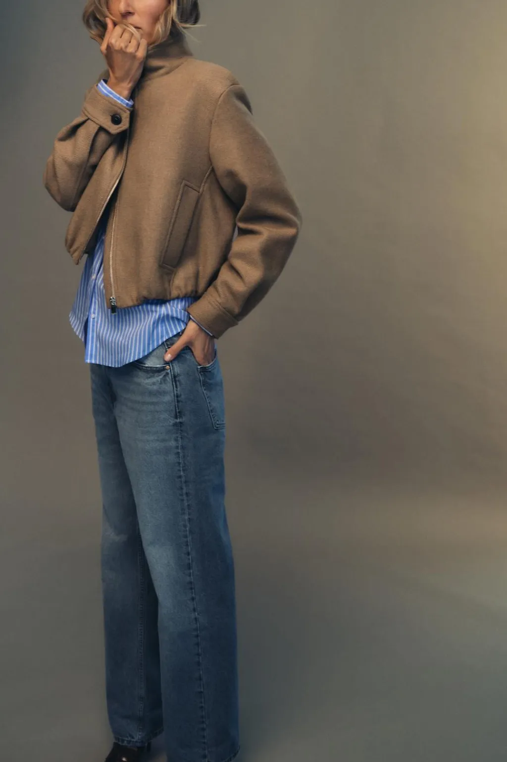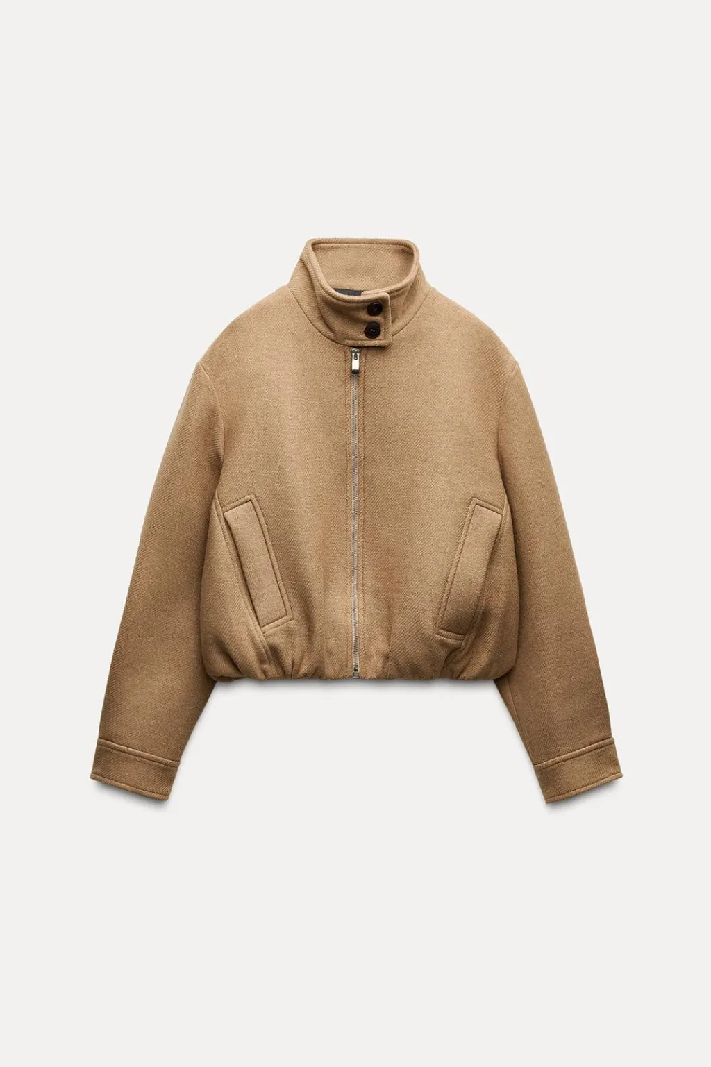 Cazadora confeccionada con lana. Cuello subido y manga larga. Bolsillos delanteros de vivo. Bajo acabado en elástico. Cierre frontal con cremallera y botones.