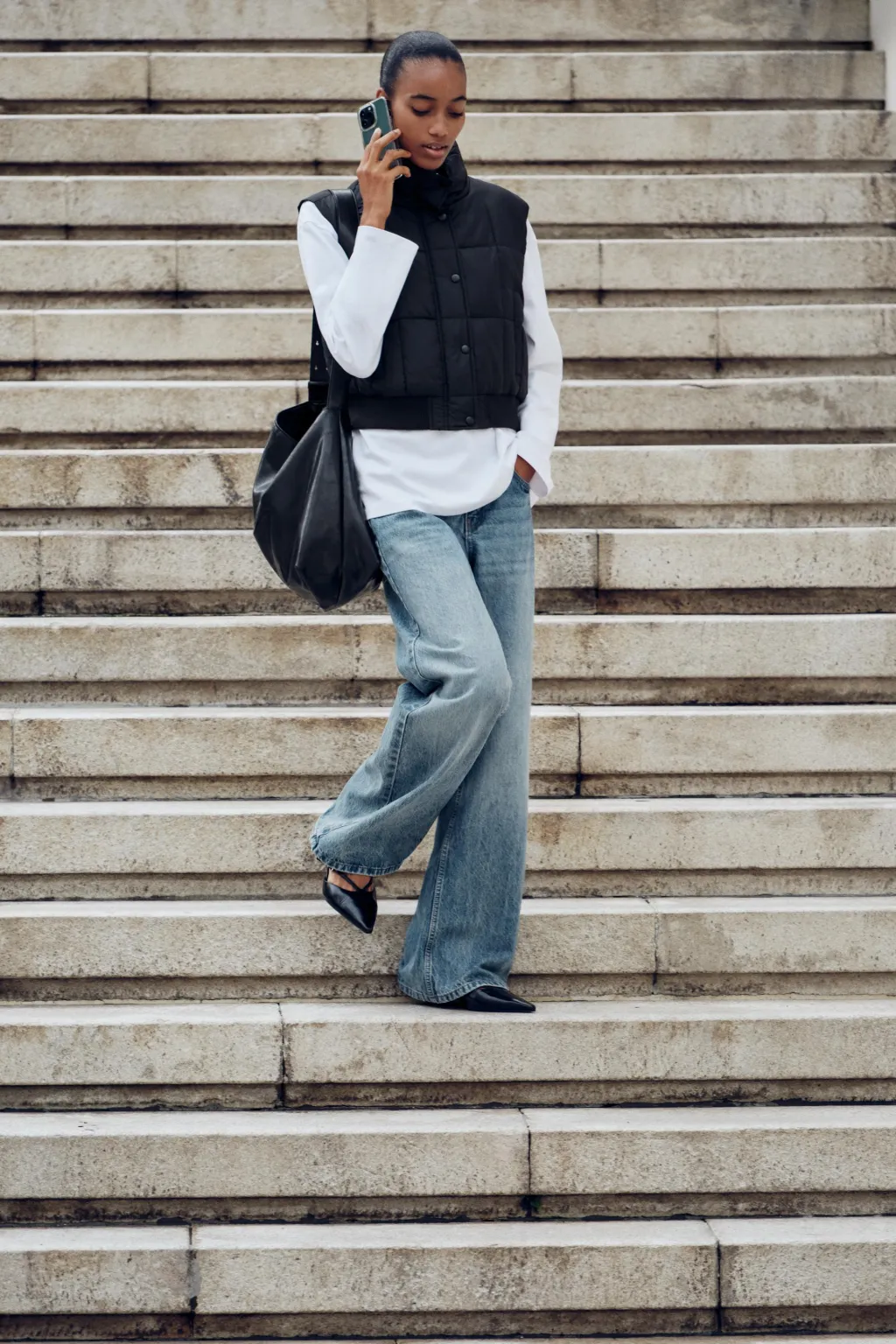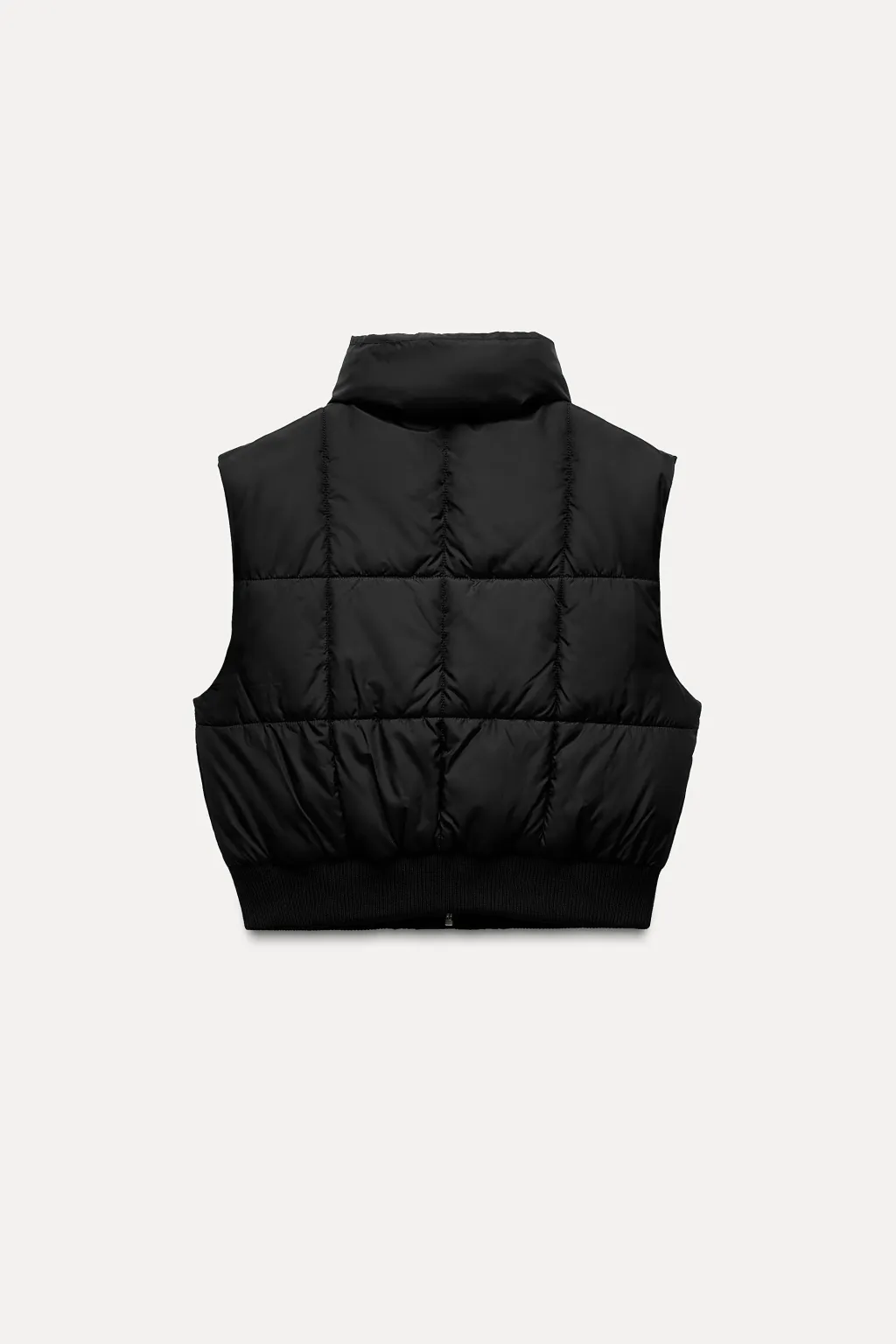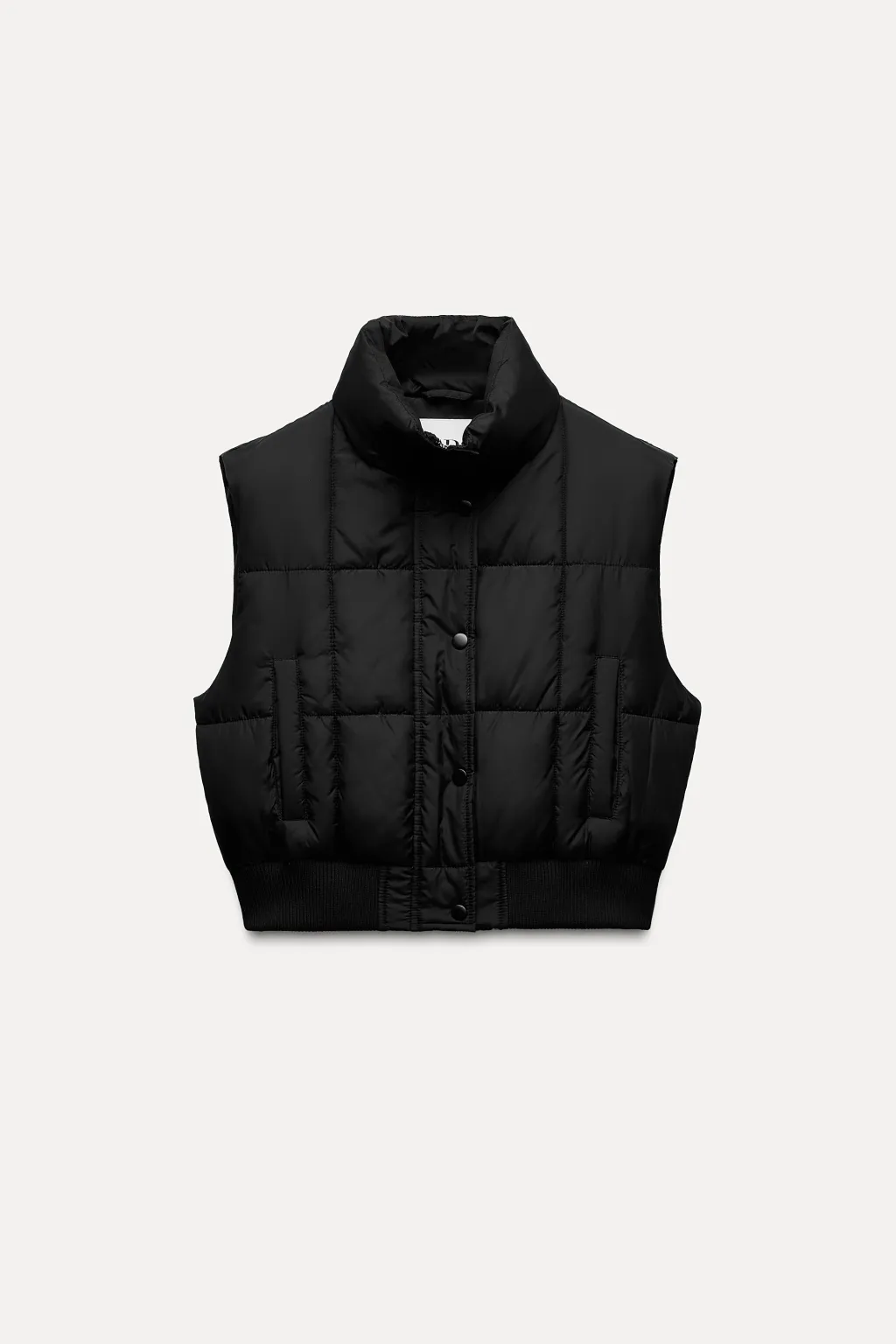 Chaleco de cuello subido y manga sisa. Bolsillos delanteros de vivo. Cierre frontal con cremallera oculta y botones a presión. Bajo acabado en rib.