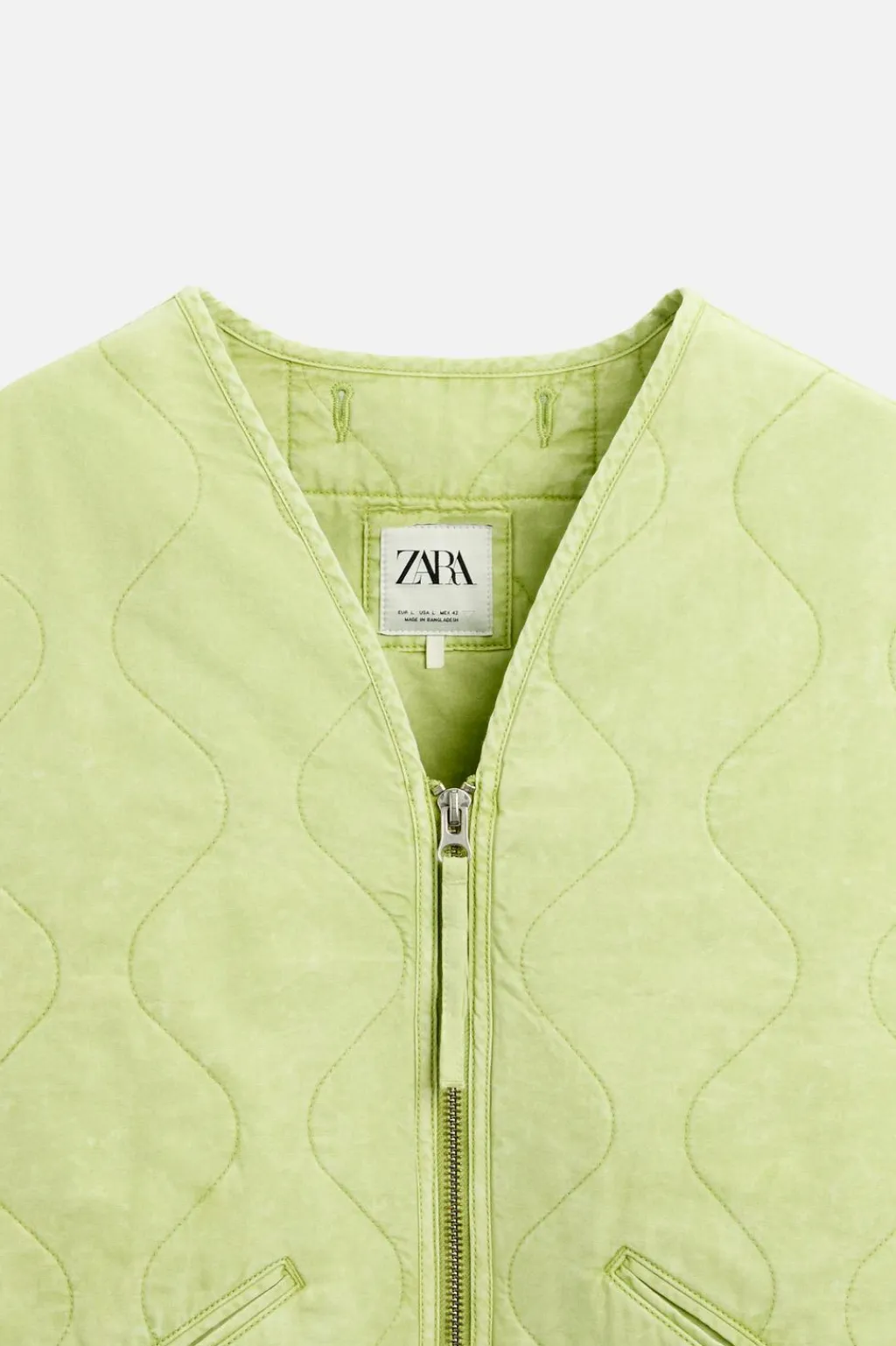 Chaleco boxy fit confeccionado en tejido de algodón ligeramente acolchado en su interior. Cuello pico y manga sisa. Bolsillo de vivo en cadera. Cierre frontal con cremallera.