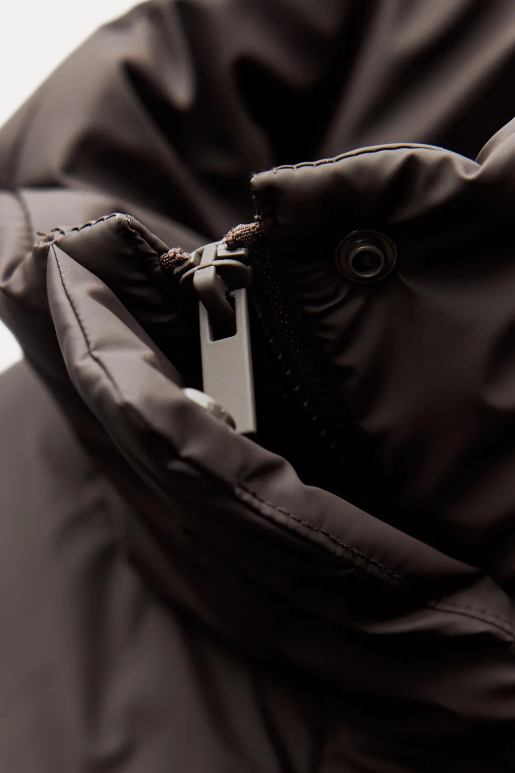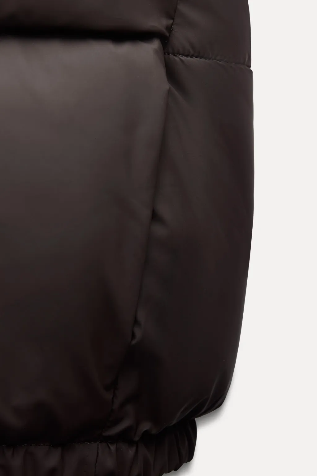 Chaleco acolchado de cuello subido y manga sisa. Bolsillos laterales ocultos en costura. Bajo ajustable con cordones elásticos y stoppers. Cierre frontal con cremallera y botones a presión.