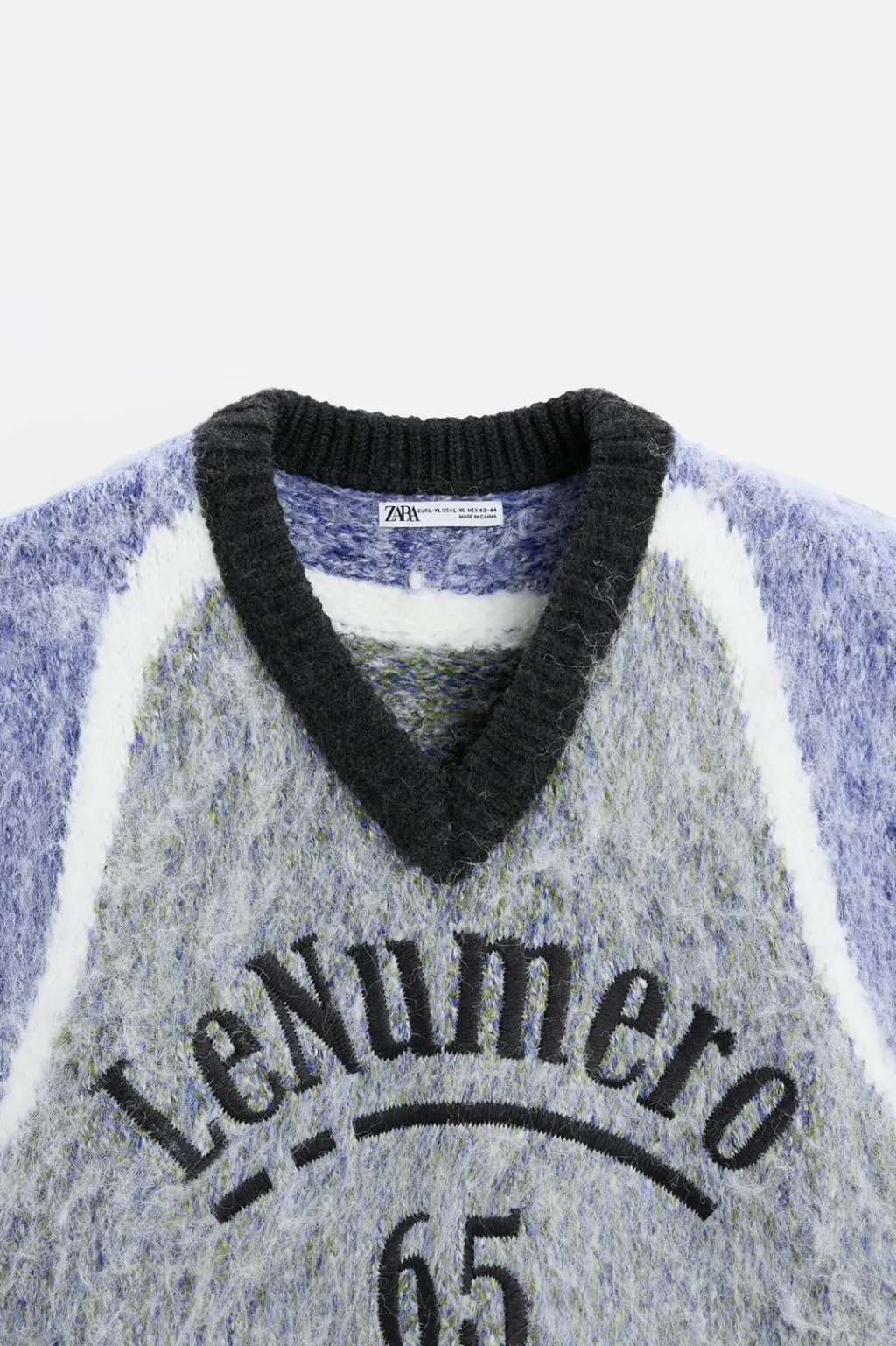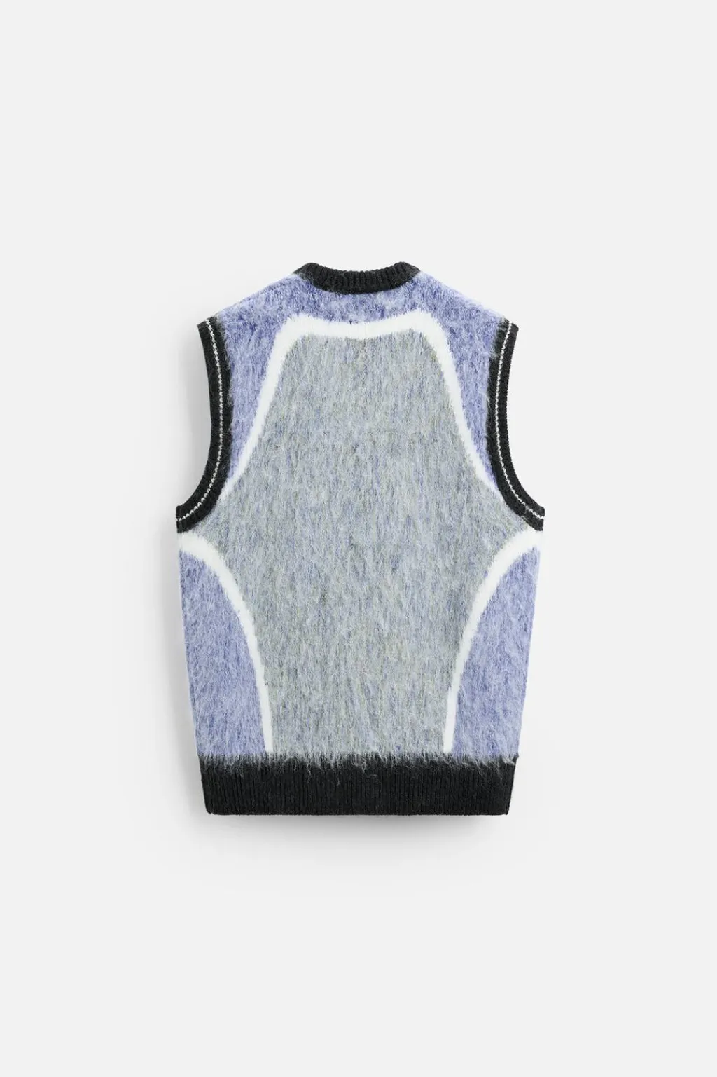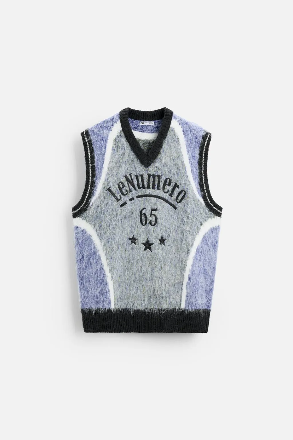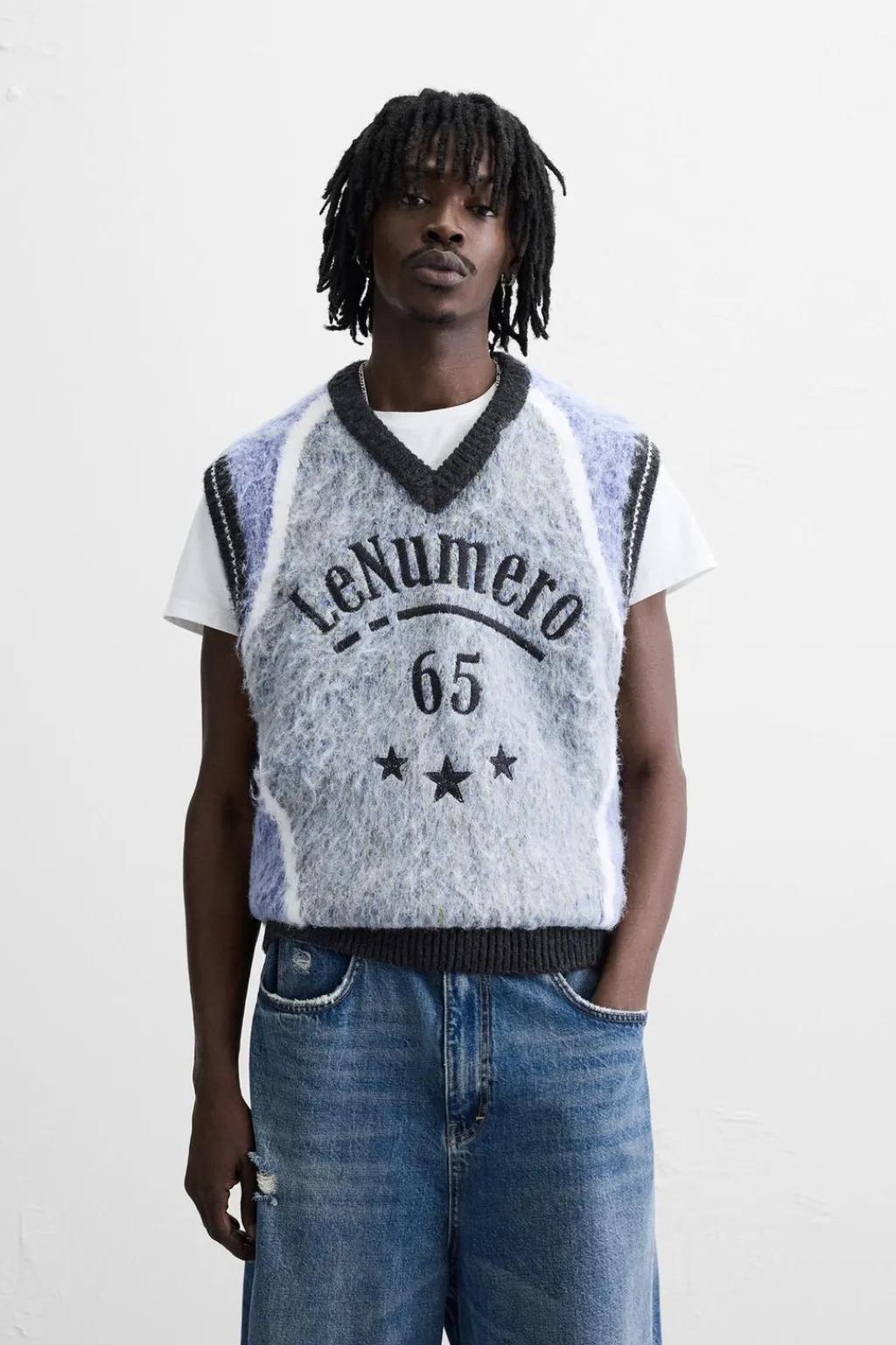 Chaleco relaxed fit tejido en hilatura con textura. Cuello pico y manga sisa. Bordados combinados a contraste en delantero. Acabados en rib combinados a contraste.
