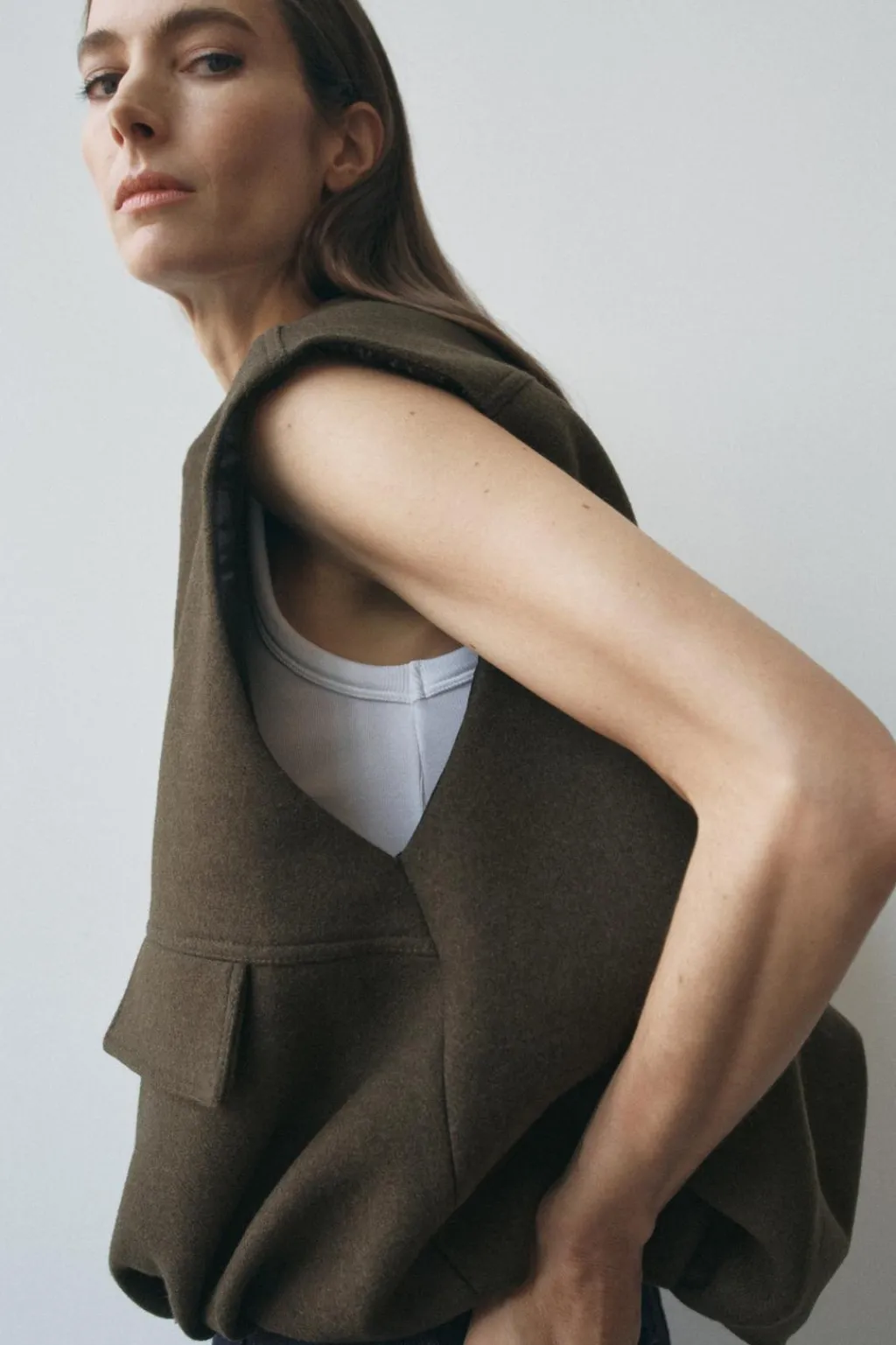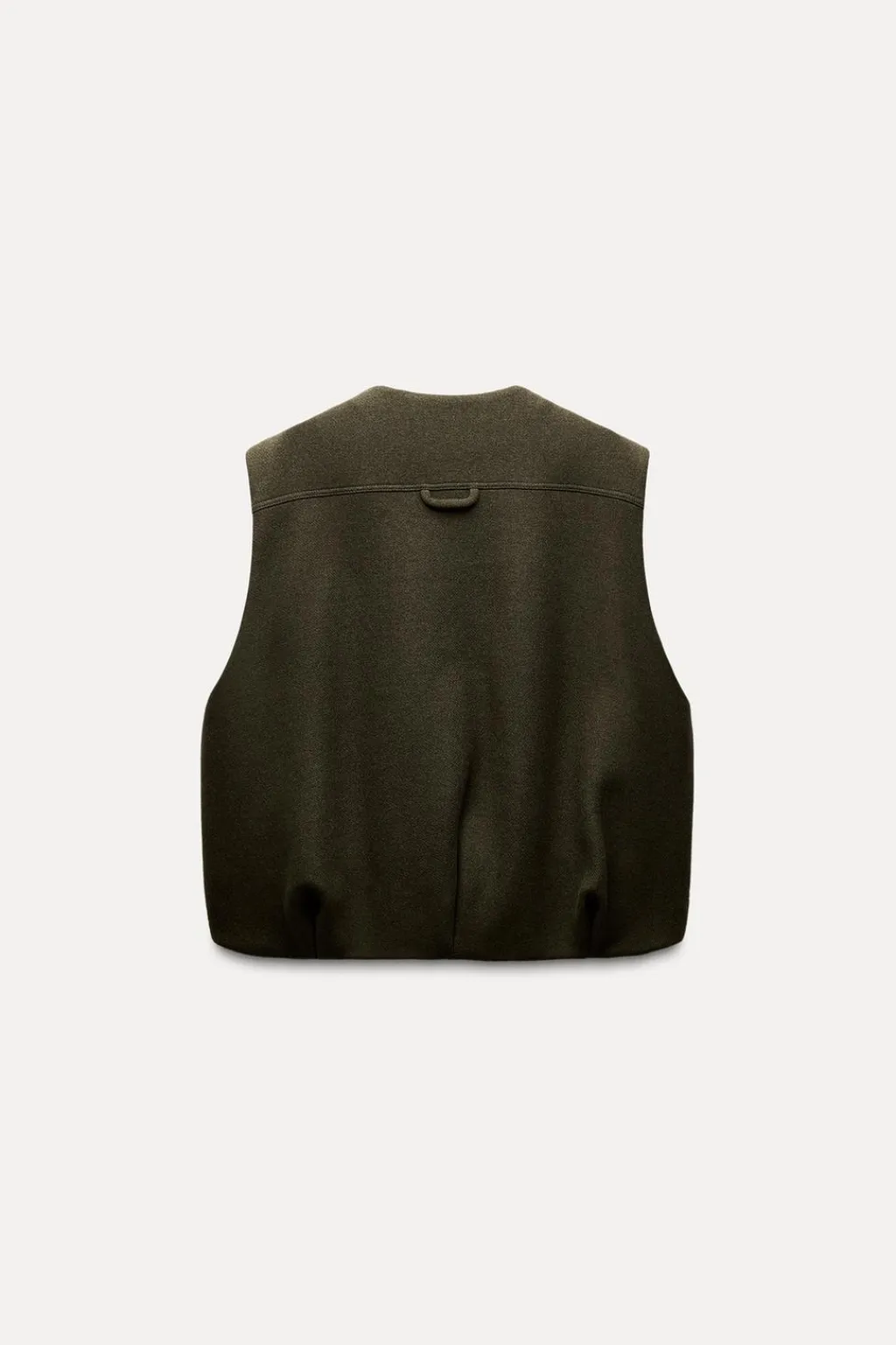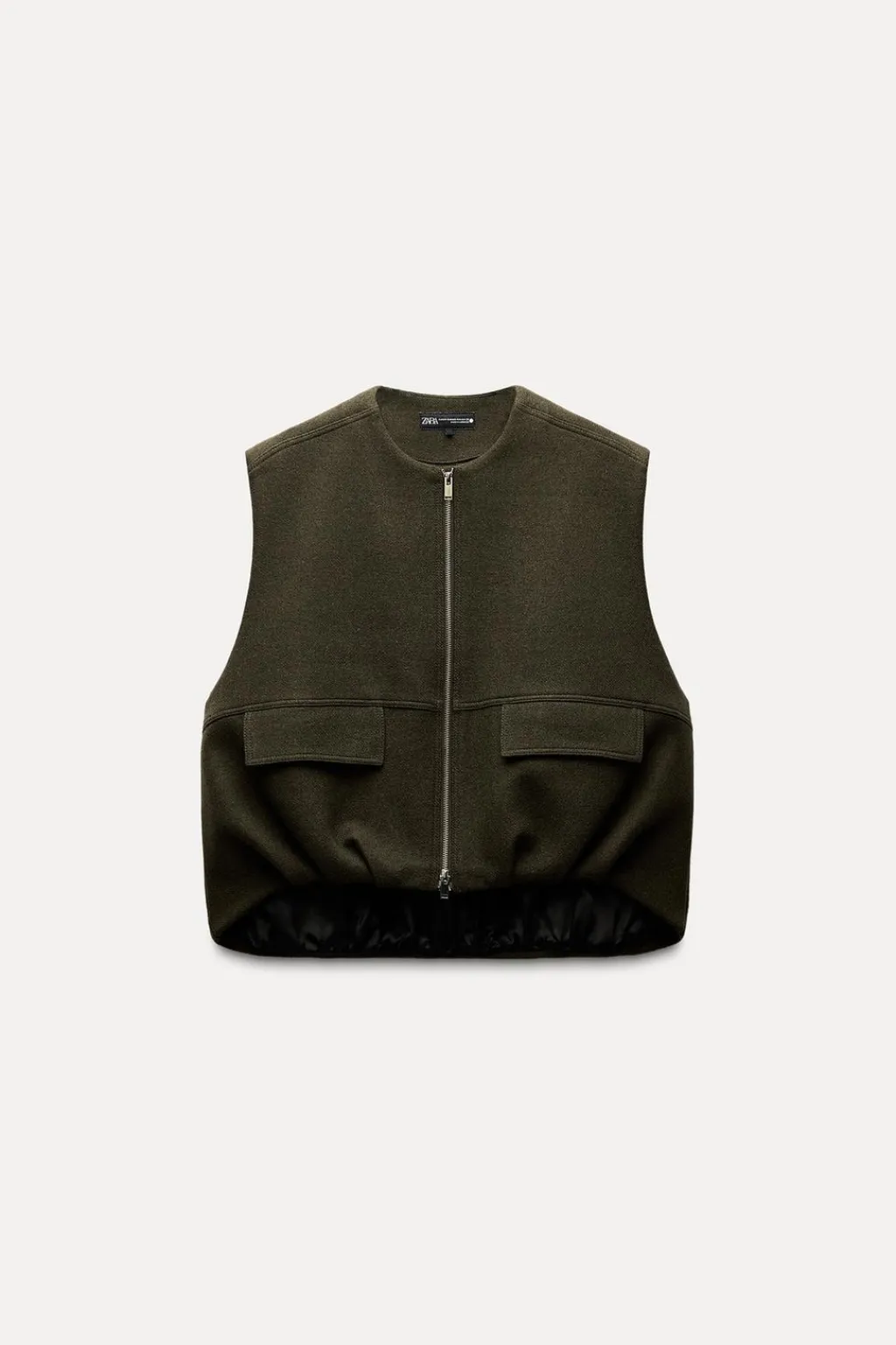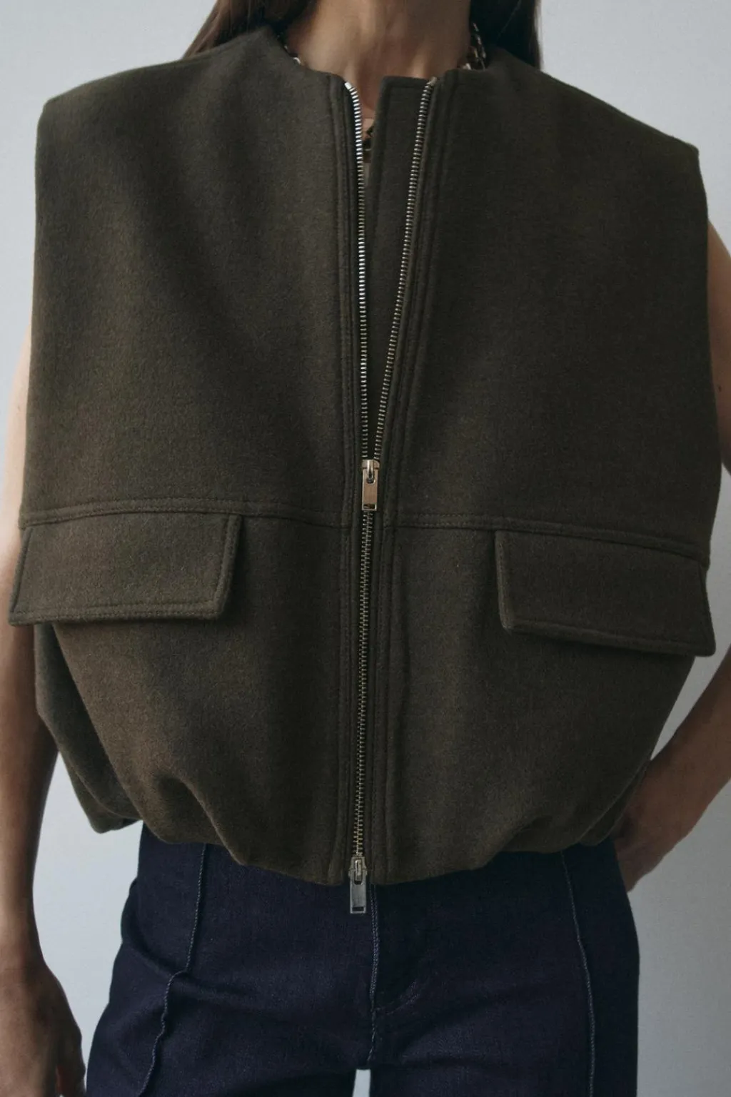 Chaleco oversize confeccionado en hilatura con mezcla de lana. Cuello redondo y manga sisa. Bolsillos con solapa en delantero. Bajo acabado en volumen con pliegues. Forro interior. Cierre frontal con cremallera metálica.