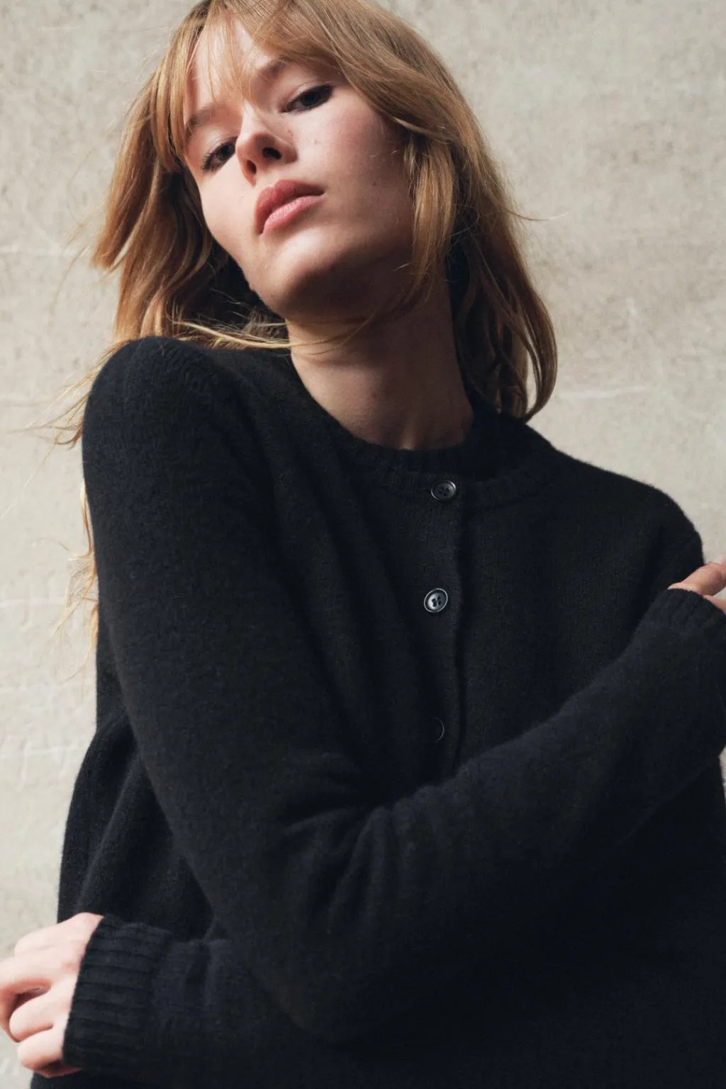 Chaqueta confeccionada en 100% lana. Cuello redondo y manga larga. Cierre frontal con botones. Acabados en rib.