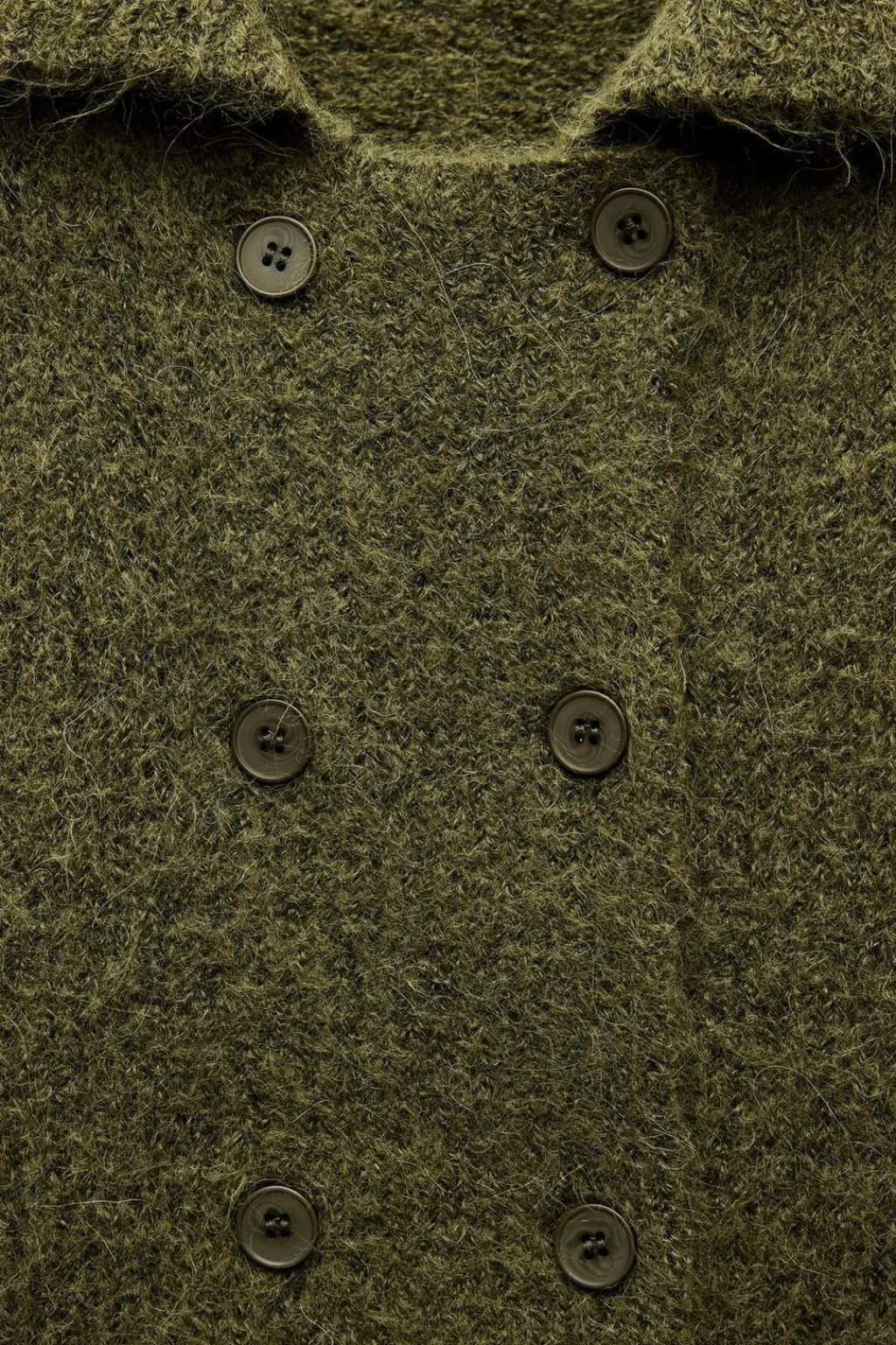 Chaqueta de cuello solapa y manga larga. Cierre frontal cruzado con botones. Acabados en rib.