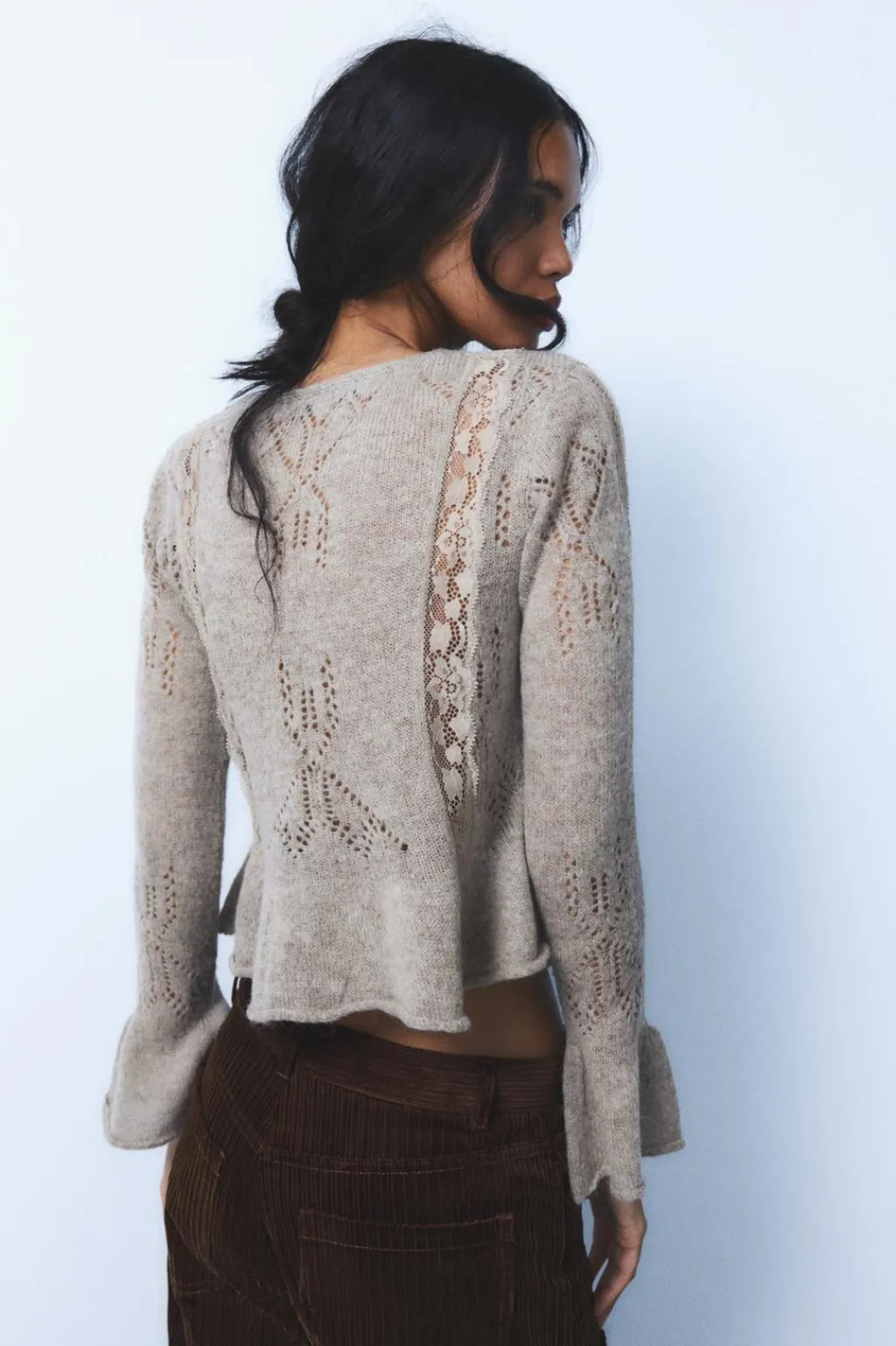 Chaqueta de escote pico y manga larga. Detalle de tejido perforado y combinado con encaje. Acabados con volantes. Cierre frontal con lazos.