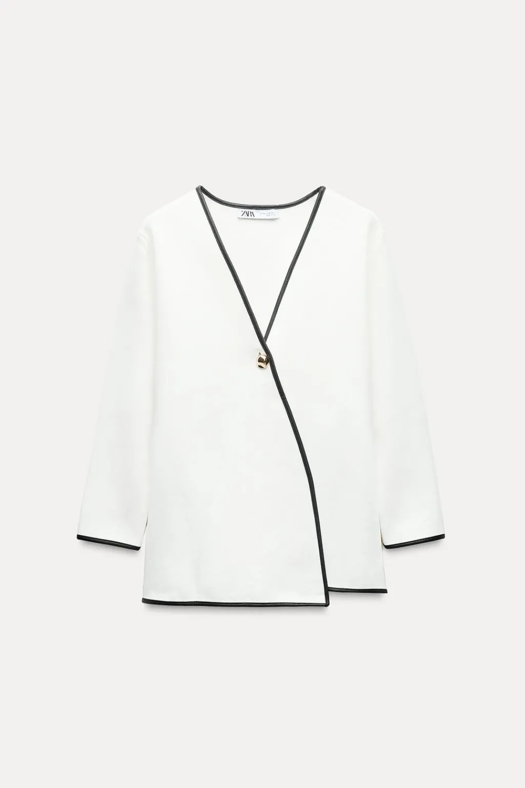 Blazer de escote pico y manga larga. Detalle de vivos combinados efecto piel. Cierre frontal cruzado con un botón dorado.