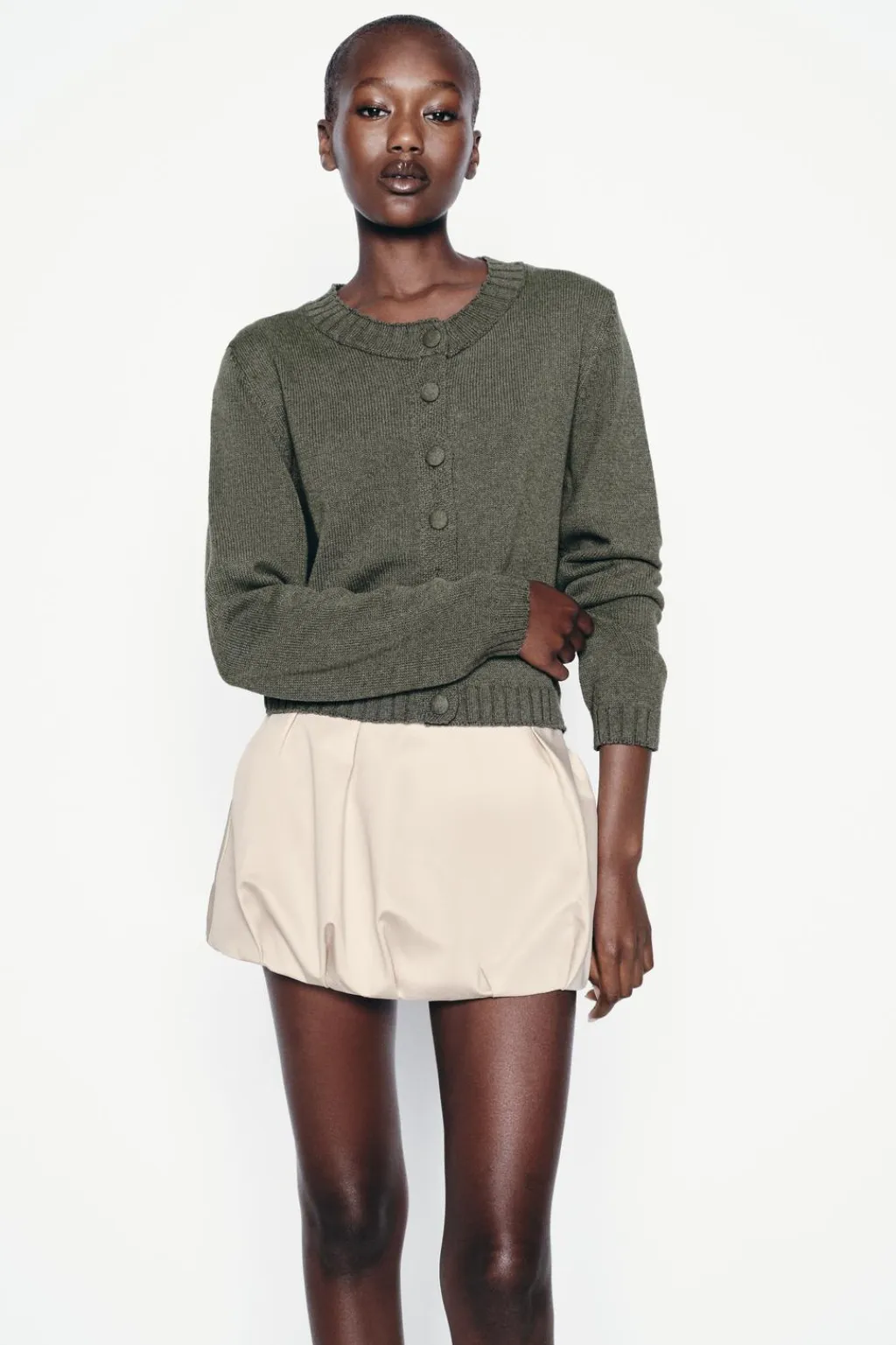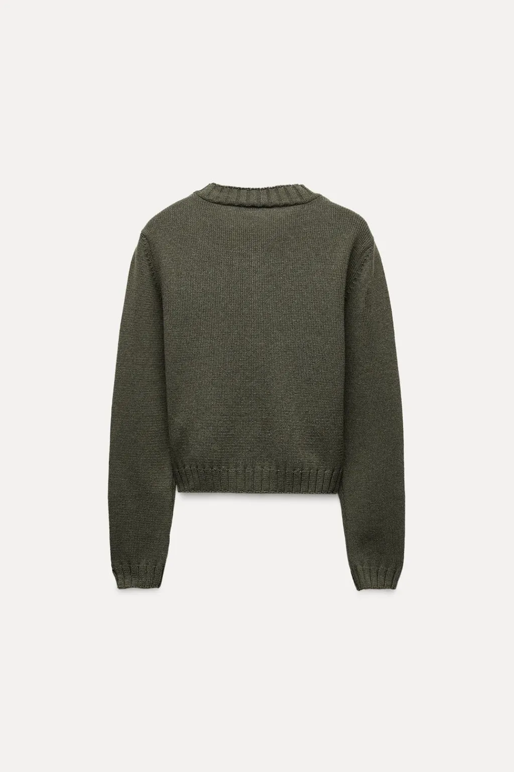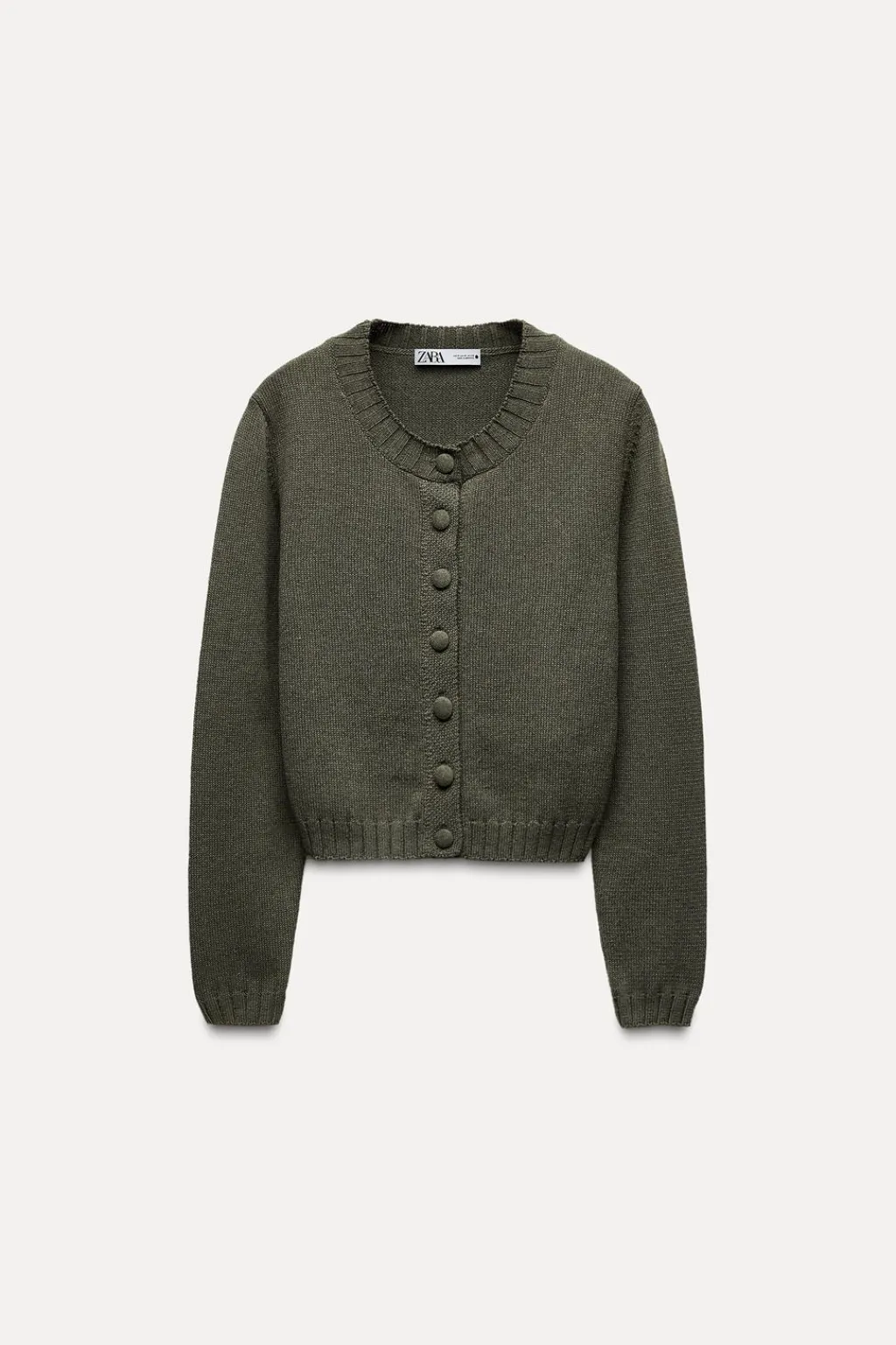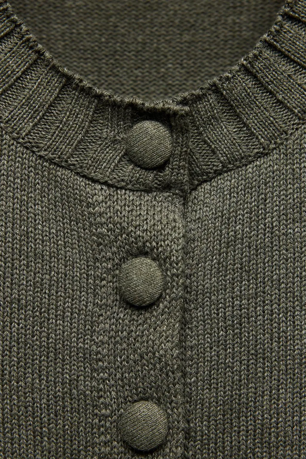 Chaqueta de cuello redondo y manga larga. Acabados en rib. Cierre frontal con botones forrados a tono.