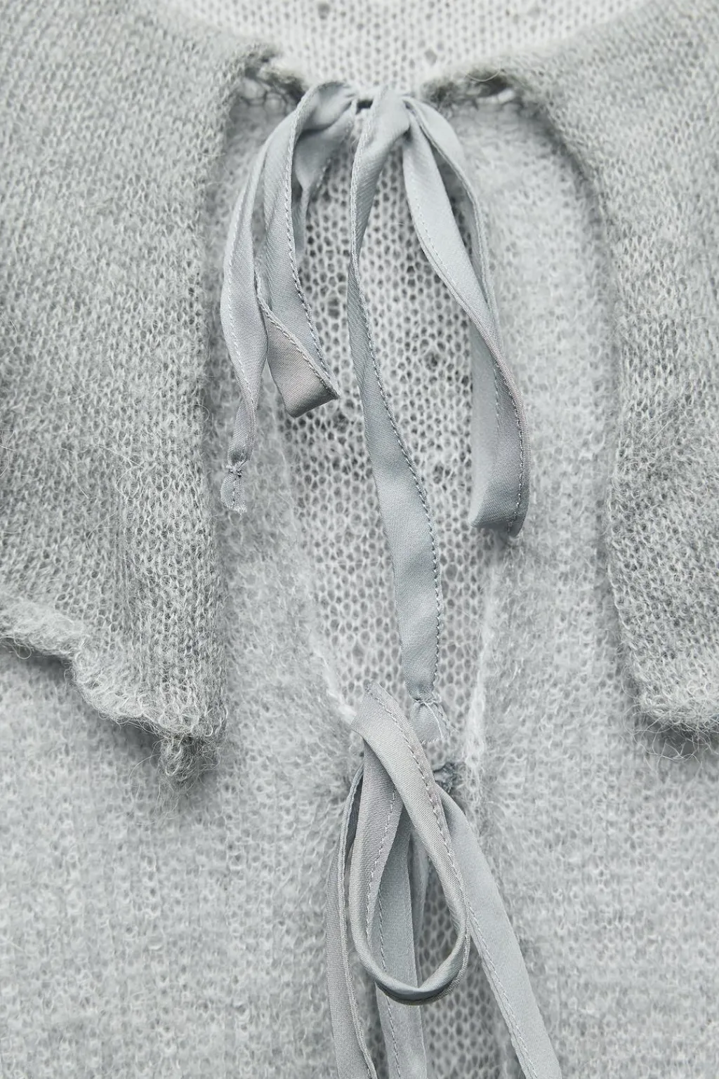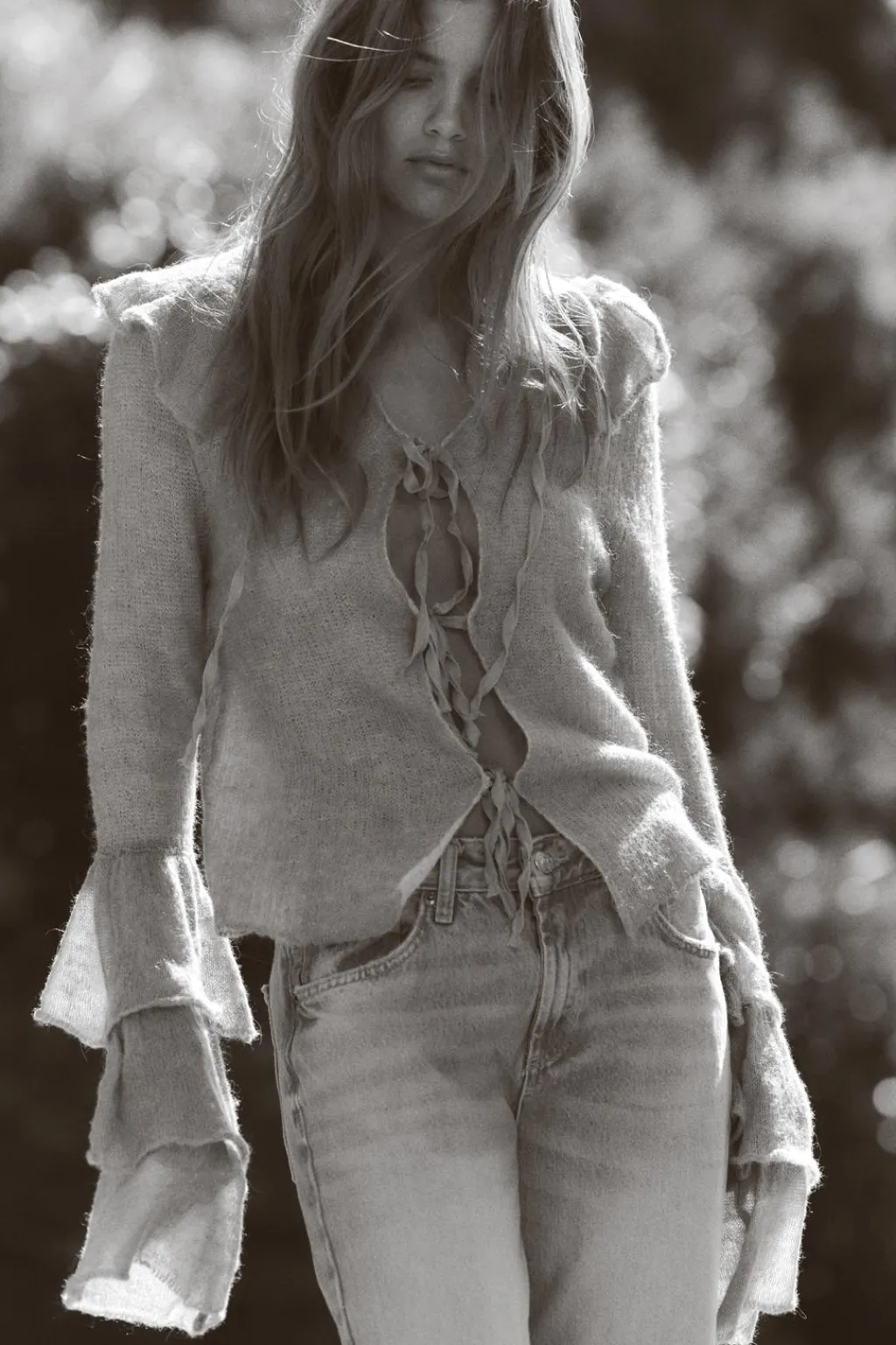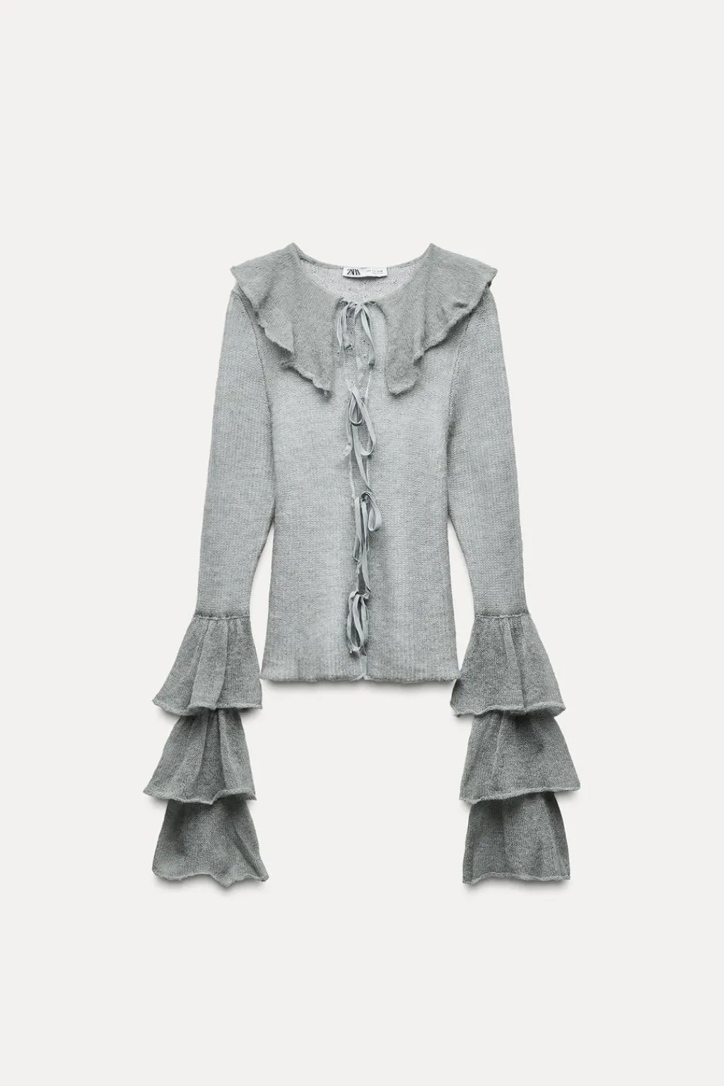 Chaqueta de punto fino con alpaca y lana. Cuello bobo y manga larga. Detalle de acabados con volantes. Cierre frontal con lazos.