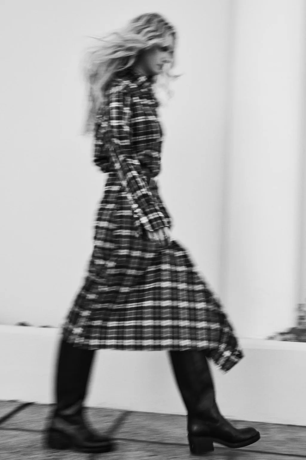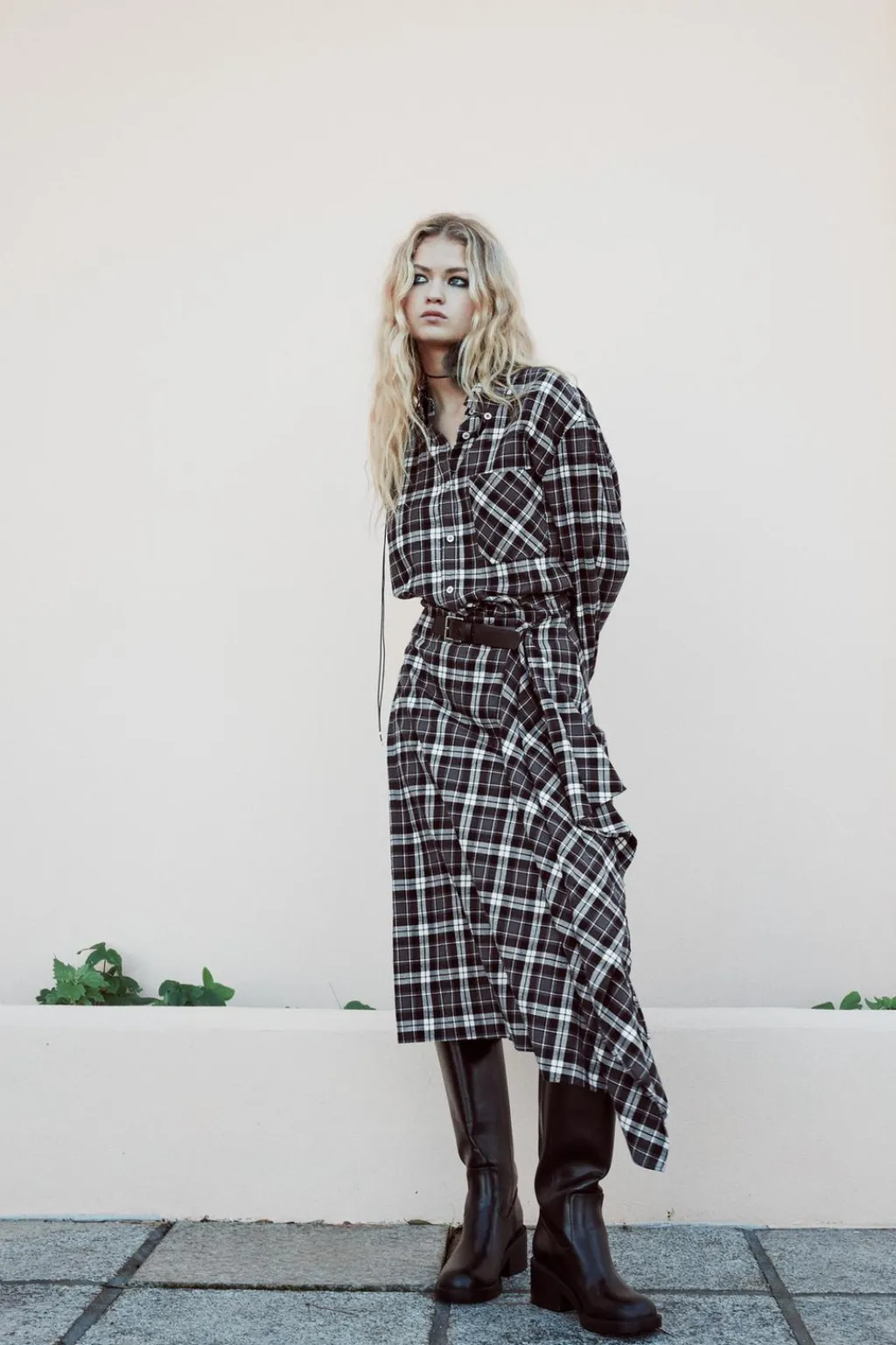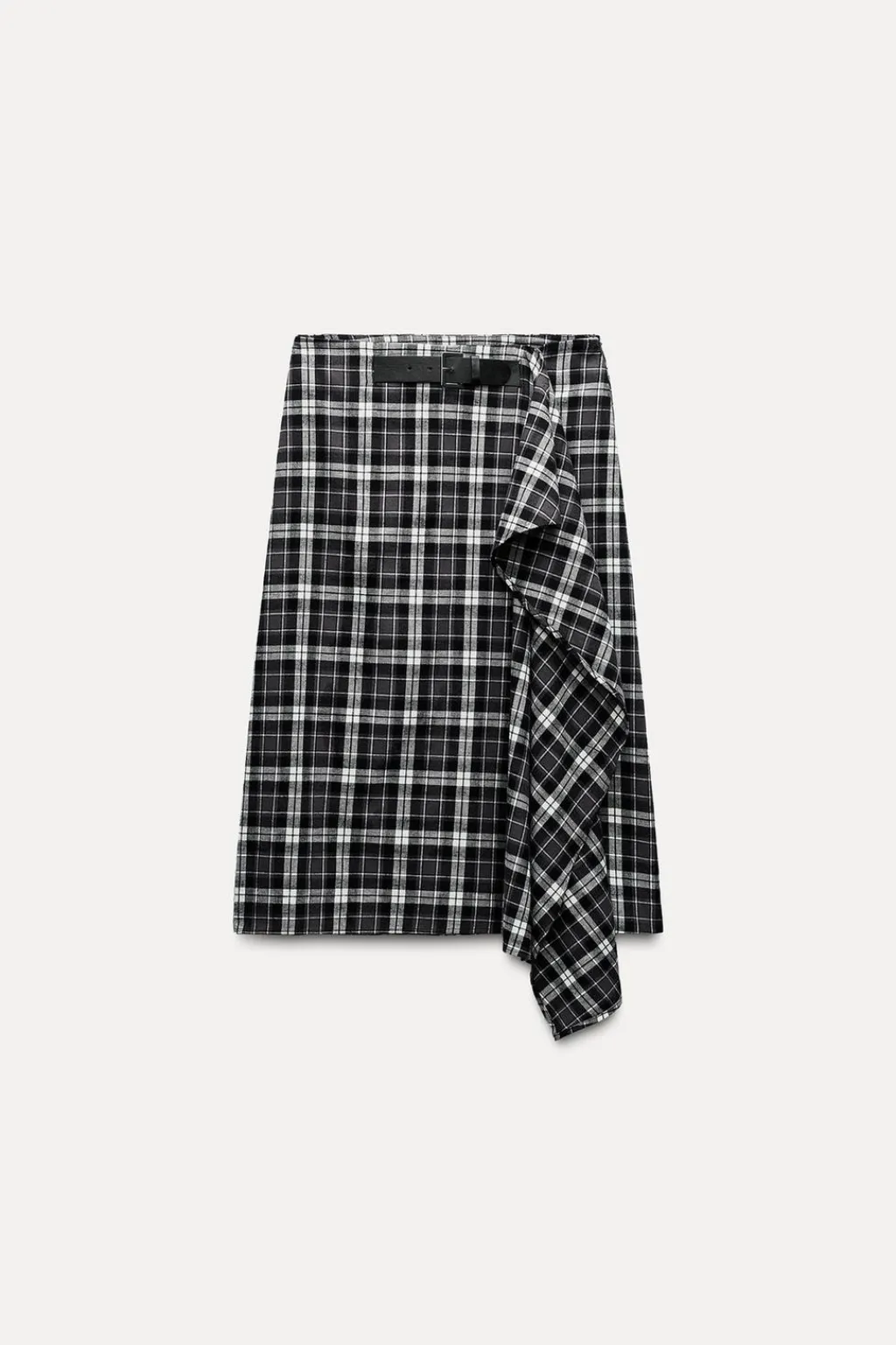 Falda confeccionada en tejido de algodón con acabado franela. Tiro medio con detalle de cinturón con hebilla metálica. Tejido lateral con volante. Cierre con cremallera oculta en costura.
