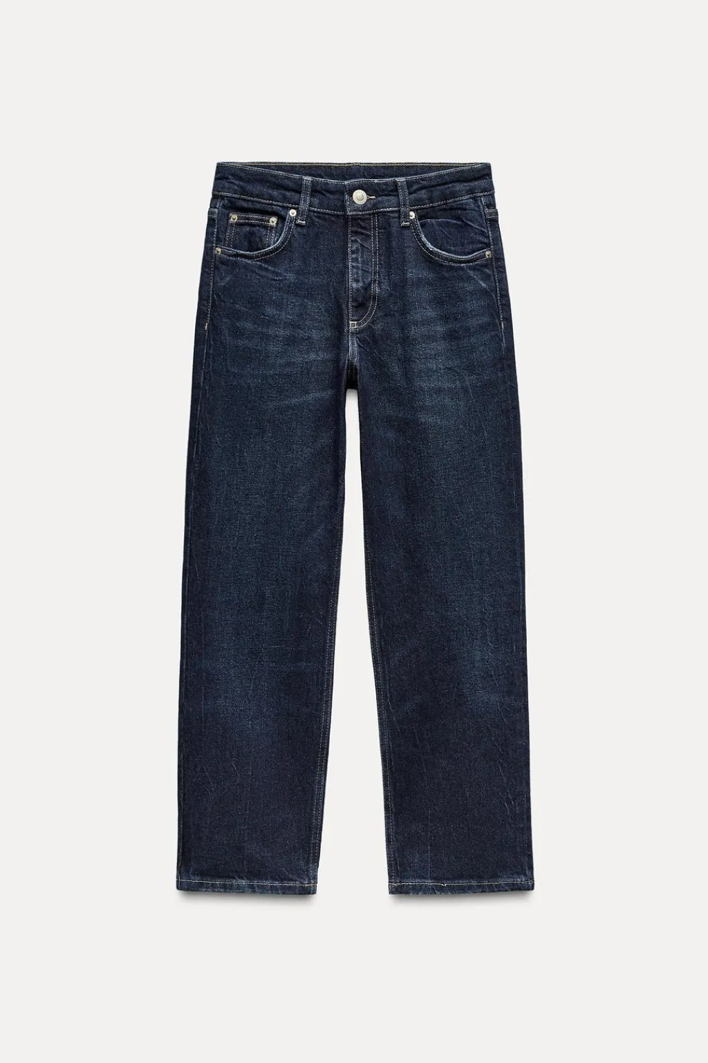 Jeans de tiro medio con trabillas y cinco bolsillos. Bajo acabado cropped flare. Cierre frontal con cremallera y botón metálico.