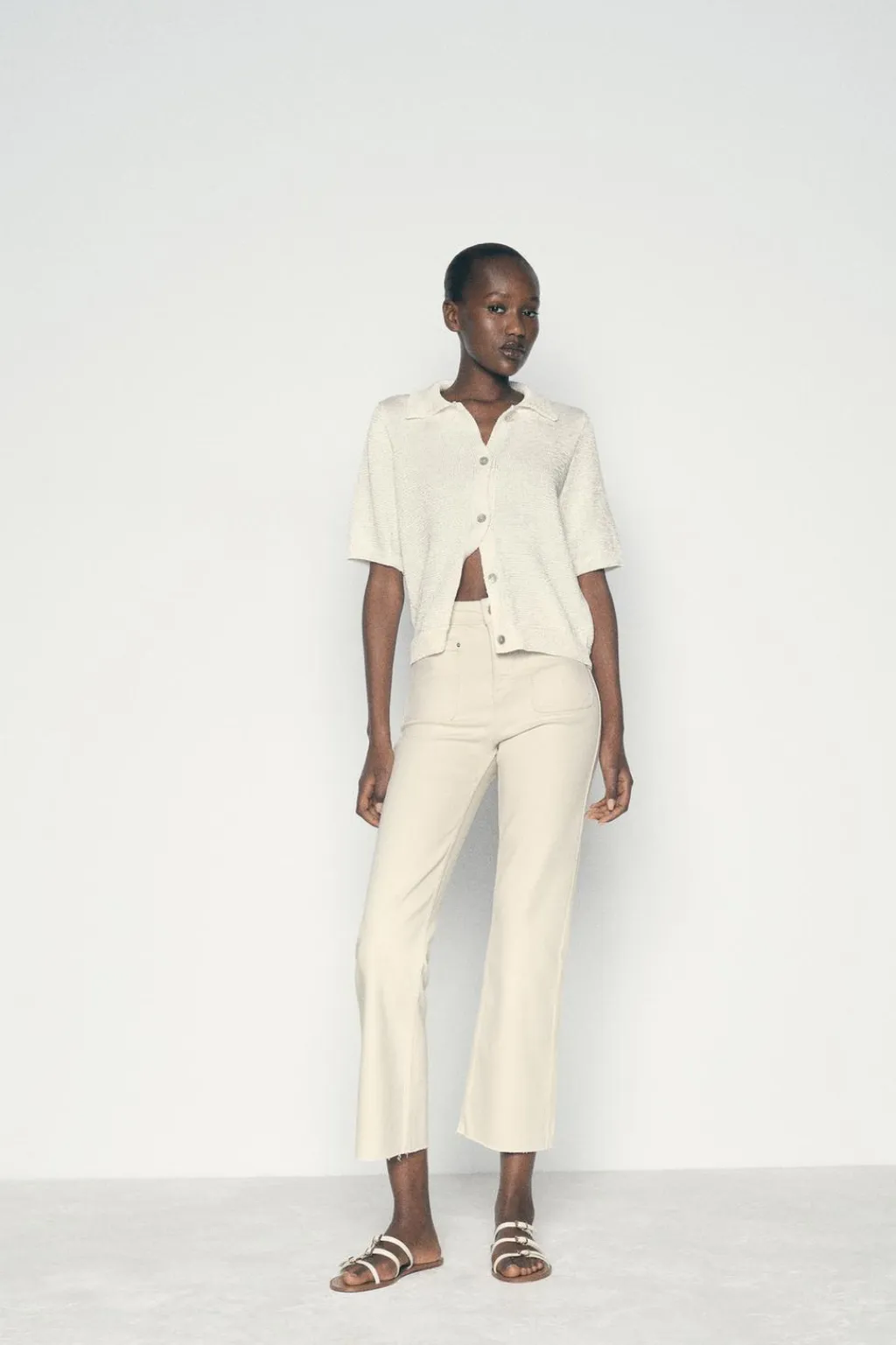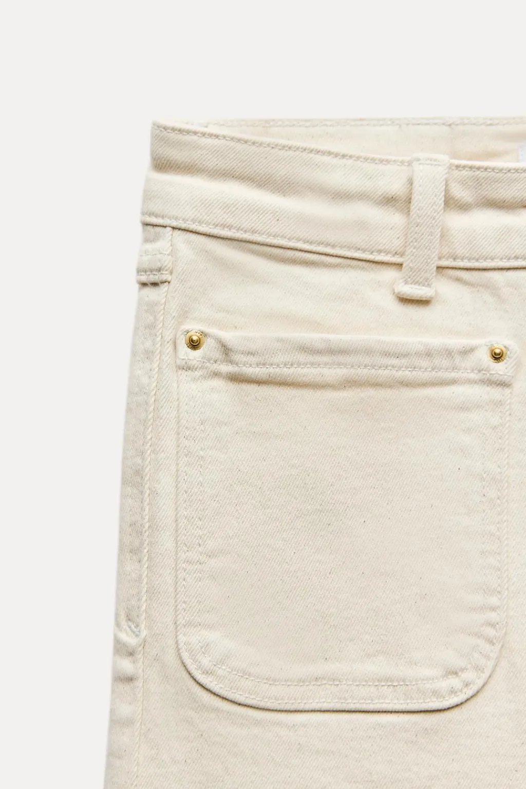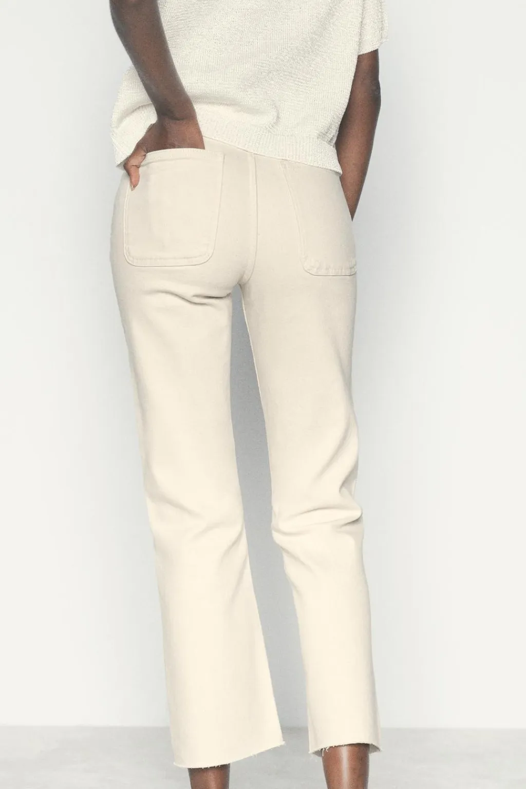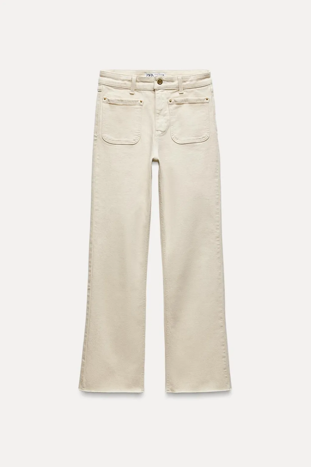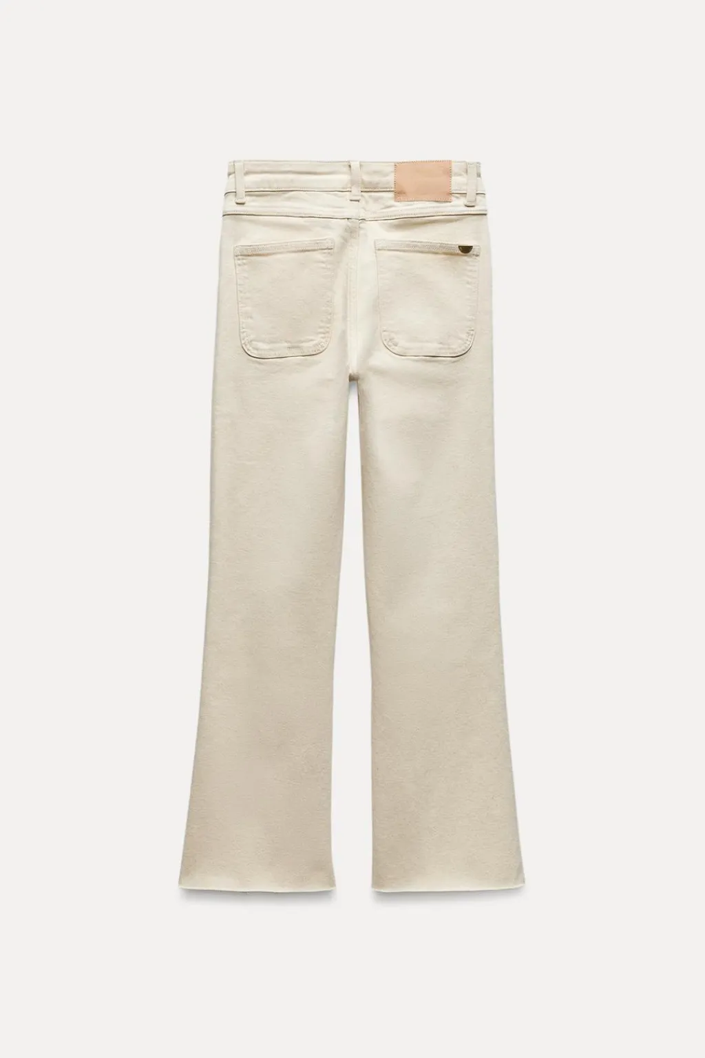 Jeans tobilleros de tiro alto con bolsillos de plastrón en delantero y espalda. Bajo en evasé acabado sin costura. Cierre frontal con cremallera y botón.