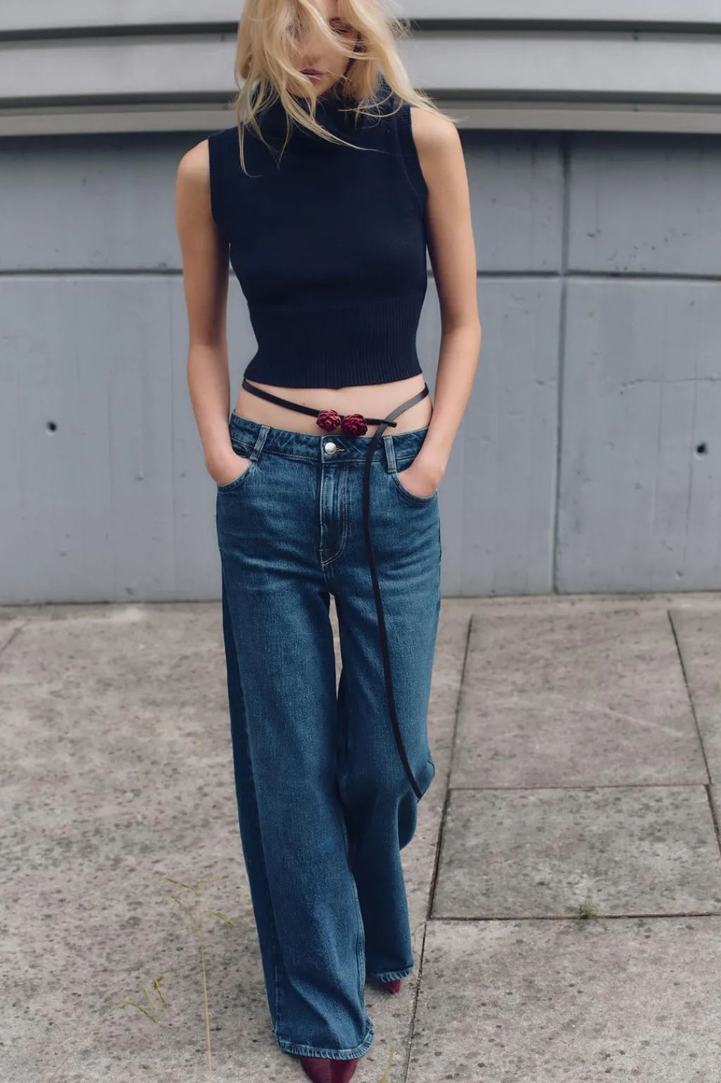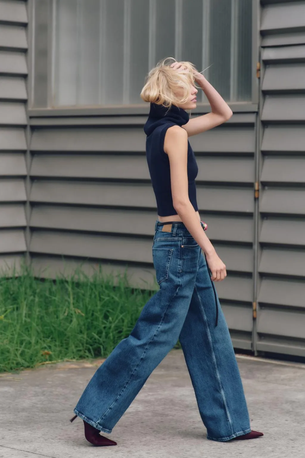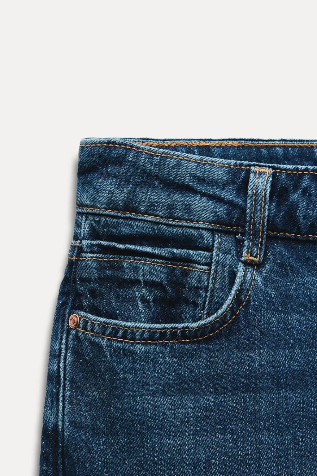Jeans de tiro alto con cinco bolsillos. Pernera ancha. Cierre frontal con cremallera y botón metálico.