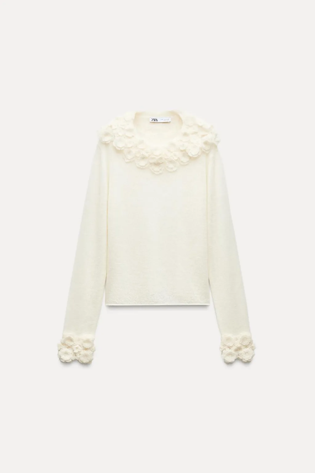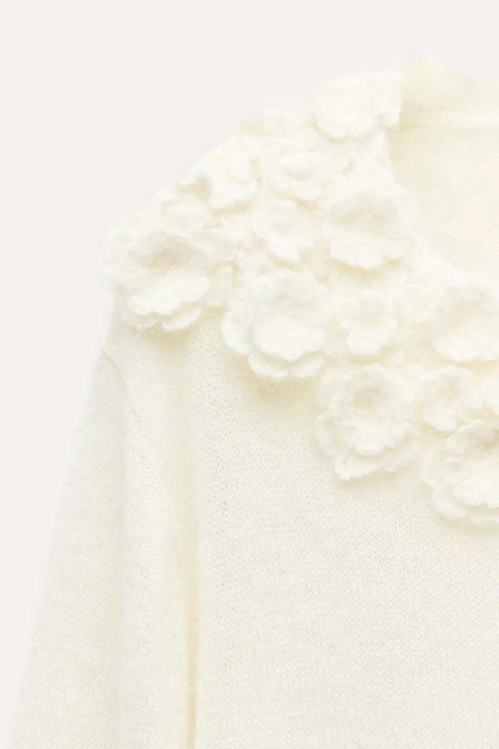 Jersey confeccionado con alpaca y lana. Cuello redondo amplio y manga larga. Detalle de acabados con flores en crochet.