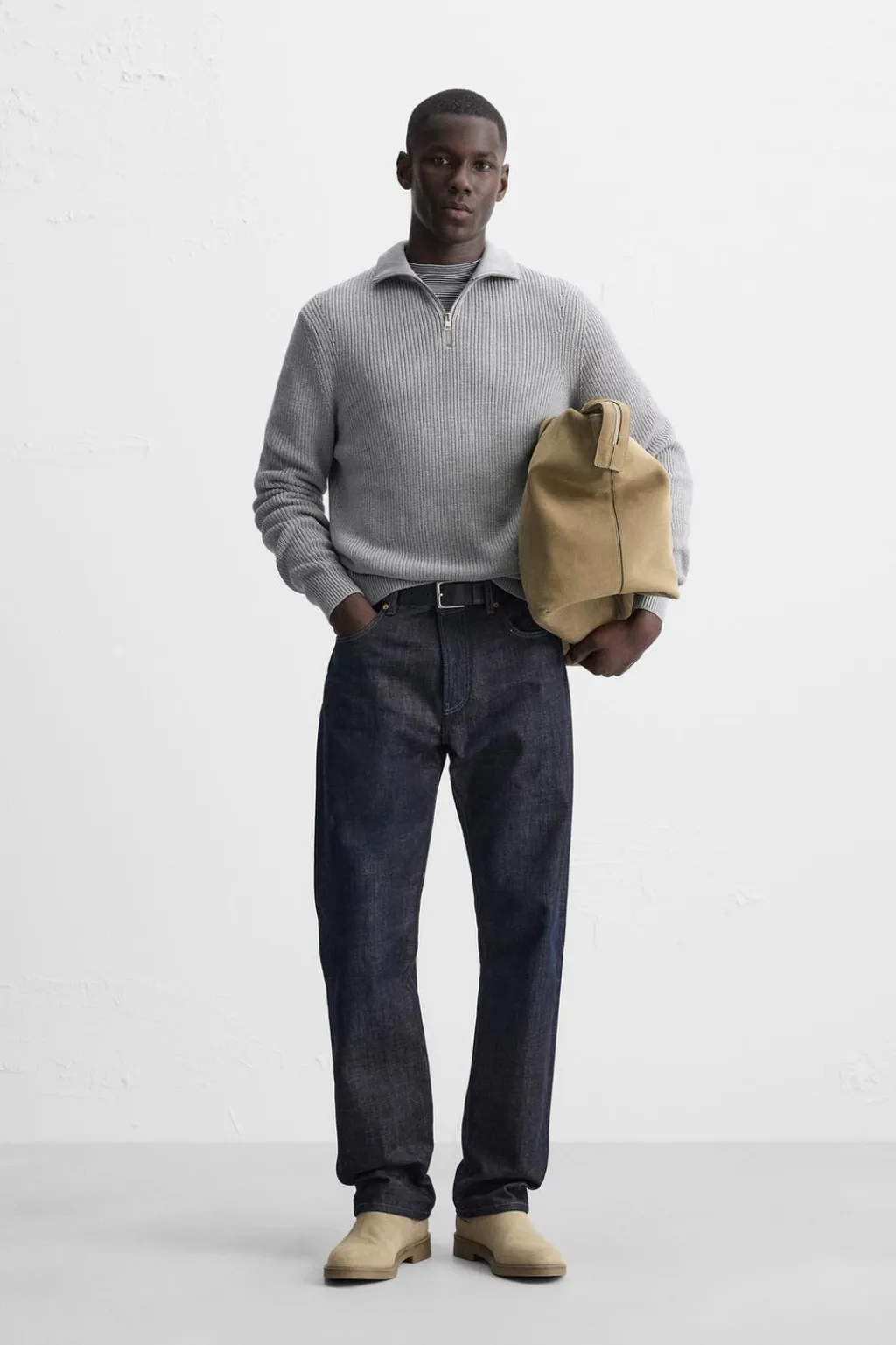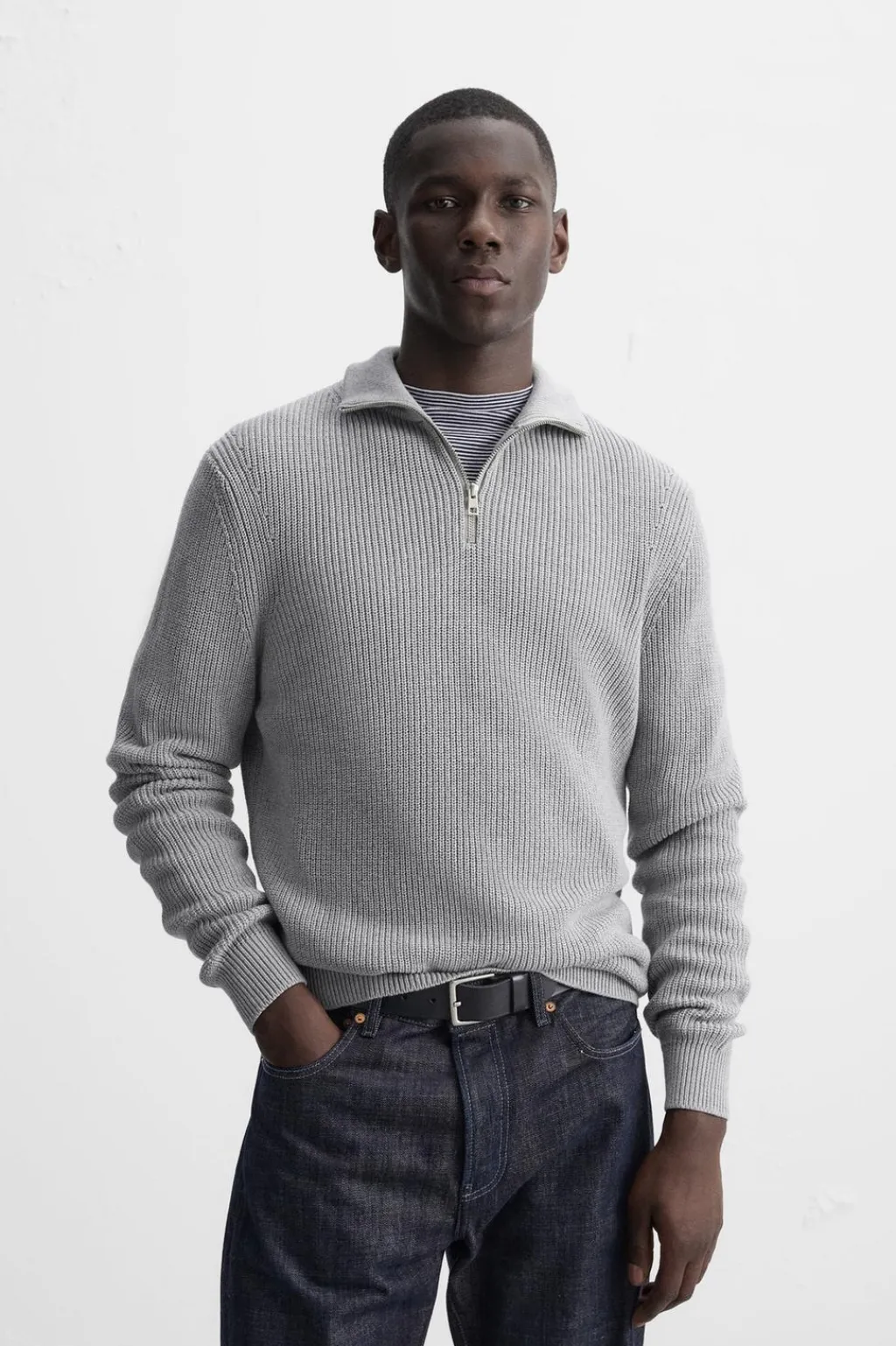 Jersey tejido en hilatura de algodón. Cuello perkins con cierre frontal de cremallera. Manga larga. Acabados en rib.