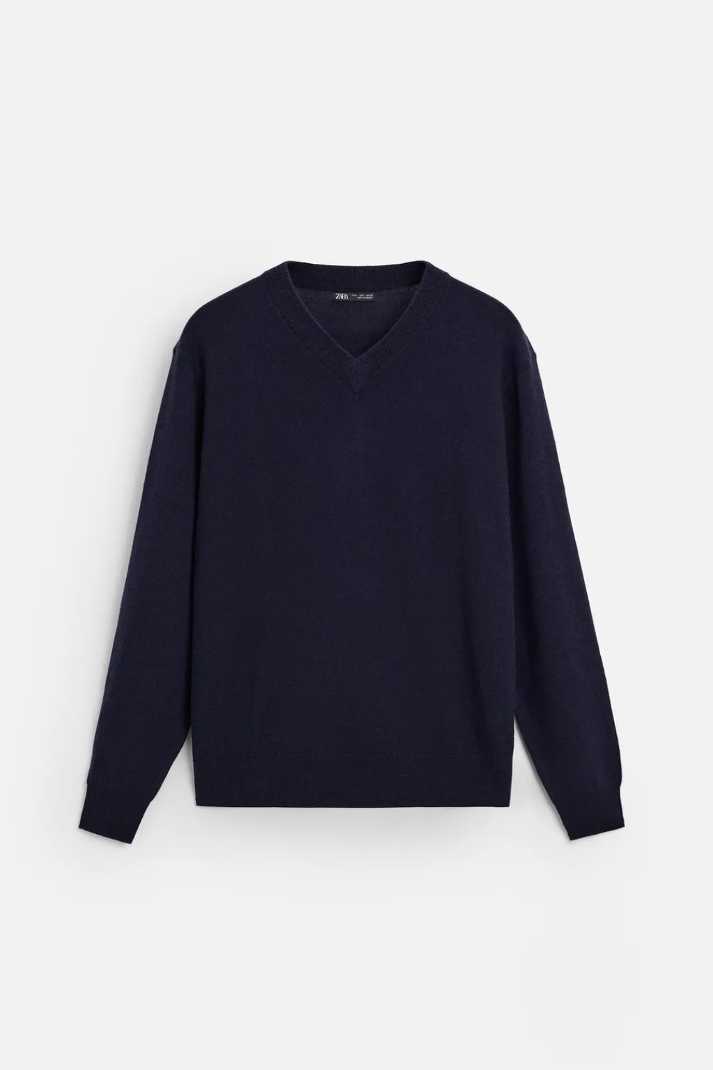 Jersey regular fit tejido en hilatura con mezcla de lana y cashmere. Cuello pico y manga larga. Acabados en rib.