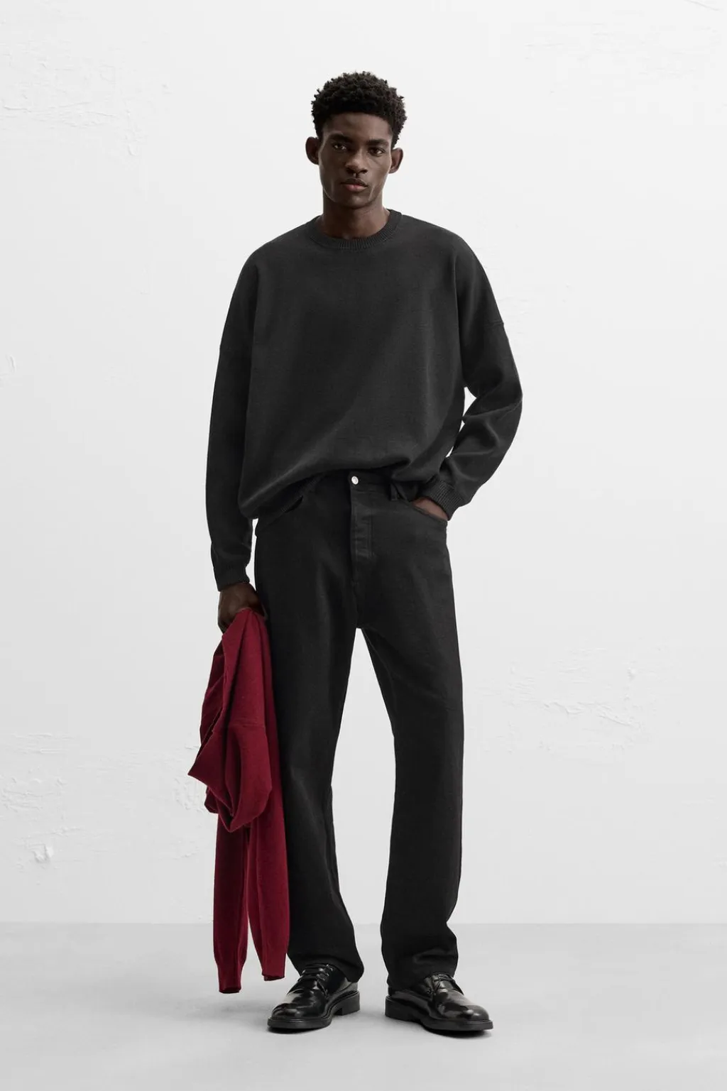Jersey oversize fit tejido en hilatura de algodón. Cuello redondo y manga larga. Acabados en rib.