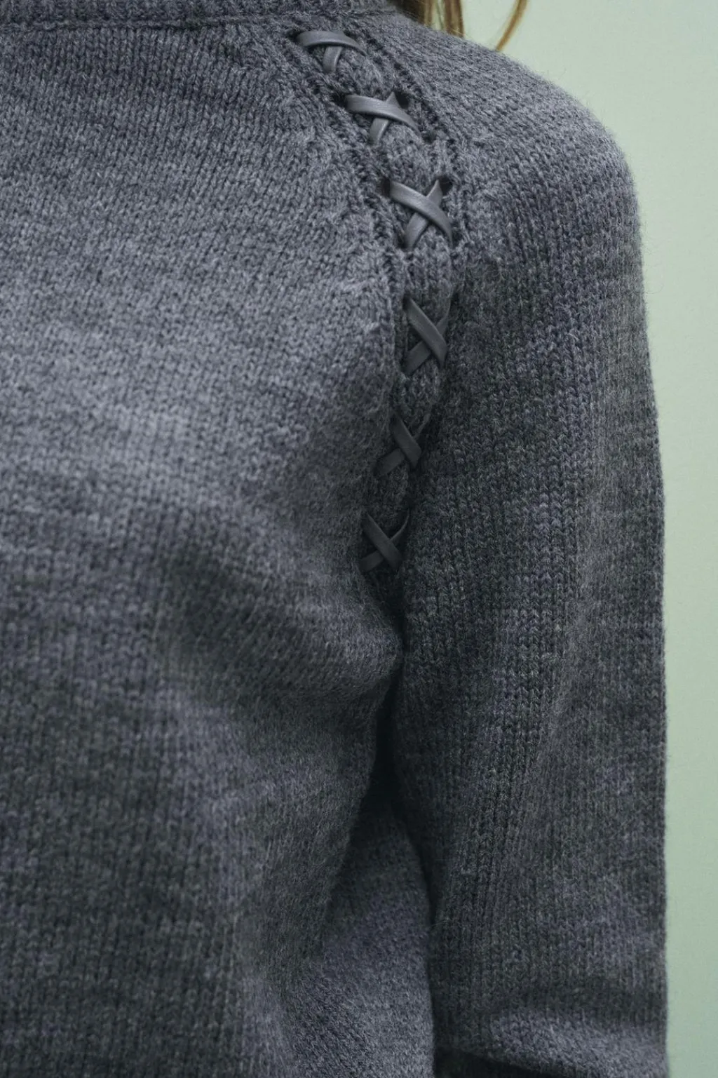Jersey de cuello redondo y manga larga. Detalle de cintas cruzadas efecto piel en hombros.