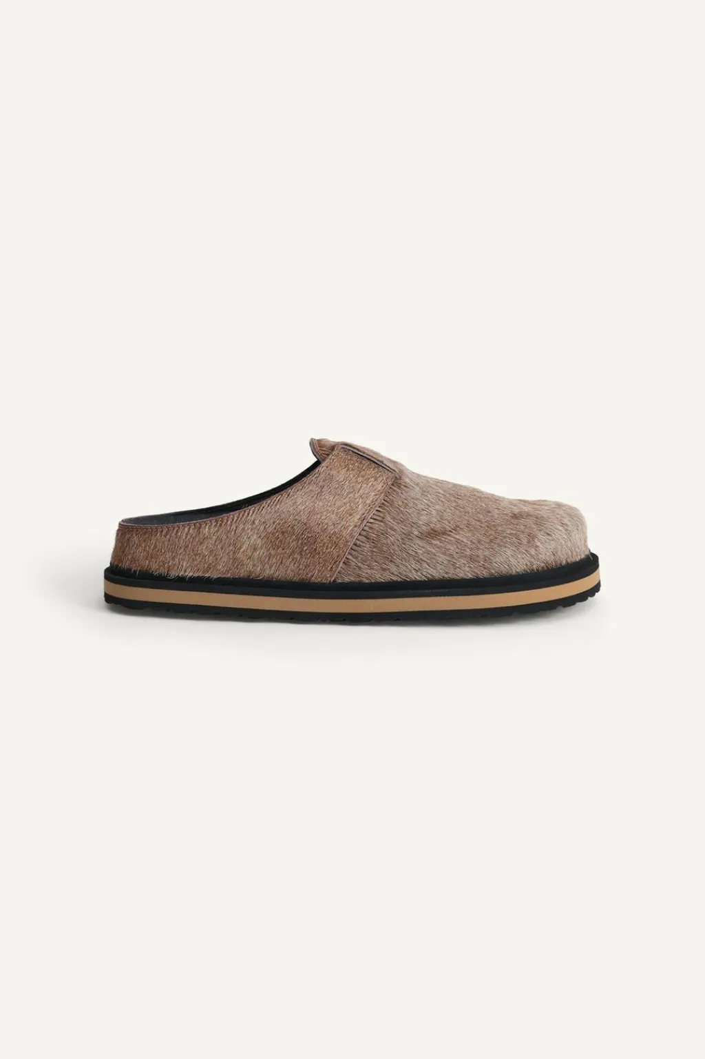 Zueco fabricado en piel con acabado pelo. Forro interior y plantilla en piel. Horma cuadrada. Suela con volumen a contraste de color.