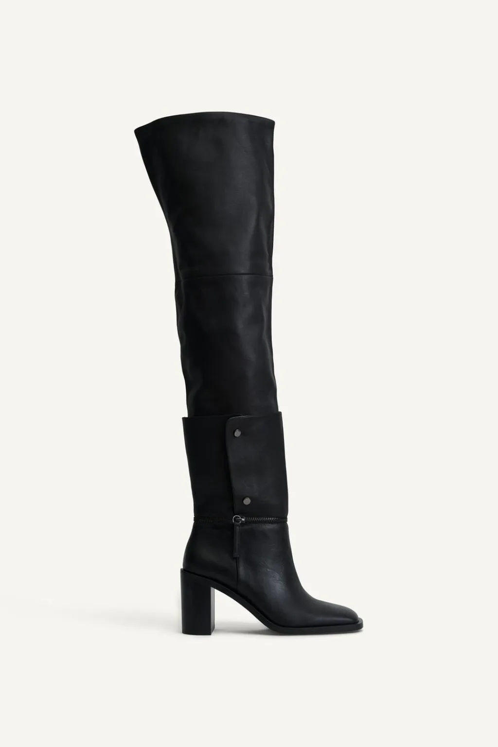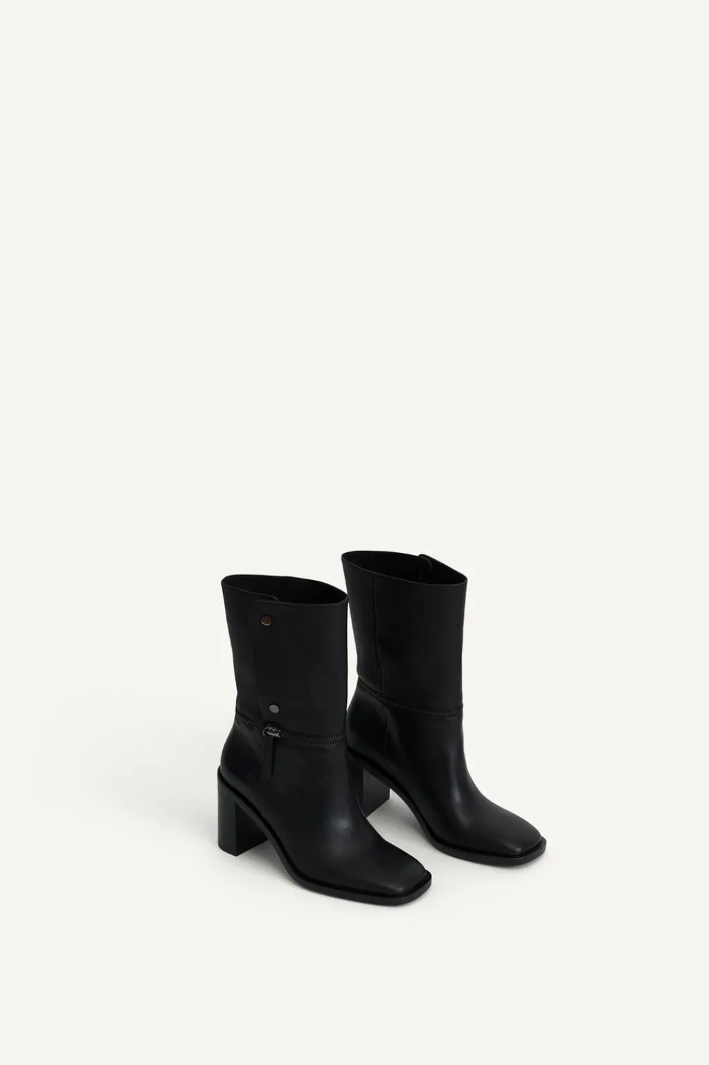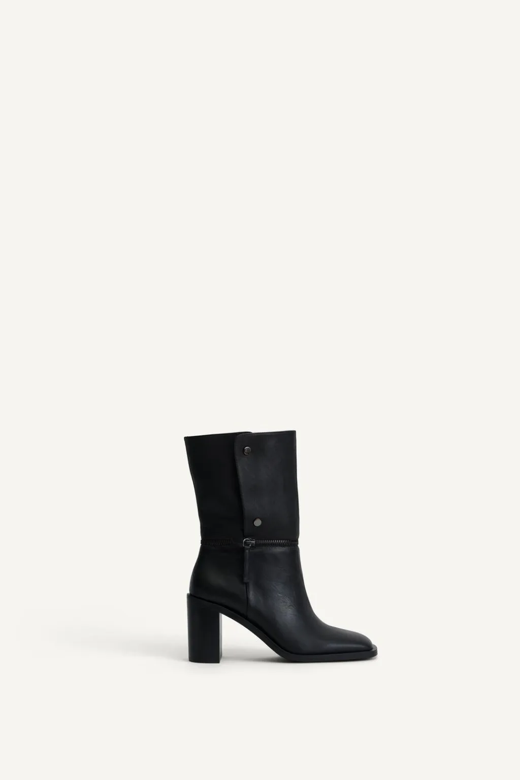 Zapato tipo bota multiposición en piel. Caña alta desmontable mediante botón. Tacón ancho. Detalle de cremallera en la caña. Acabada en punta cuadrada.