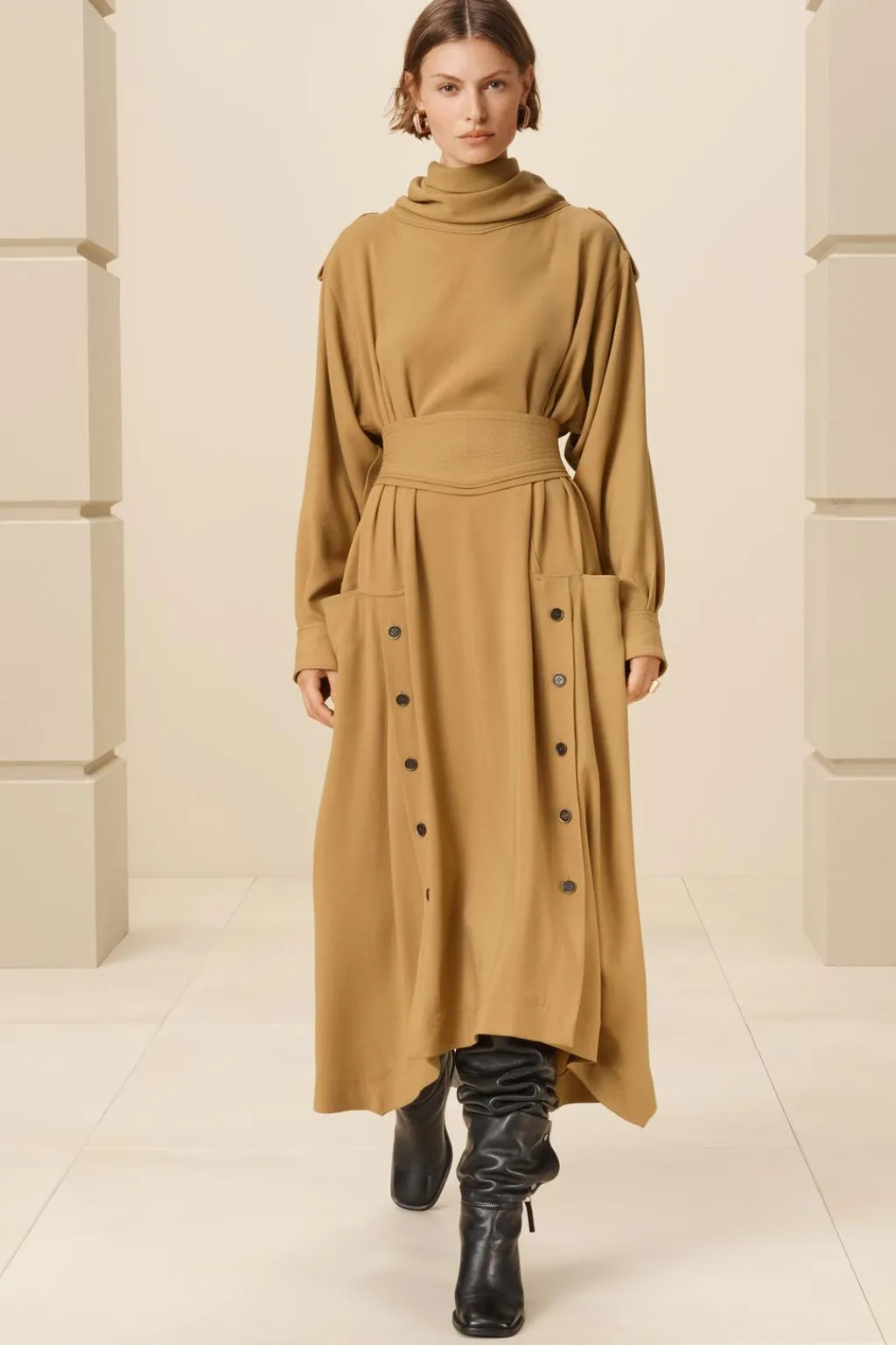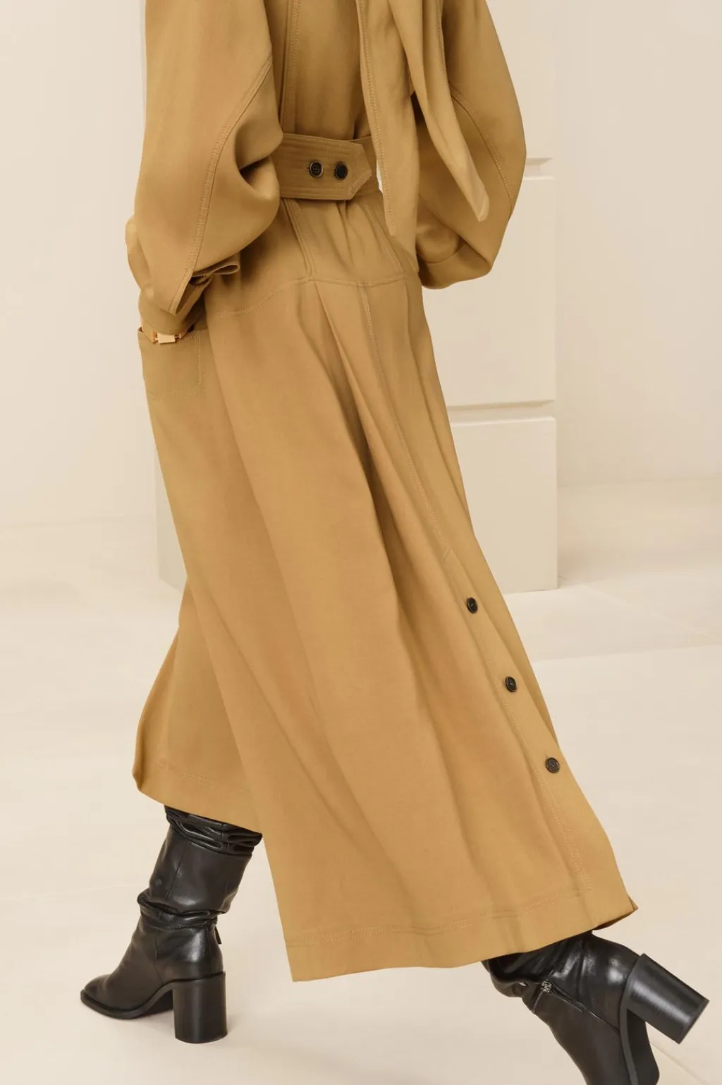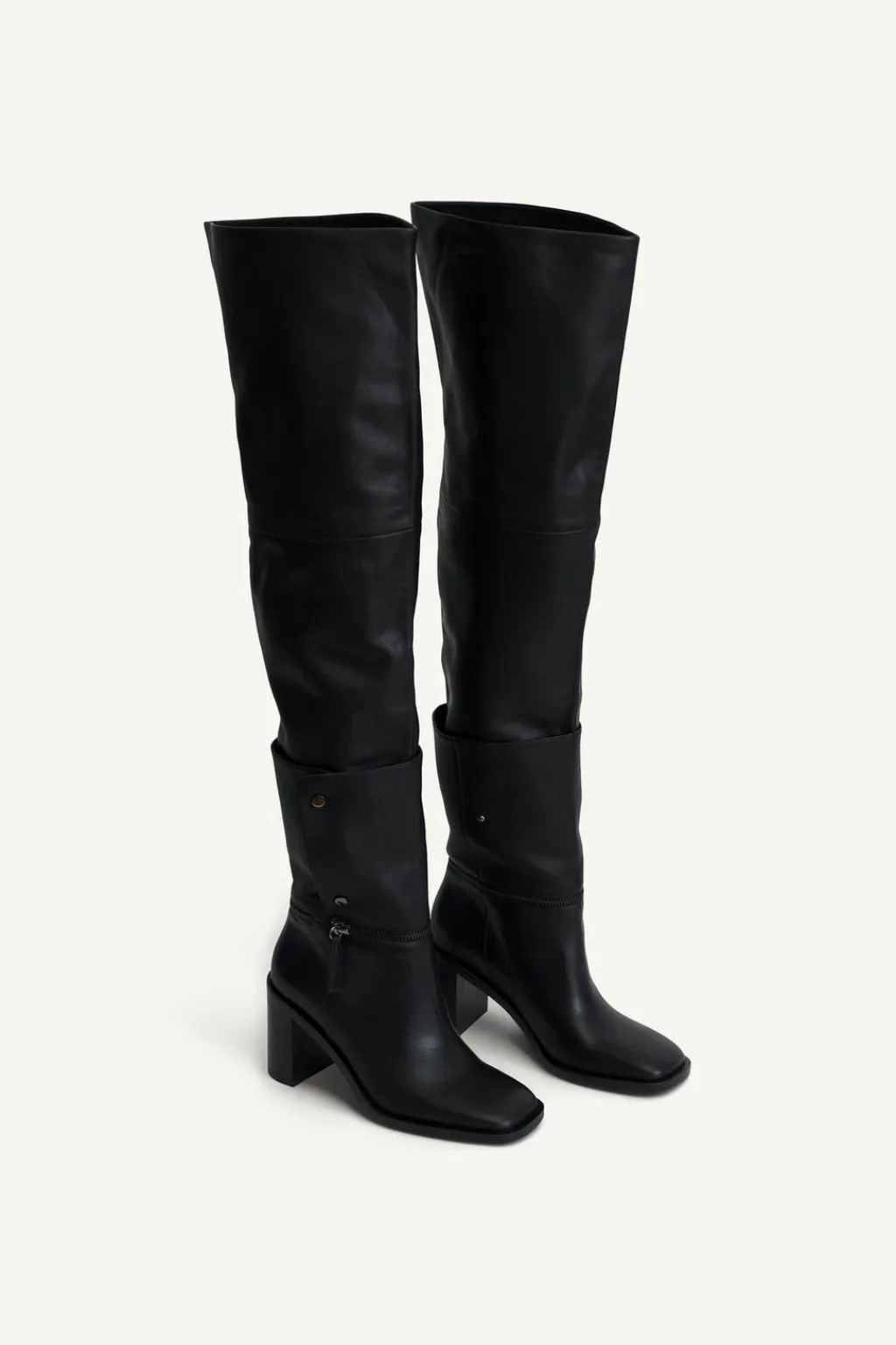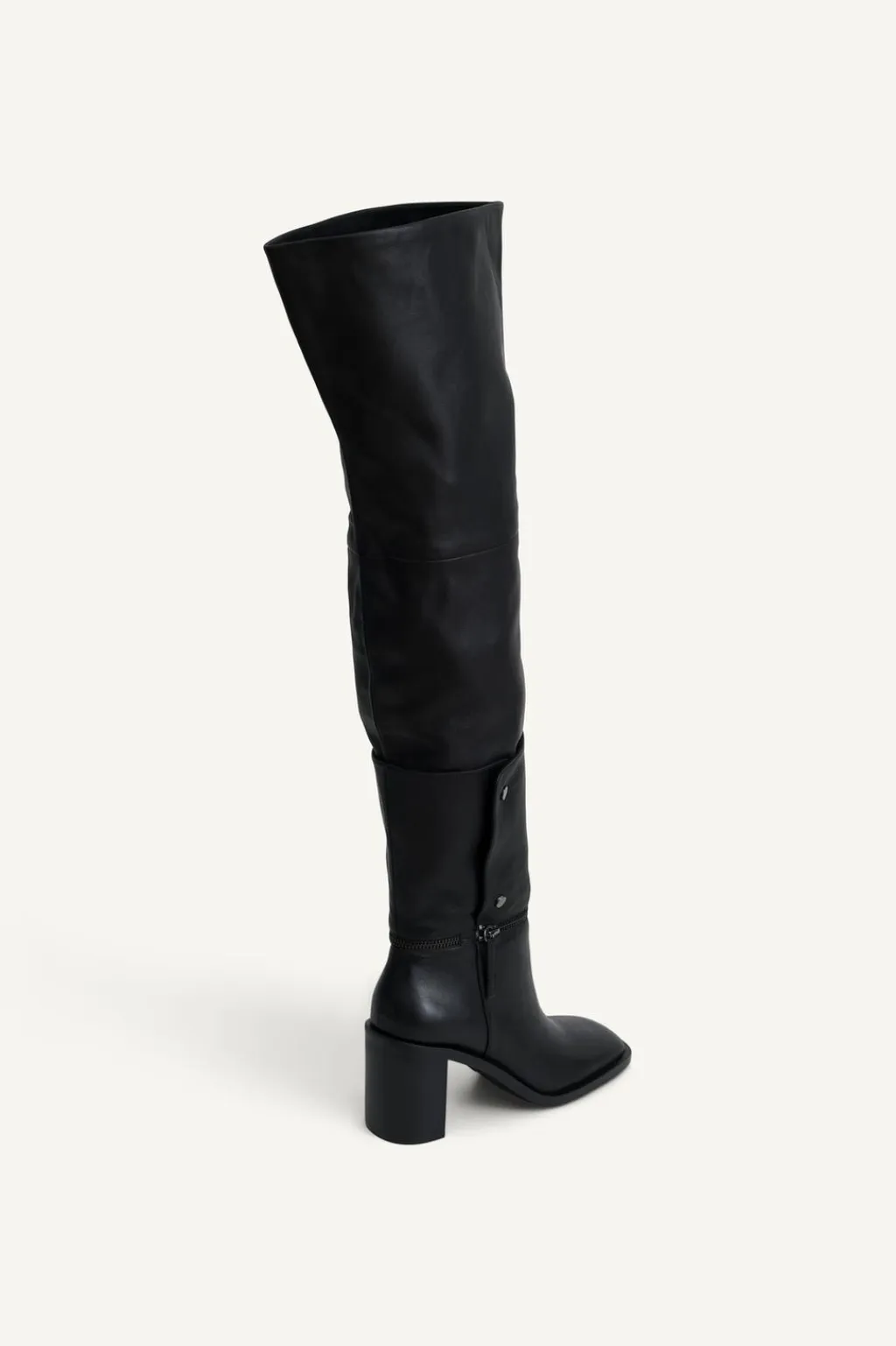 Zapato tipo bota multiposición en piel. Caña alta desmontable mediante botón. Tacón ancho. Detalle de cremallera en la caña. Acabada en punta cuadrada.