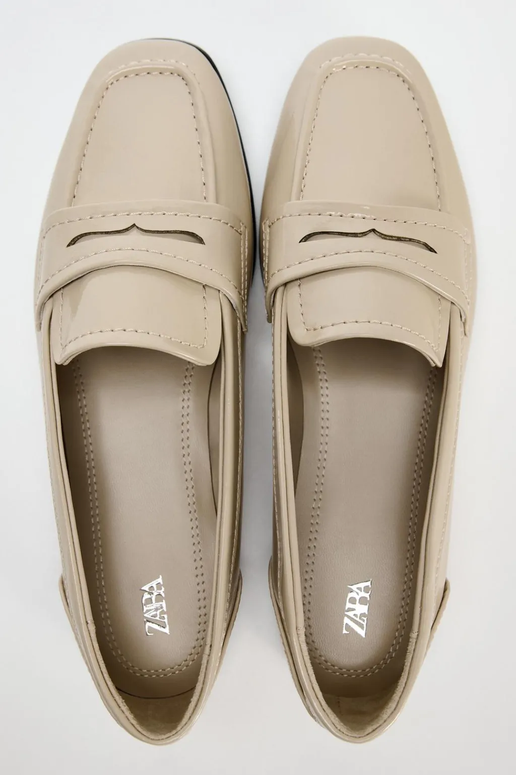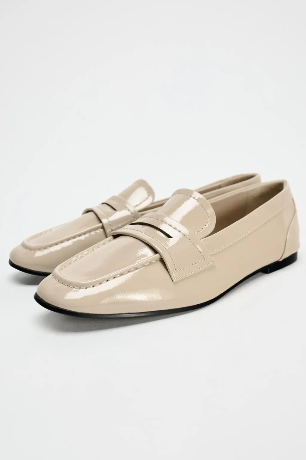 Zapato plano tipo mocasín en efecto acharolado. Copete subido y antifaz. Acabado en punta redonda.