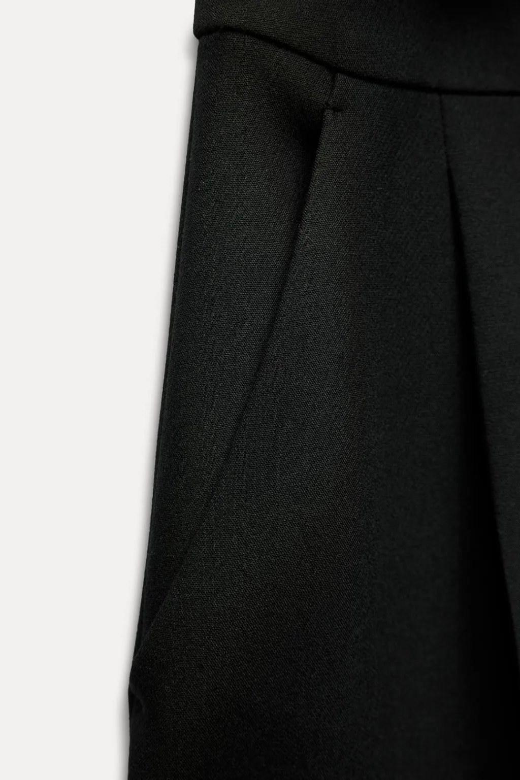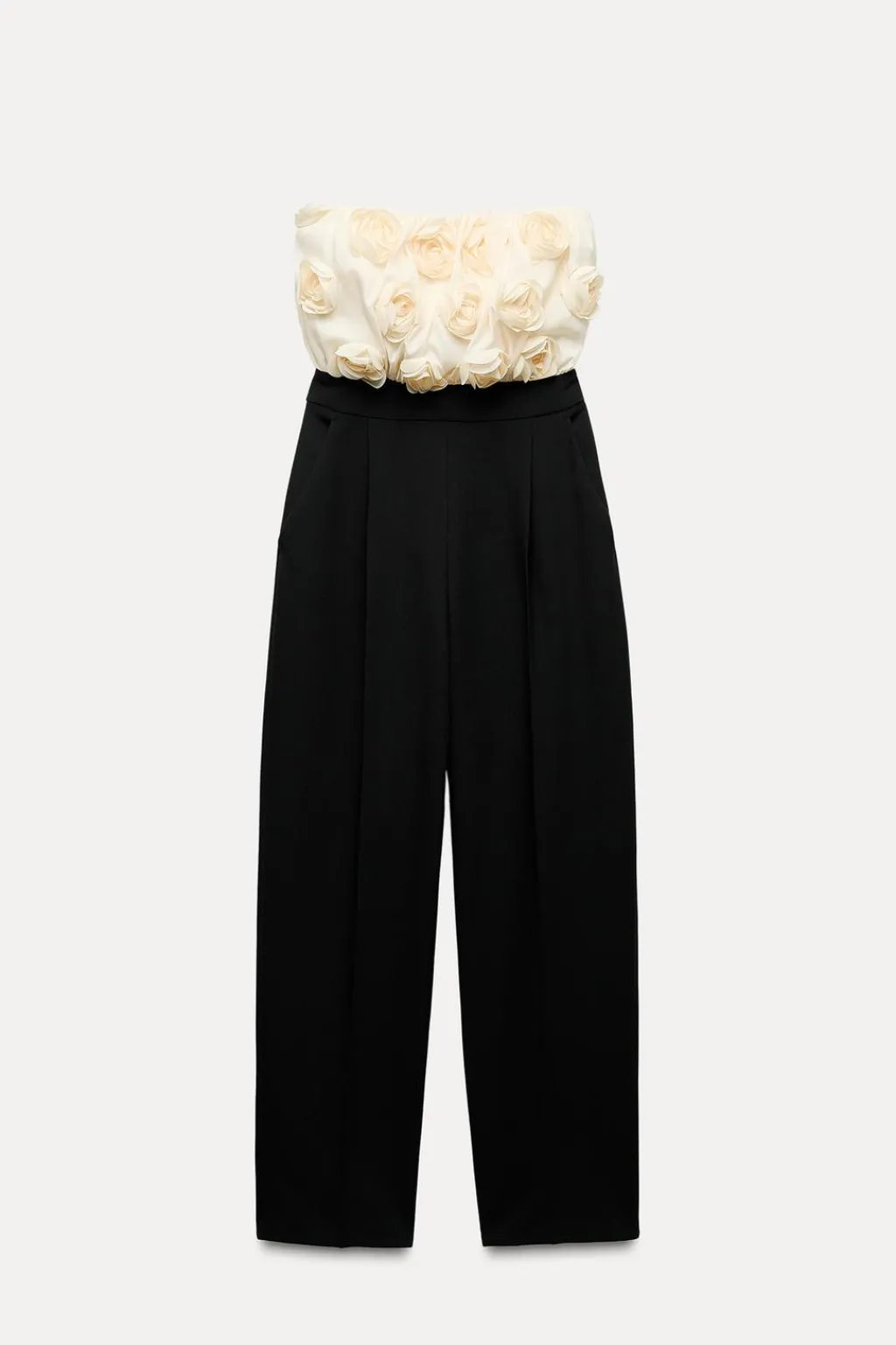 Mono de escote recto y hombros descubiertos. Pinzas delanteras. Bolsillos frontales y falso bolsillo de vivo en espalda. Detalle de tejido combinado en estructura en forma de flor y abertura en espalda. Pernera recta. Cierre lateral con cremallera oculta en costura.