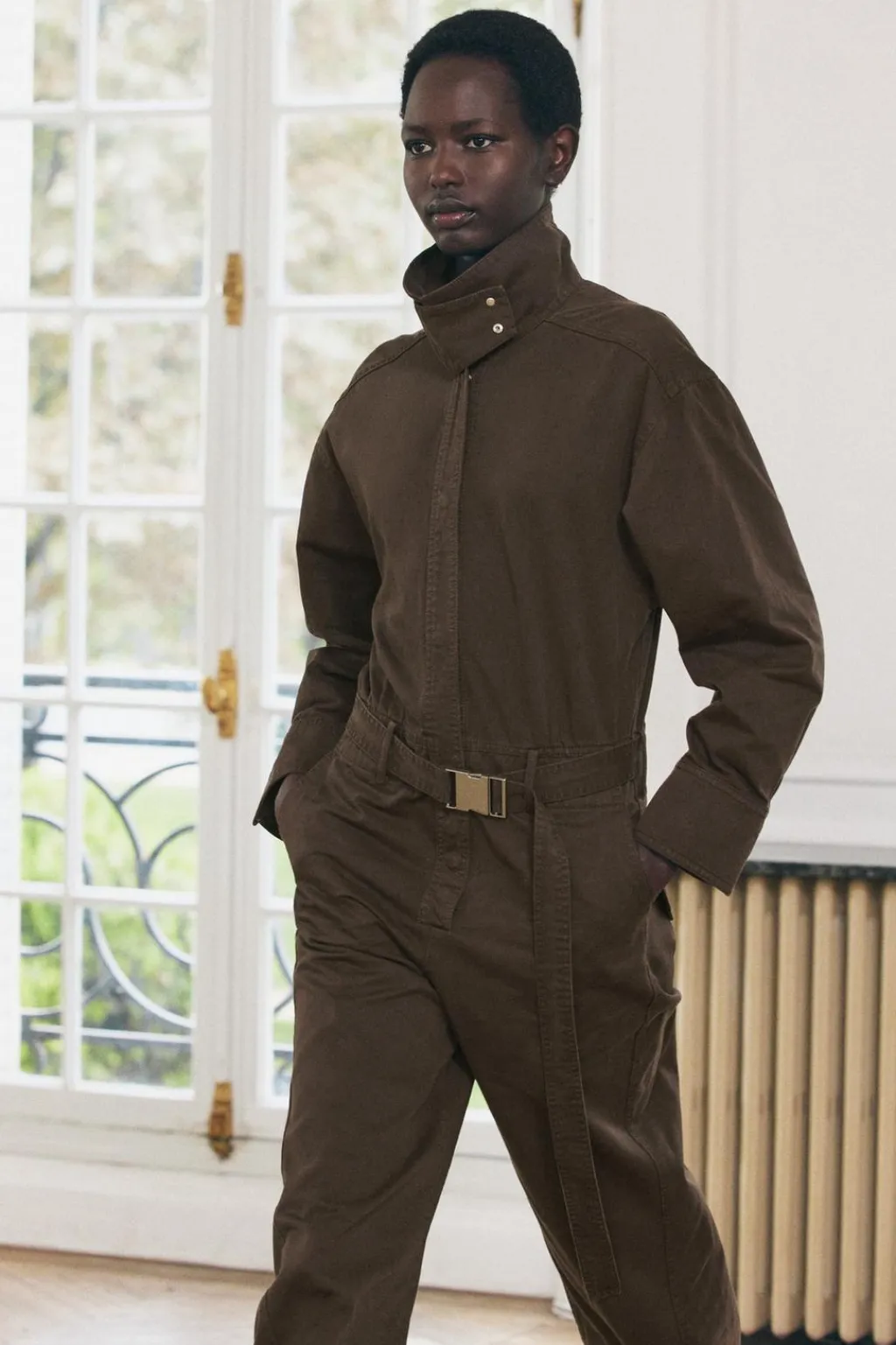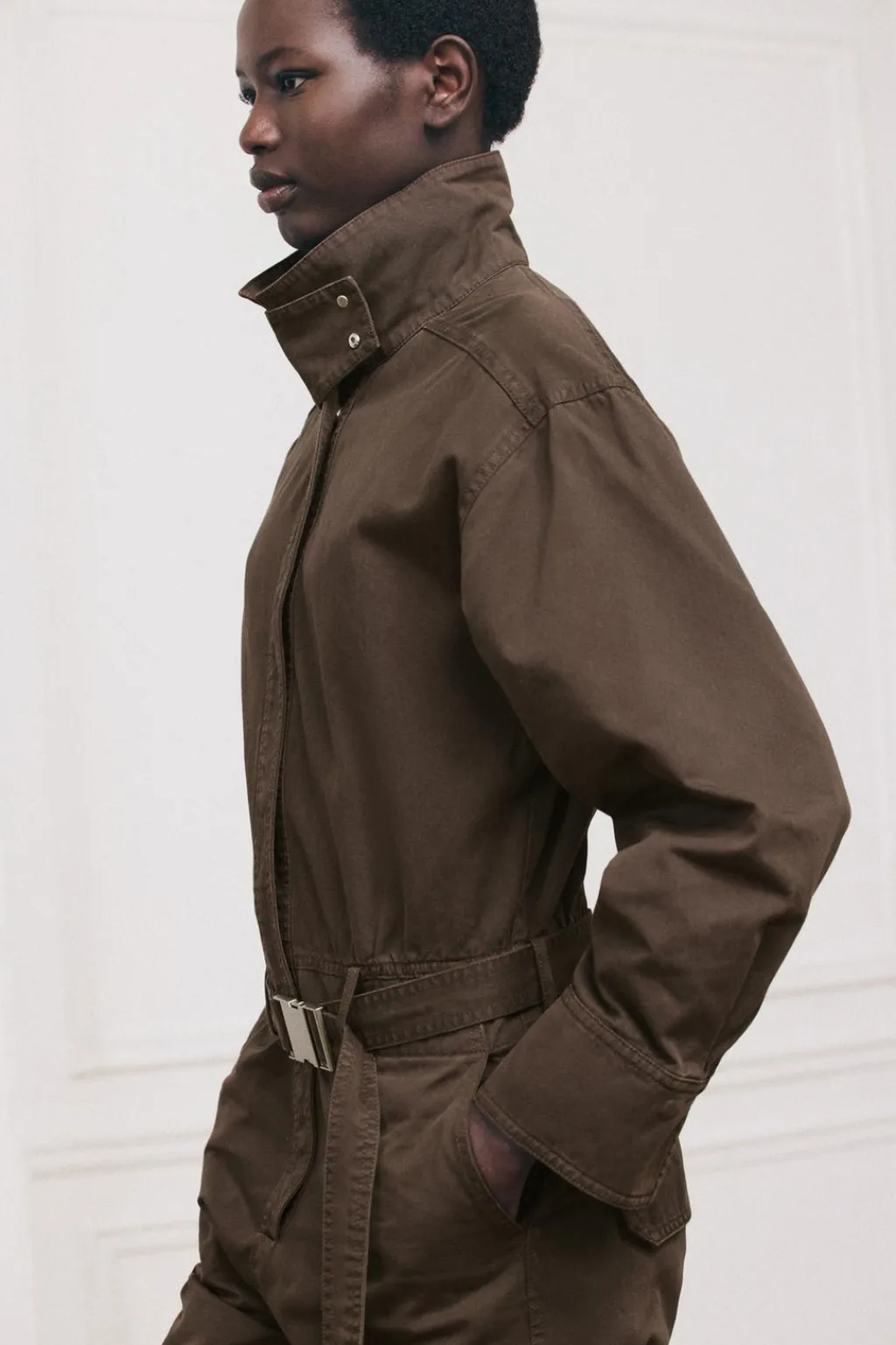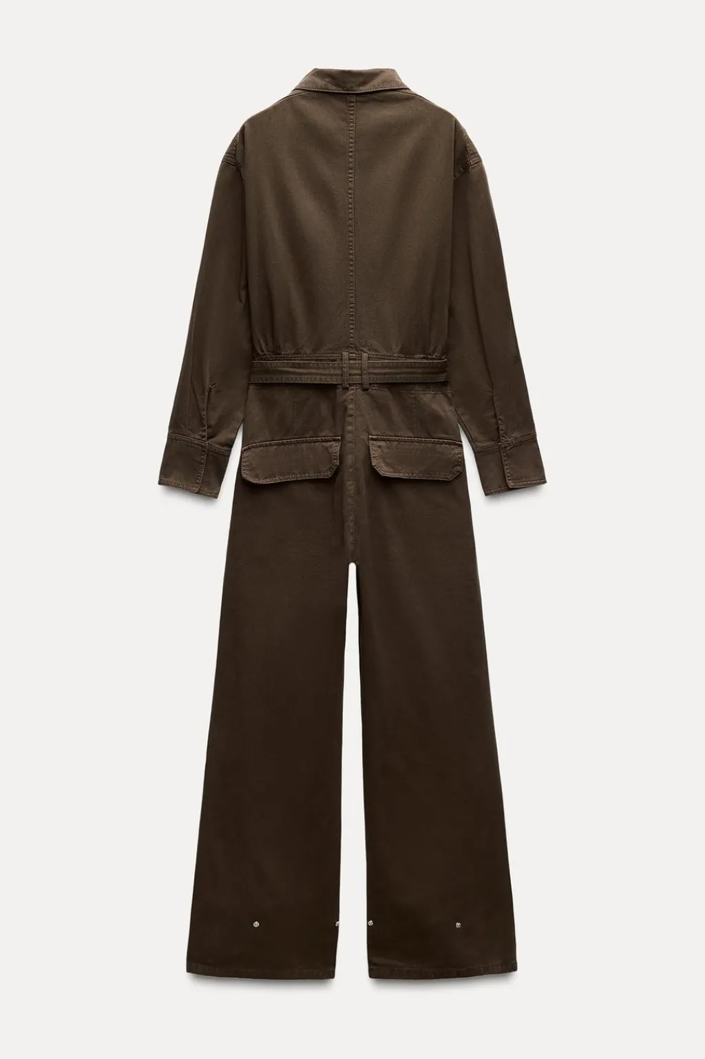 Mono largo confeccionado en hilatura de algodón 100%. Cuello alto y manga larga acabada en puño. Bolsillos delanteros. Cinturón en mismo tejido con hebilla metálica. Pierna ancha con trabilla y botón. Cierre frontal con botones ocultos por solapa.