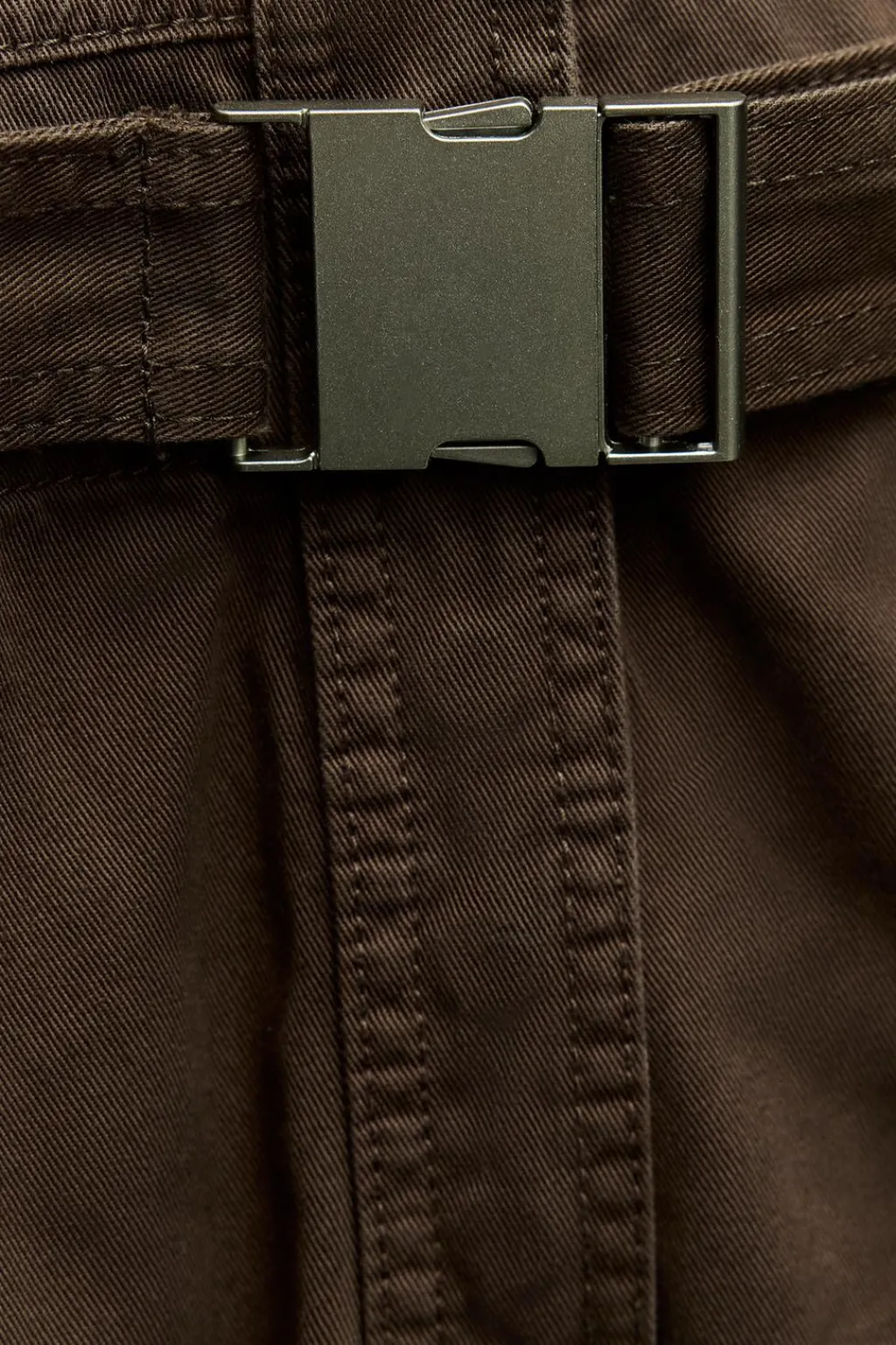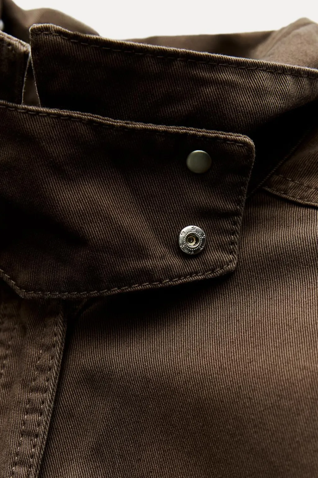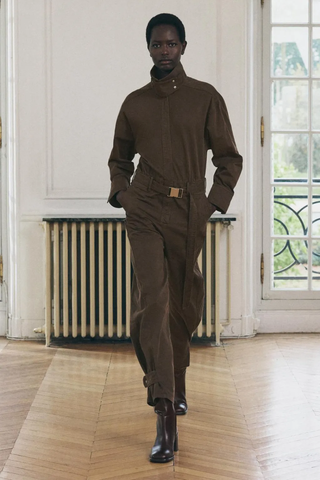 Mono largo confeccionado en hilatura de algodón 100%. Cuello alto y manga larga acabada en puño. Bolsillos delanteros. Cinturón en mismo tejido con hebilla metálica. Pierna ancha con trabilla y botón. Cierre frontal con botones ocultos por solapa.