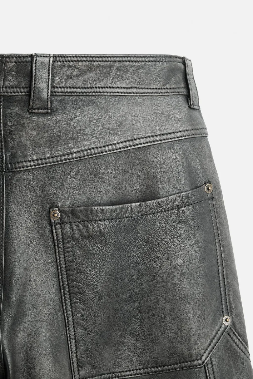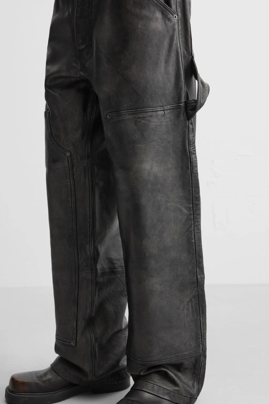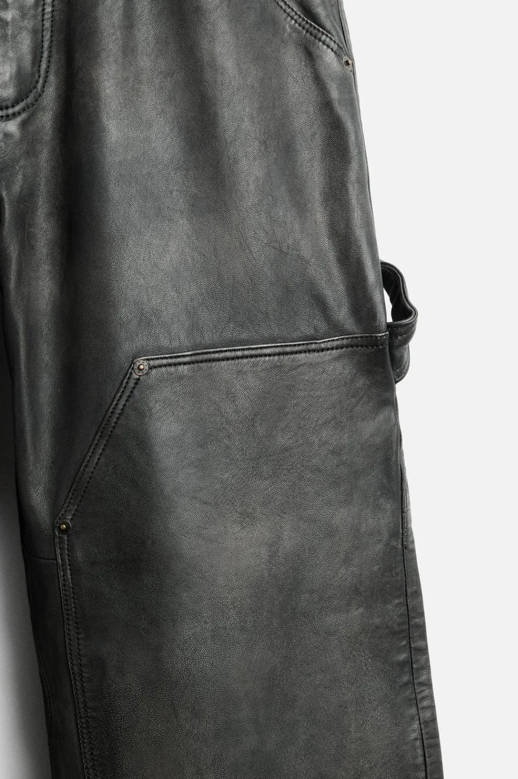 Pantalón relaxed fit confeccionado en piel con efecto lavado. Bolsillos frontales y detalle de bolsillos traseros de plastrón. Aplicación de bolsillos plastrón y tira multifunción en perneras. Cierre frontal con cremallera y botón.
